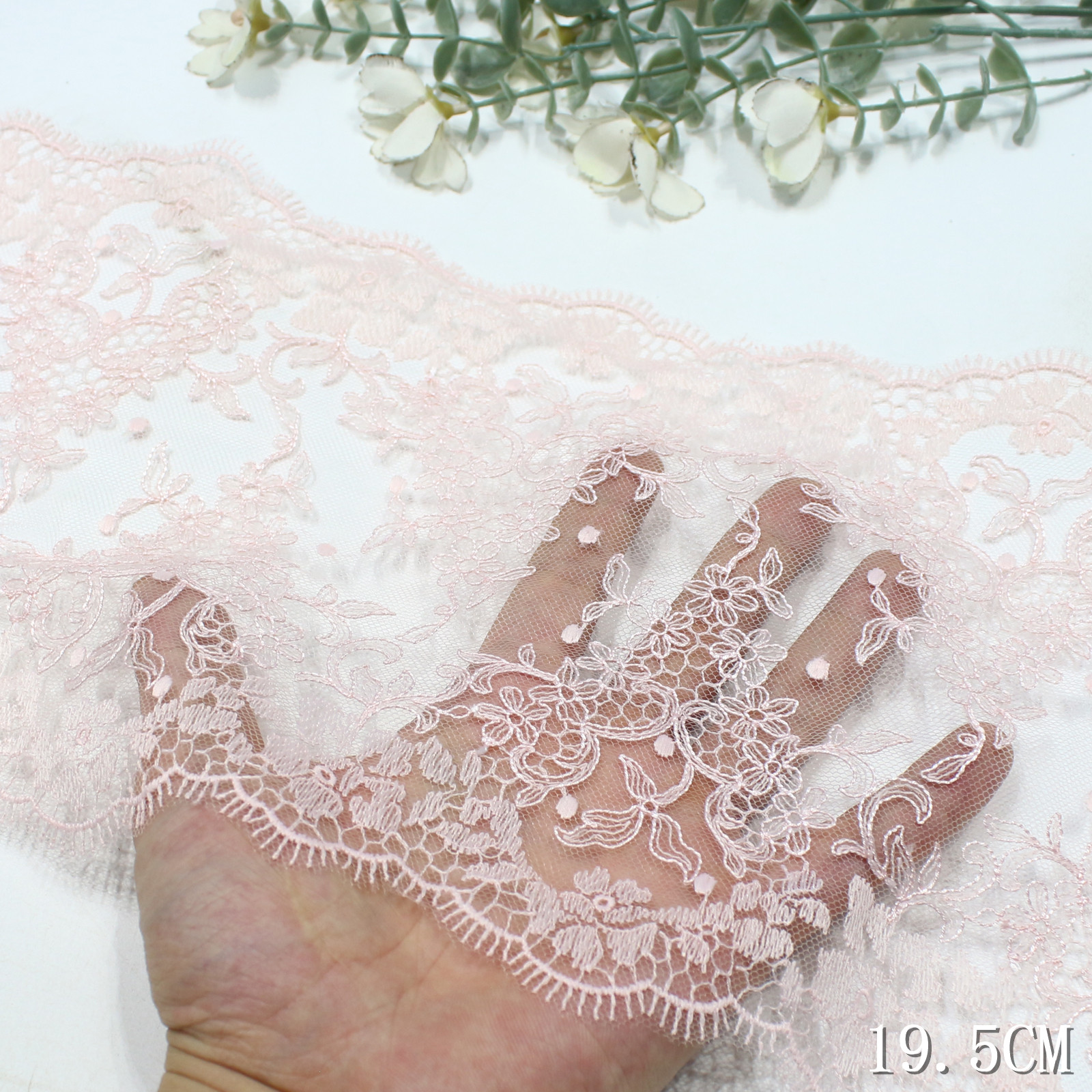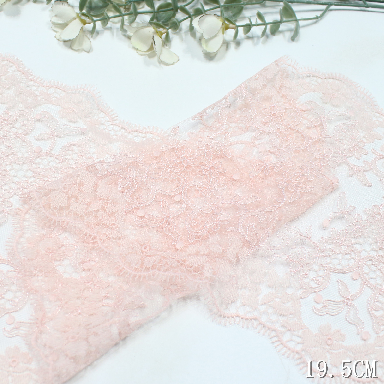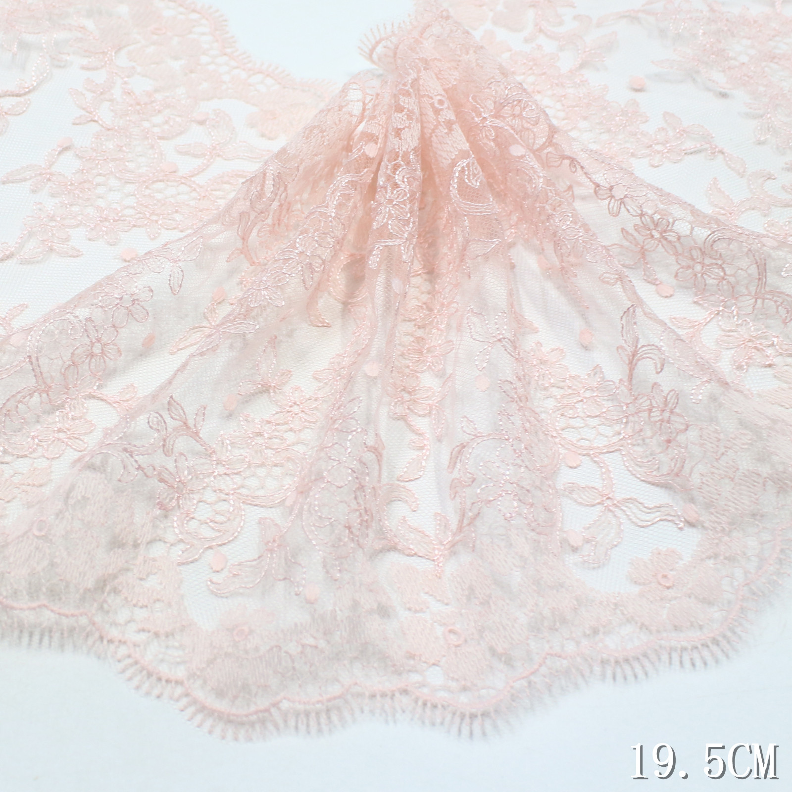 The edge is finished with an eyelash scalloped trim, giving the lace a light and airy outline with refined movement. The 19.5 cm width allows the pattern to extend fully, making it suitable for both statement and detailed applications.