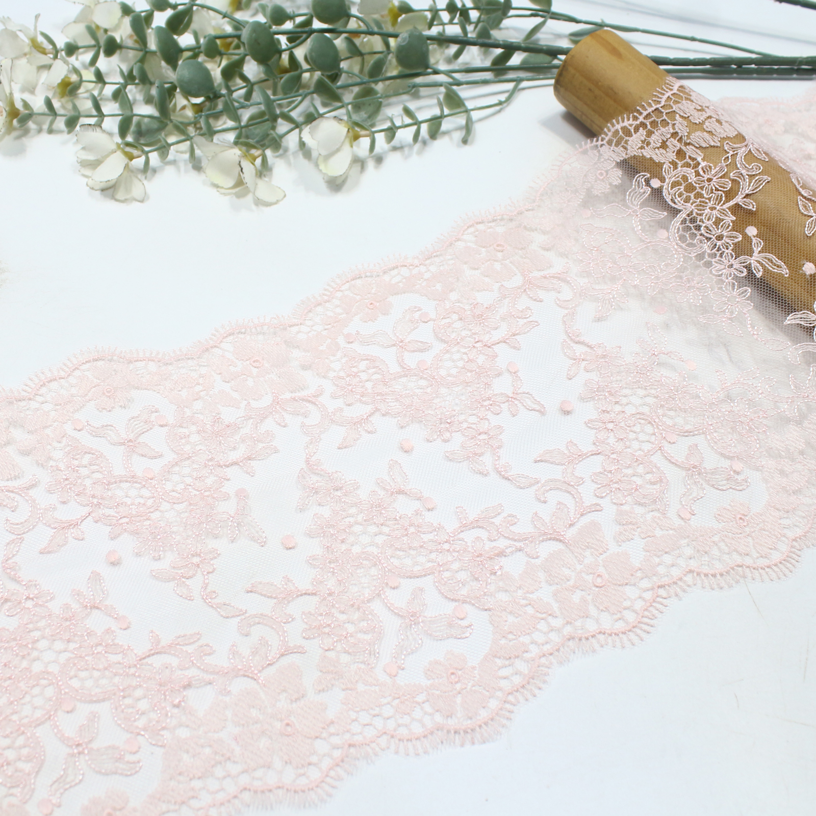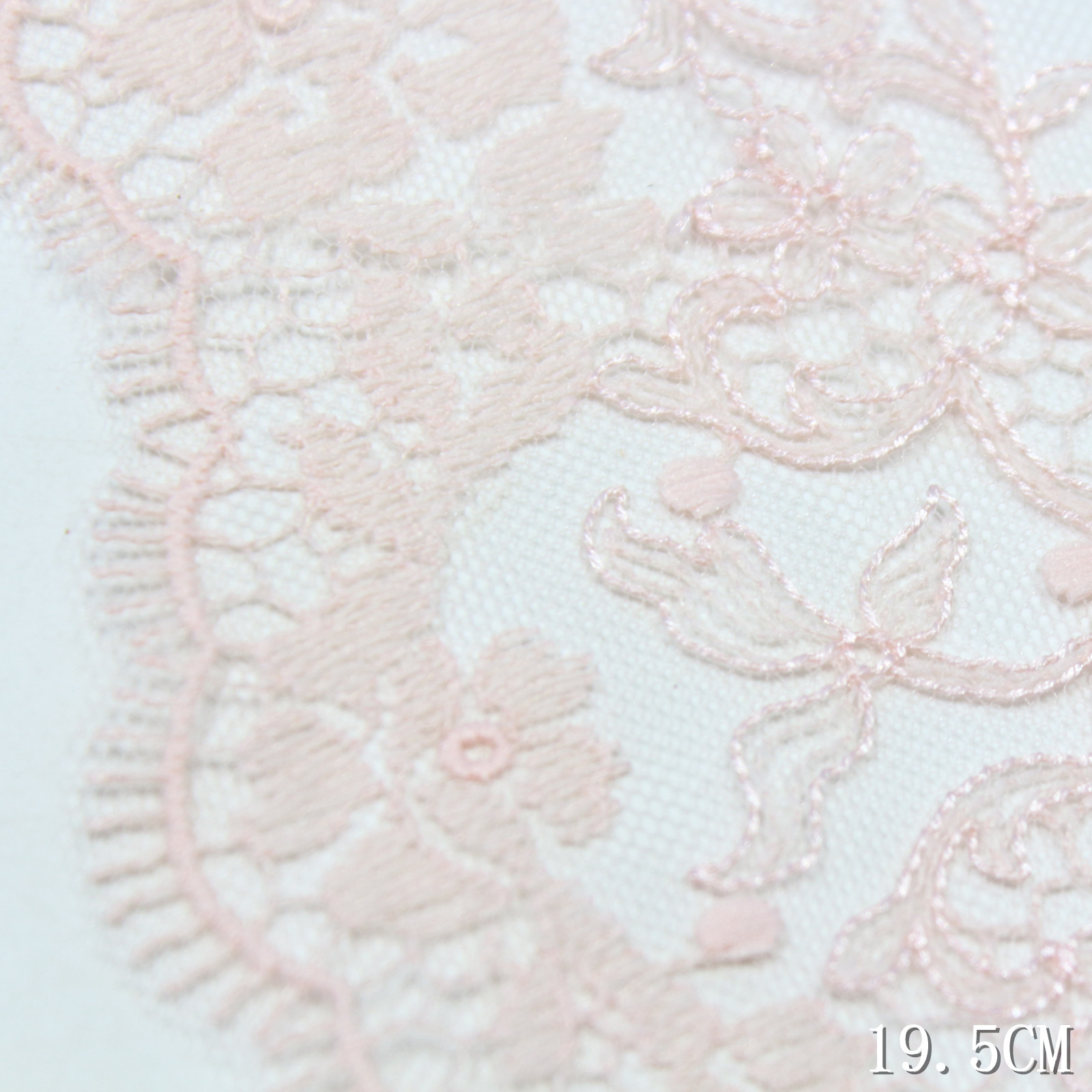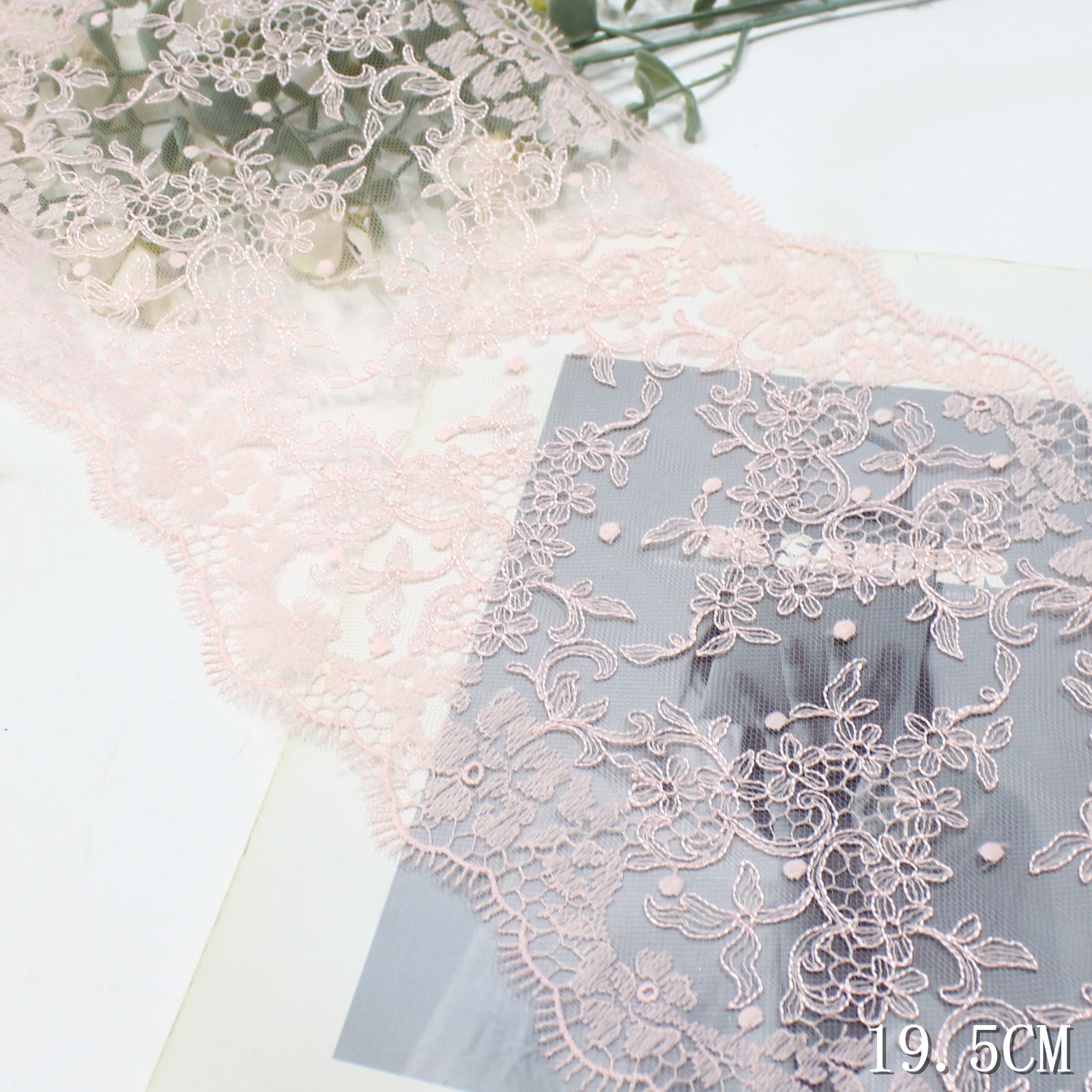 The edge is finished with an eyelash scalloped trim, giving the lace a light and airy outline with refined movement. The 19.5 cm width allows the pattern to extend fully, making it suitable for both statement and detailed applications.