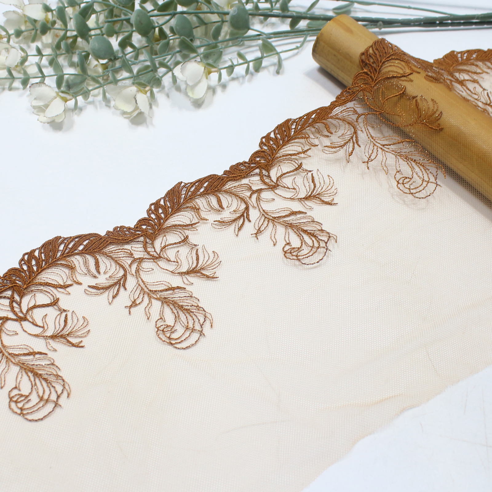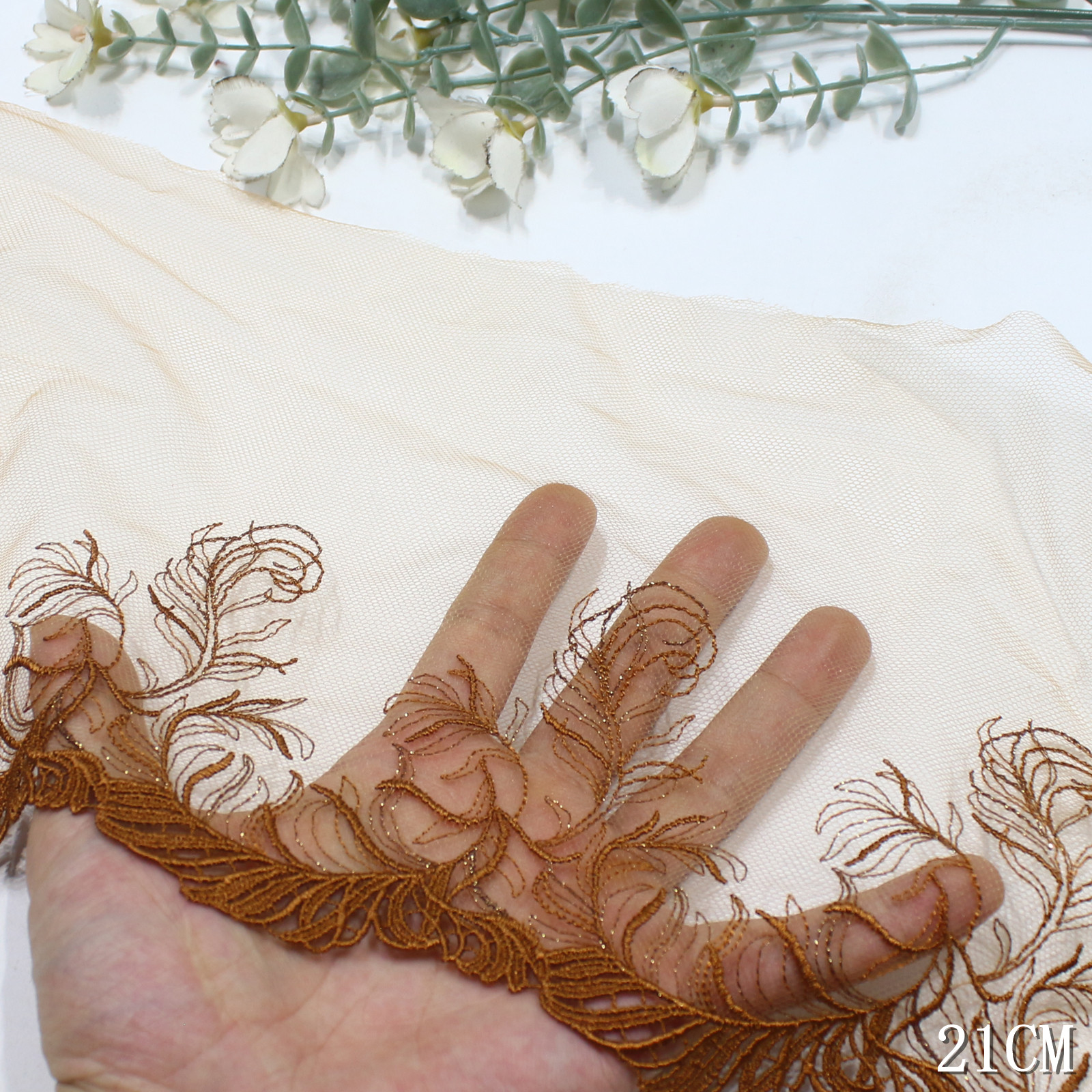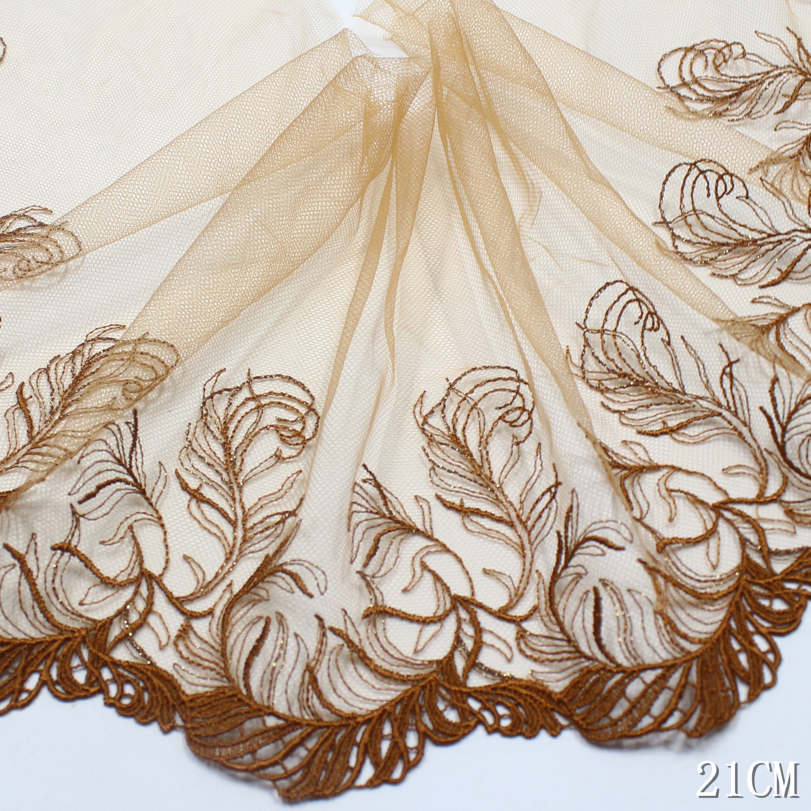 Set on a sheer mesh base, the lace appears transparent and breathable, allowing the feather motifs to stand out while keeping an elegant softness. The 21 cm width allows the pattern to extend naturally along the edge, giving a full and balanced visual presentation.