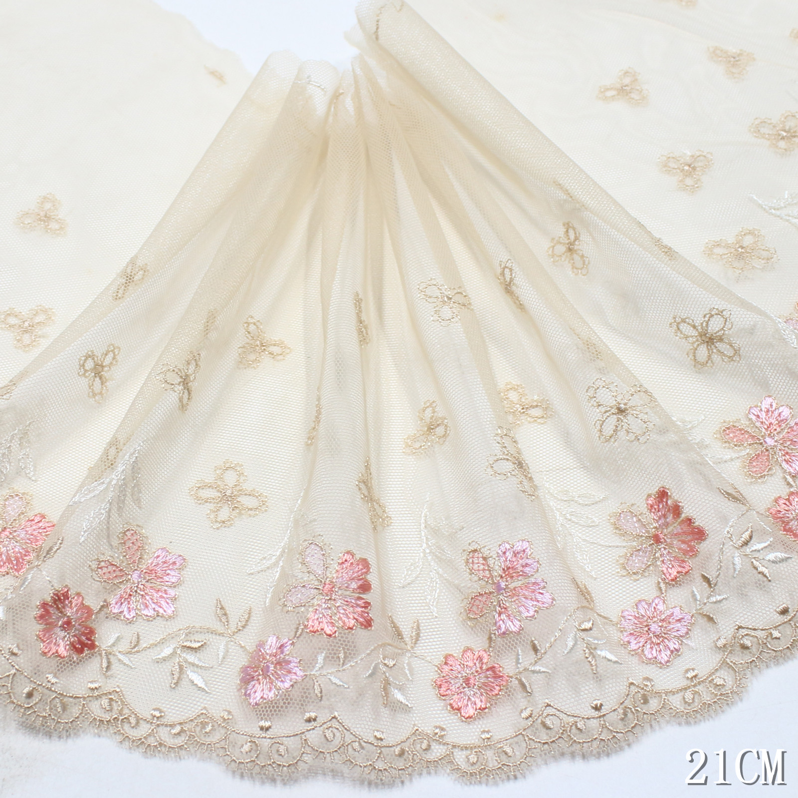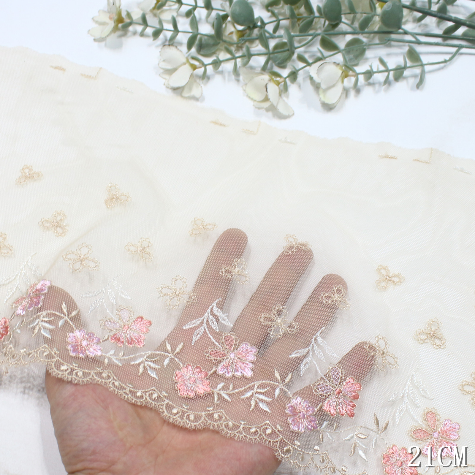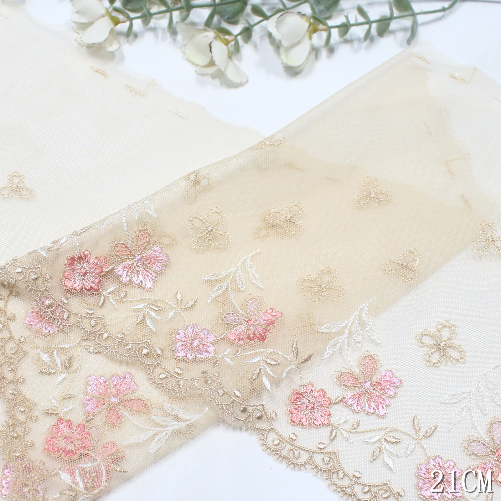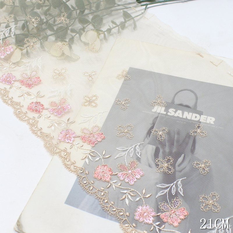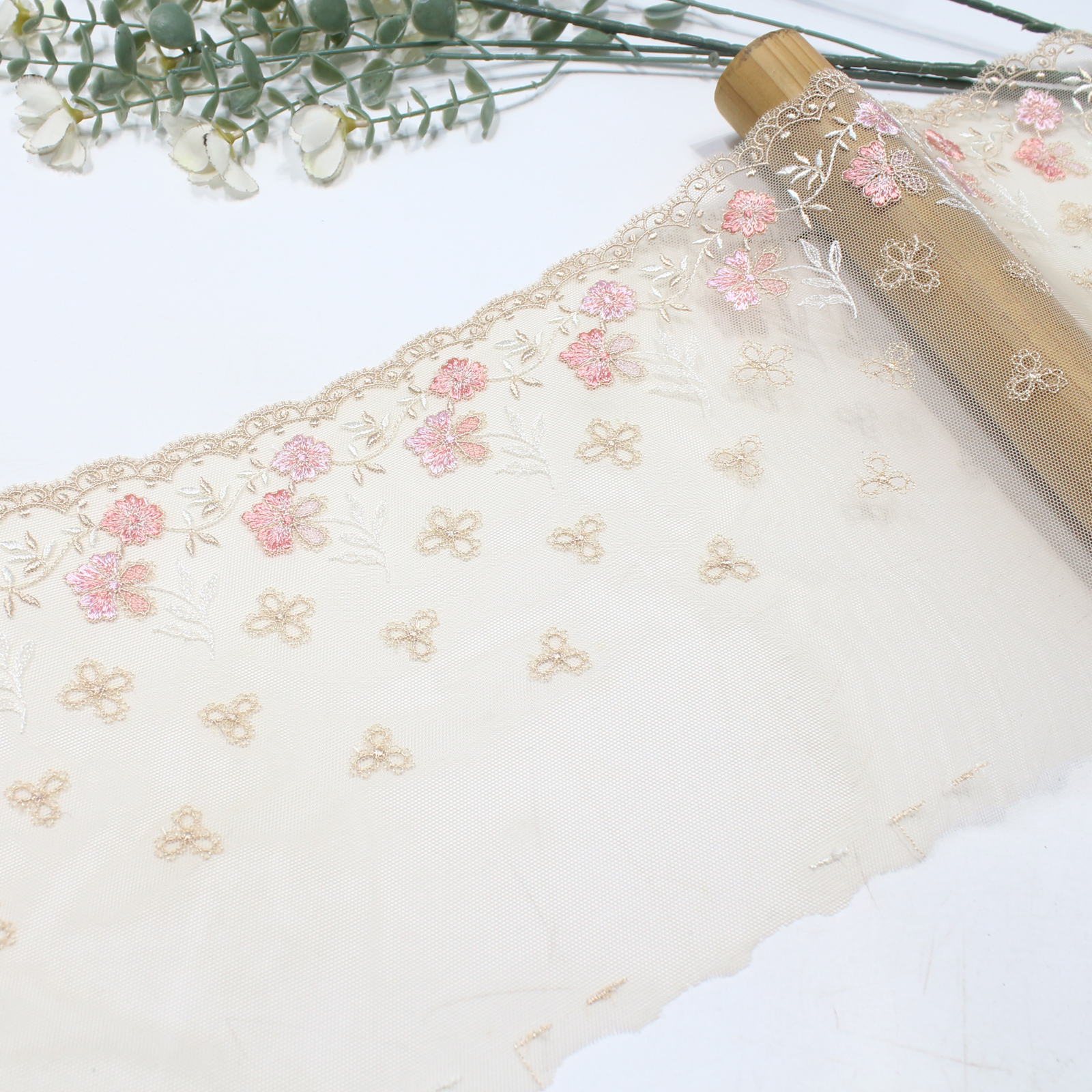 This lace trim is crafted on a sheer nude tulle base, offering a soft and natural tone that enhances the delicacy of the embroidery.