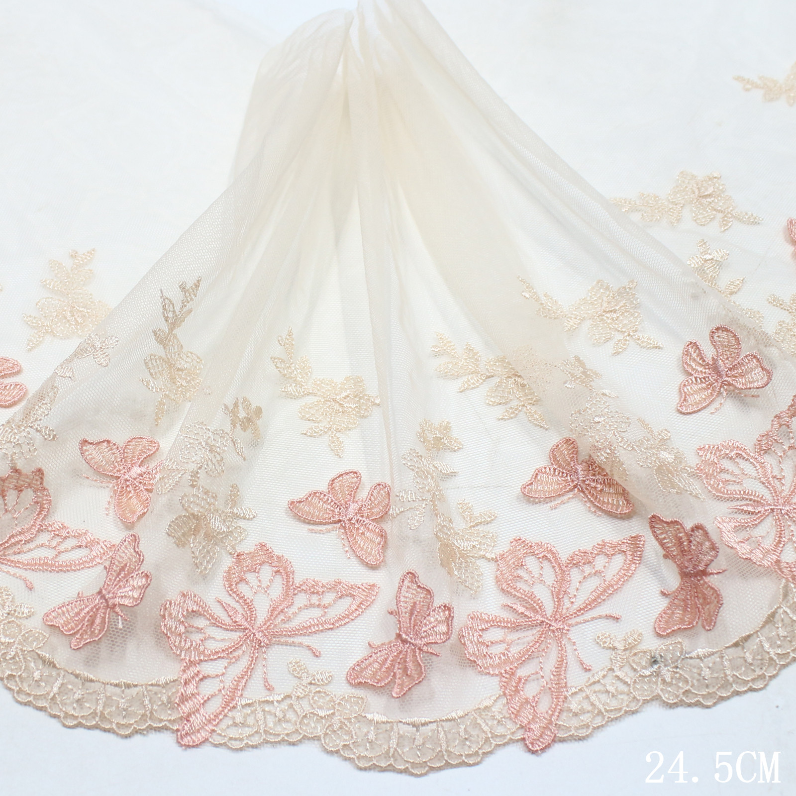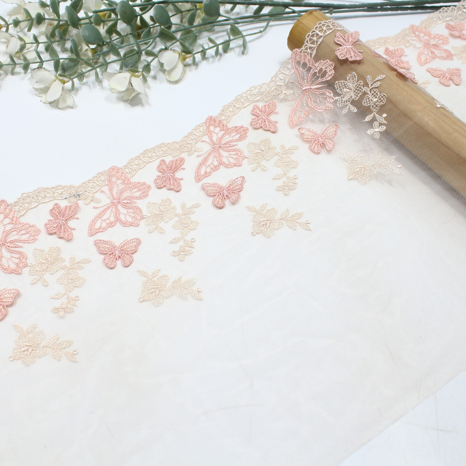 Elegant lace trim featuring 3D butterfly and floral embroidery in soft dual tones on a sheer beige tulle base. Light, romantic, and delicately dimensional.
