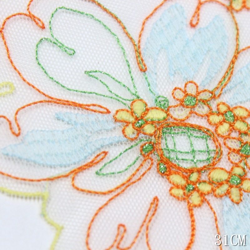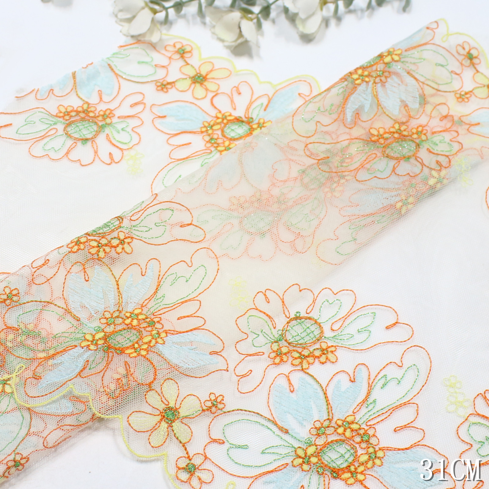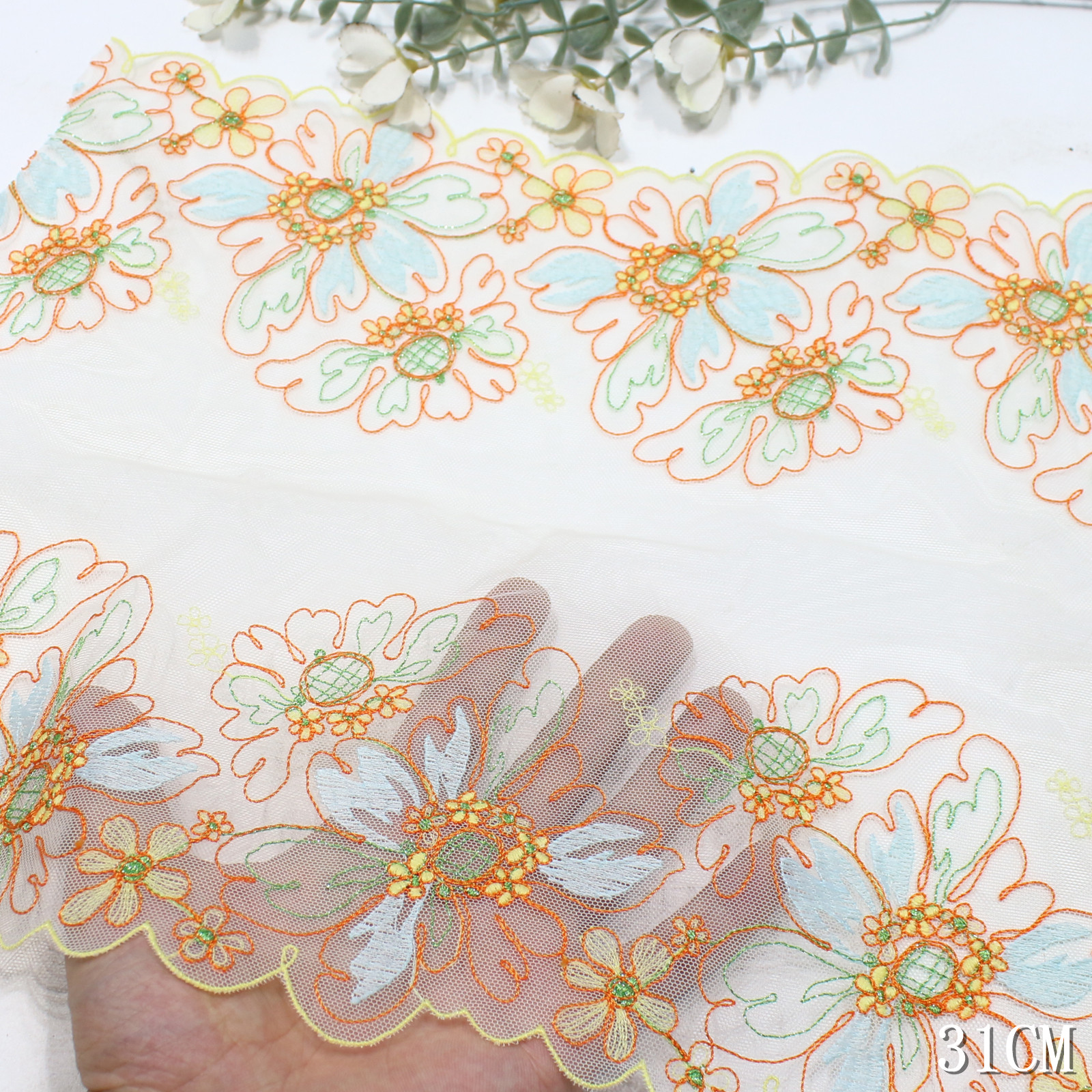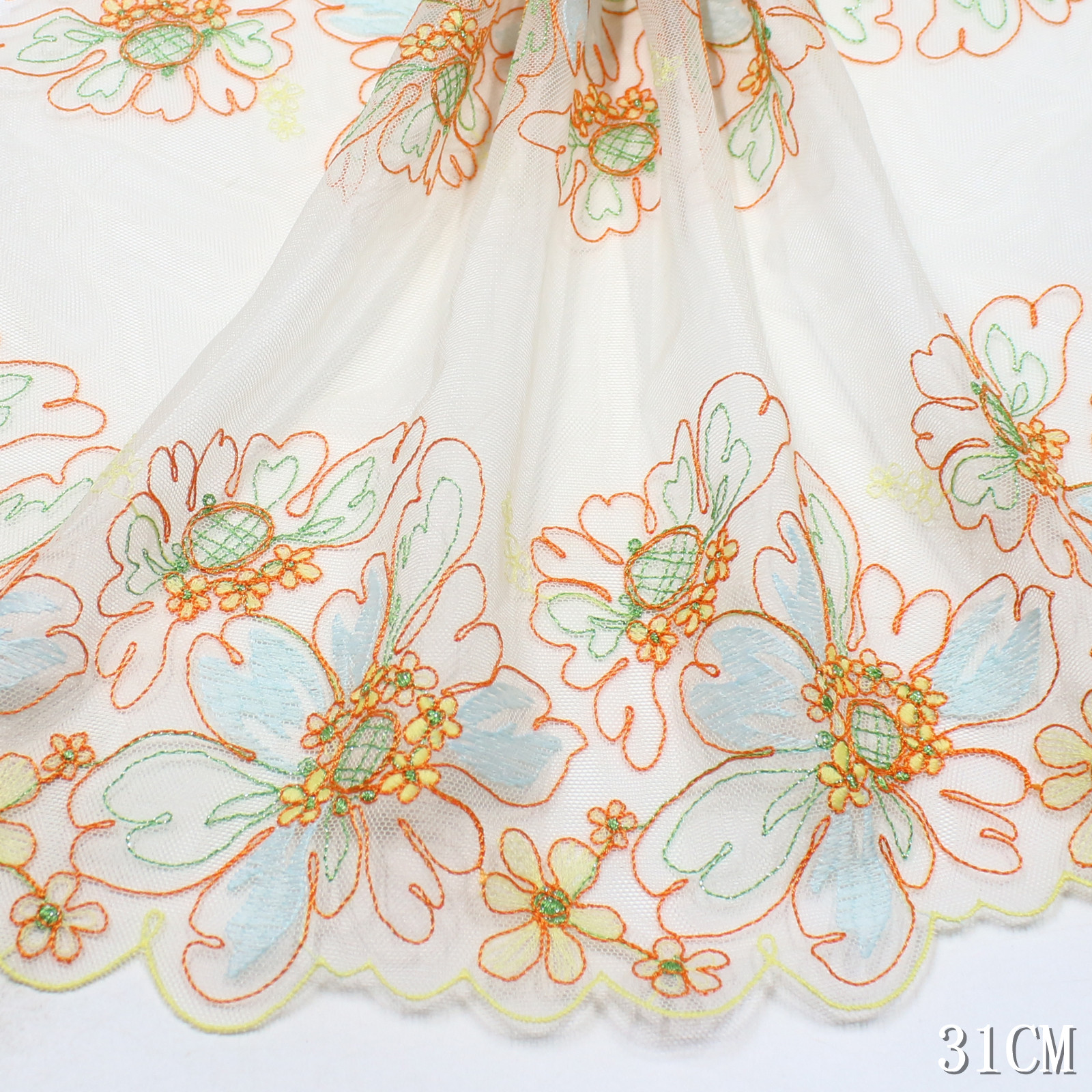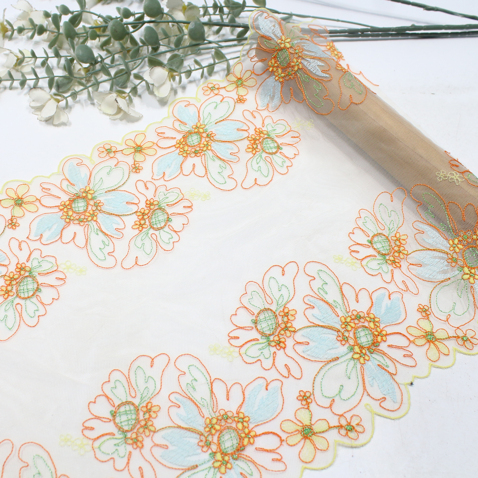 The edge is finished with a yellow scalloped trim, complementing the color palette and adding a refined decorative detail. The embroidery is slightly raised, giving the lace a dimensional texture, while the sheer mesh base ensures breathability and a soft drape.
