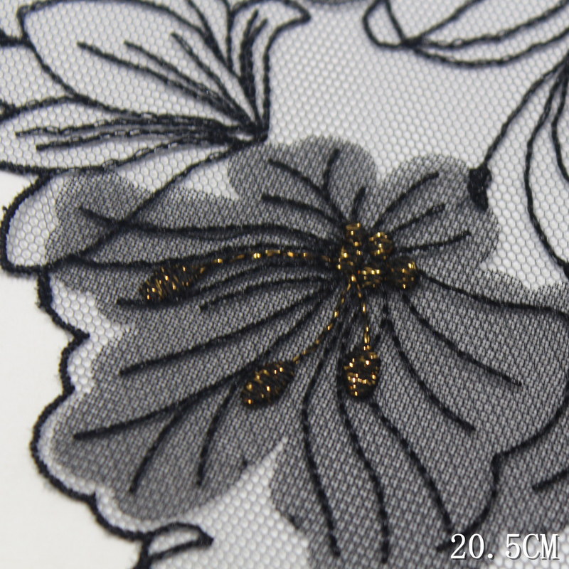 The black appliqué petals contrast subtly against the sheer dark grey mesh, creating a balanced interplay of light and shadow. The dense edge stitching enhances durability while adding a clean and refined outline to each floral shape.
