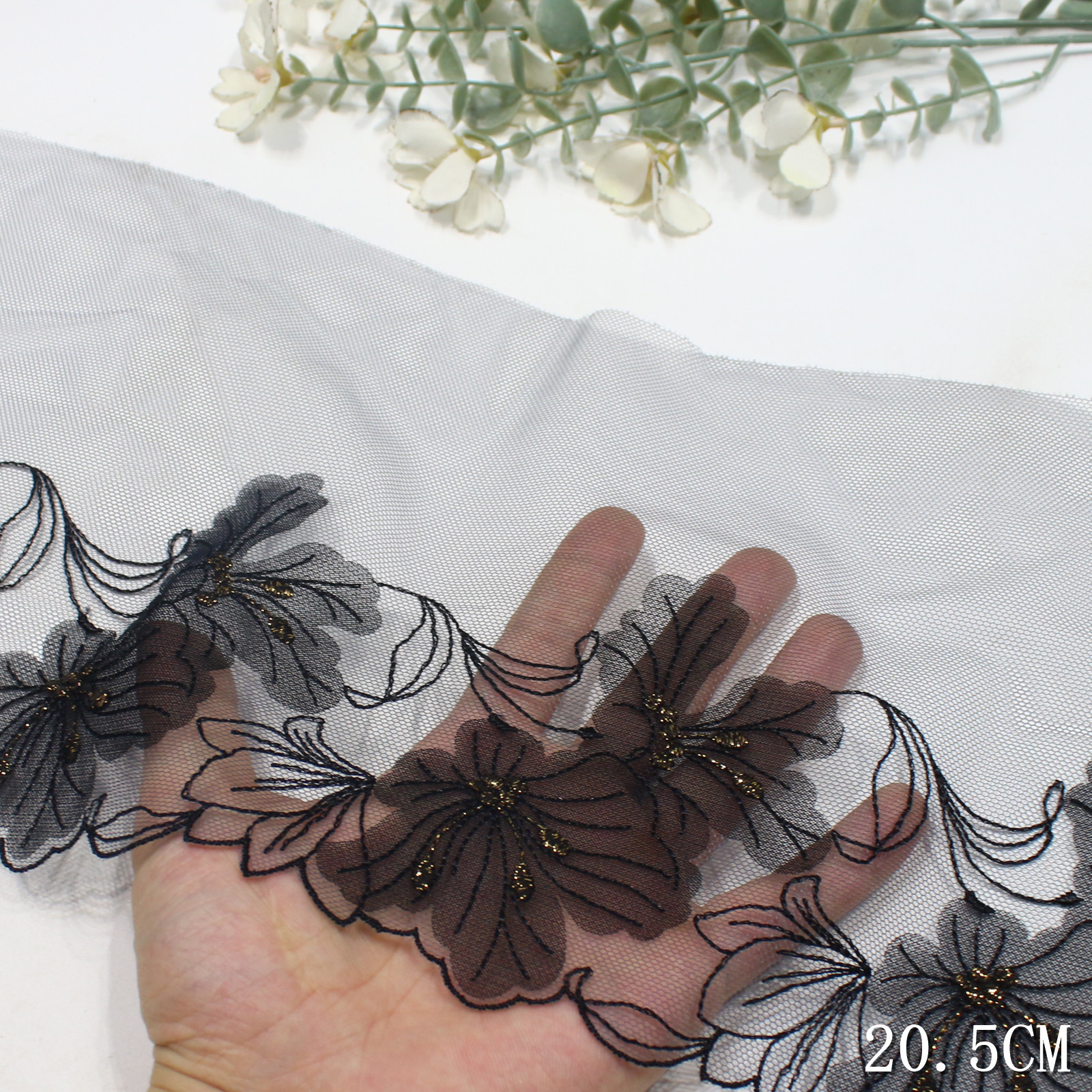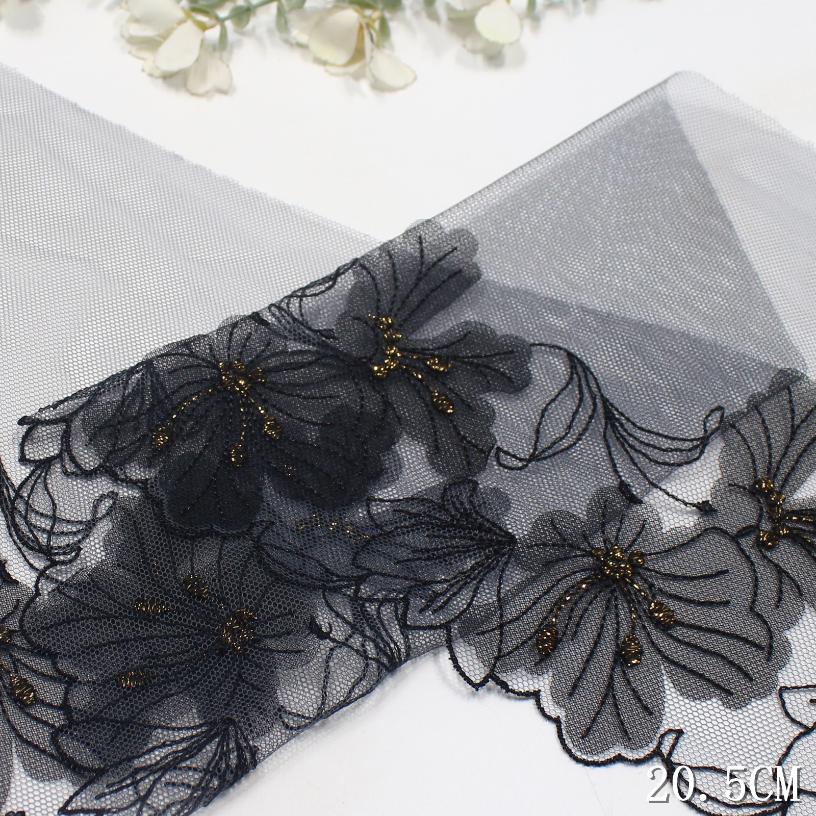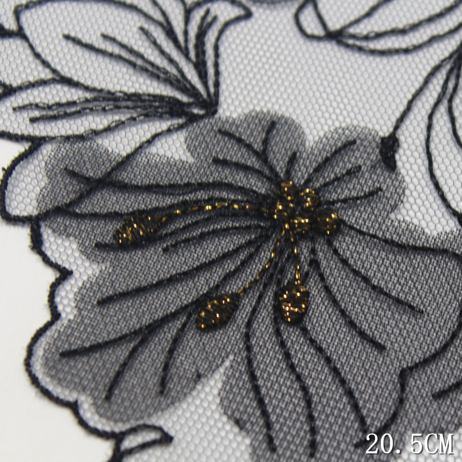 Set on a transparent tulle base, the lace remains lightweight and breathable, while the appliqué elements add body and texture. The 20.5 cm width allows the pattern to spread naturally, giving a composed and modern layout.