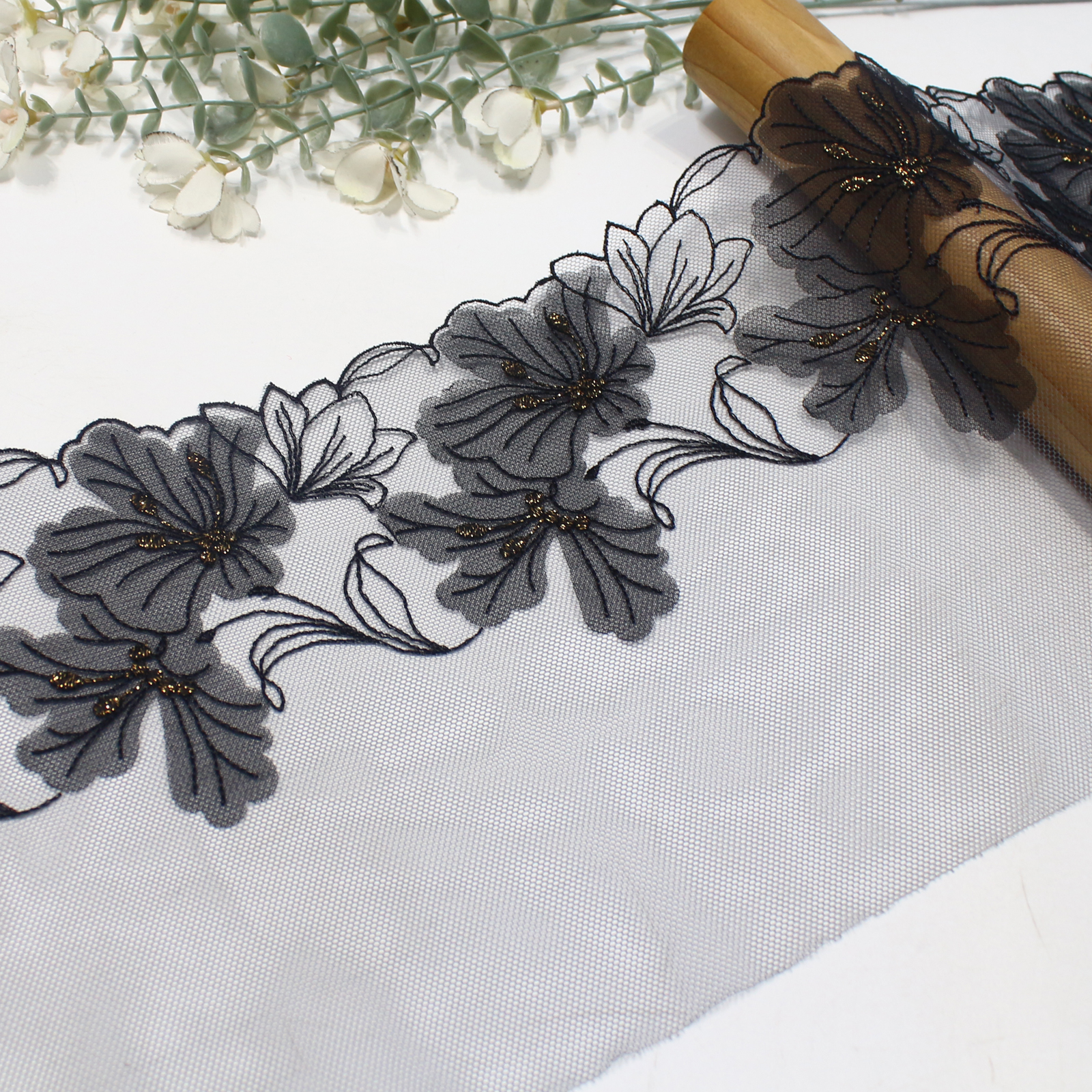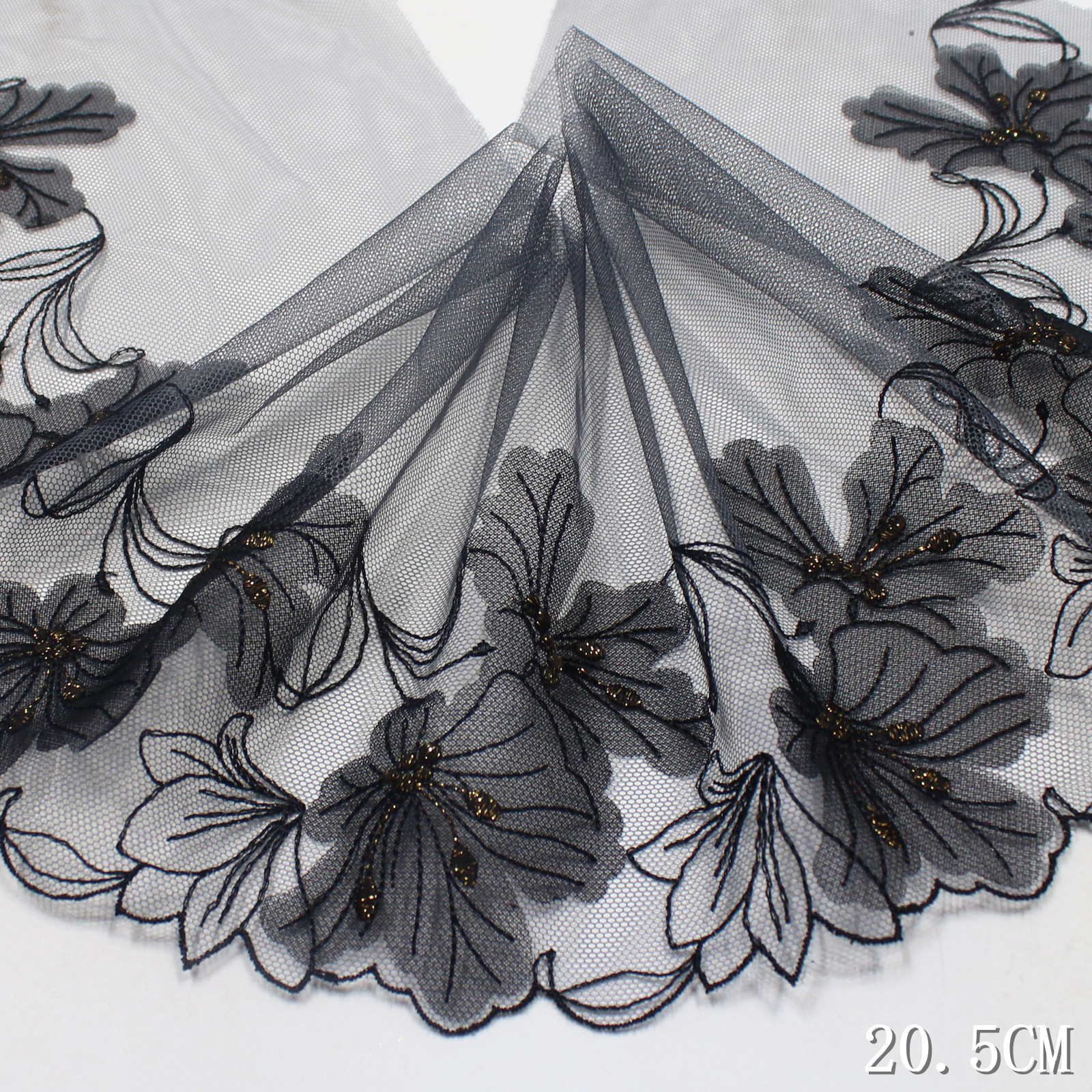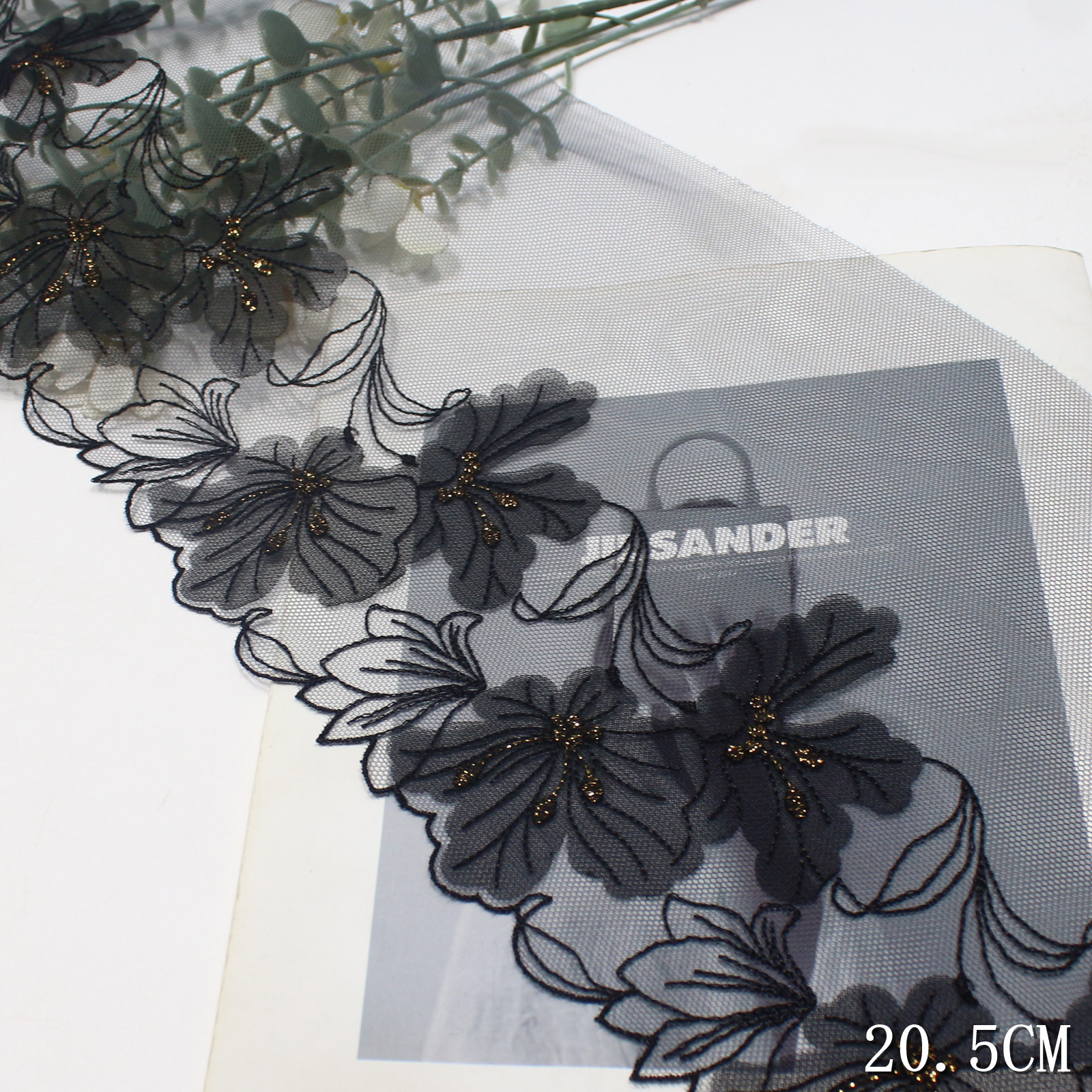 Set on a transparent tulle base, the lace remains lightweight and breathable, while the appliqué elements add body and texture. The 20.5 cm width allows the pattern to spread naturally, giving a composed and modern layout.