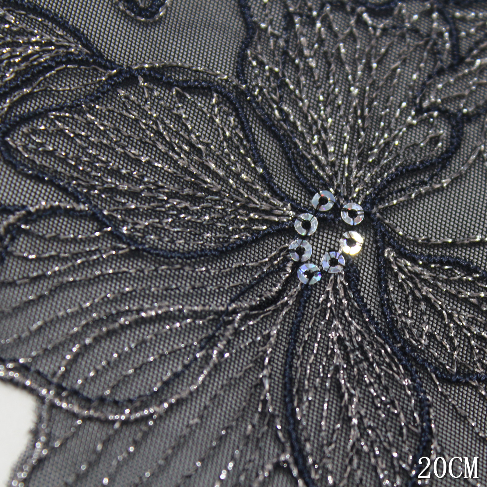 Elegant embroidered lace trim featuring large floral motifs crafted with silver metallic threads and iridescent sequins on a sheer black tulle base. Designed for a refined shimmer and high-end decorative effect.