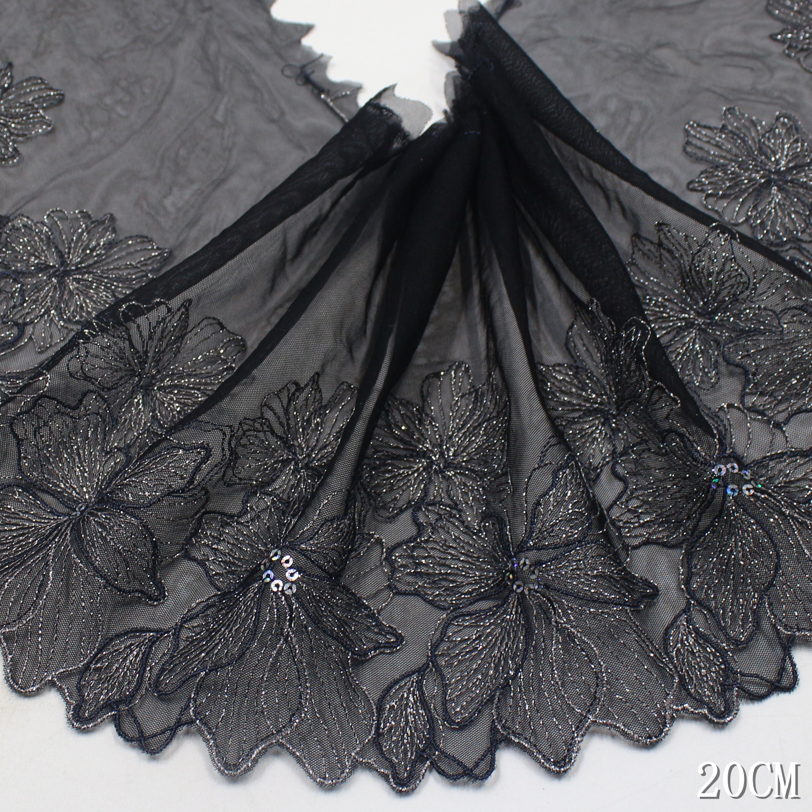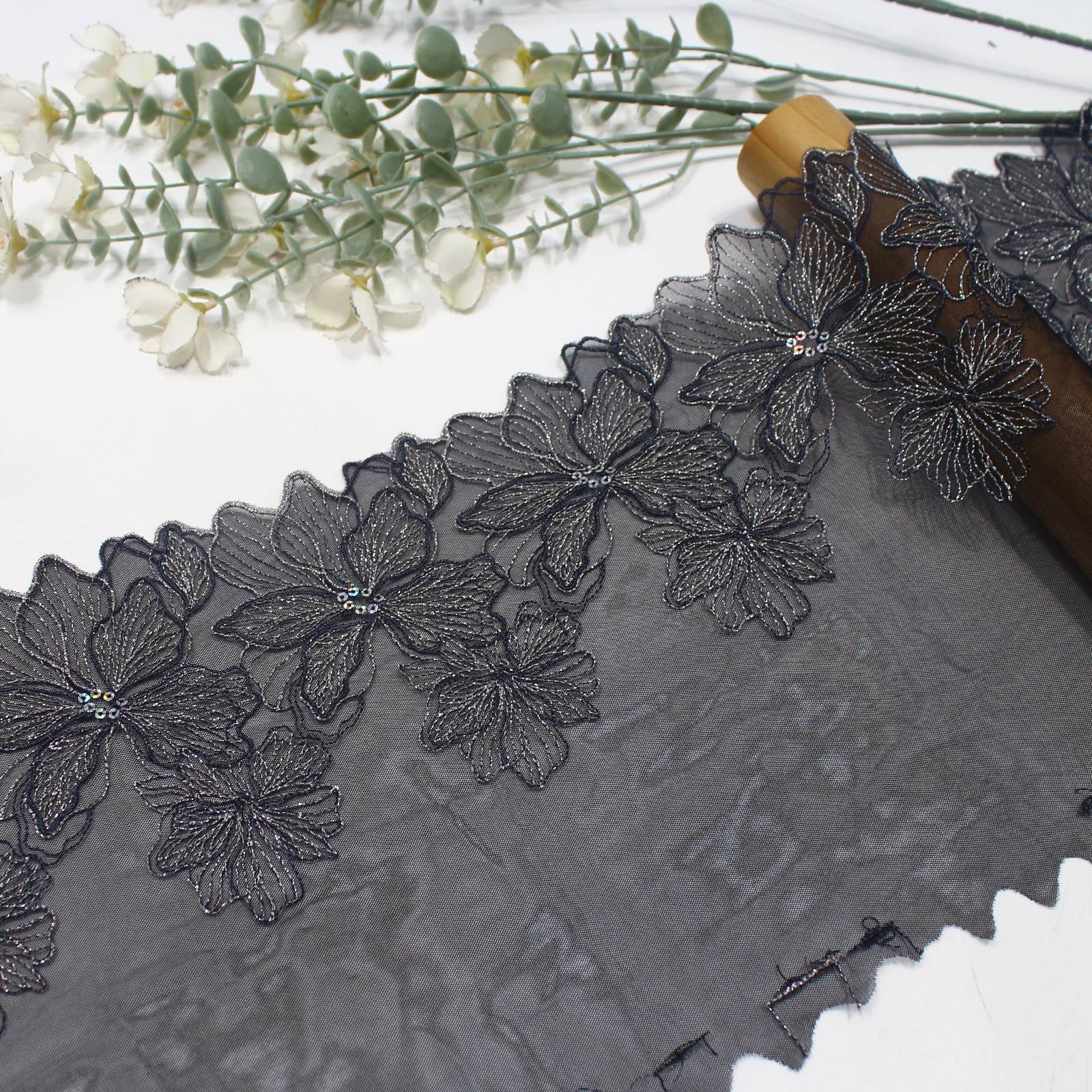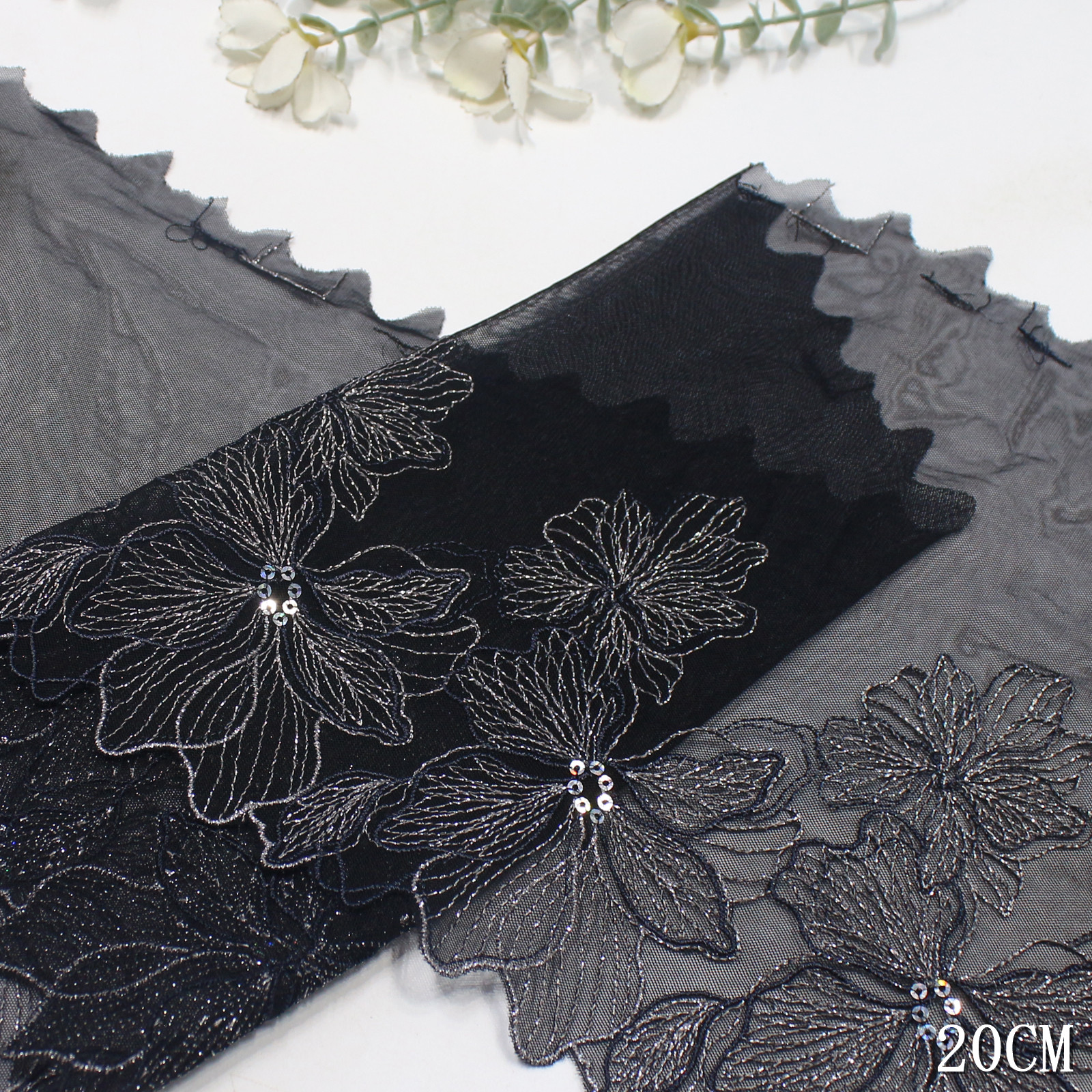 Set on a sheer black tulle base, the lace appears light and airy while maintaining a strong visual presence. The 20 cm width allows the floral motifs to spread naturally, creating a balanced and elegant composition.