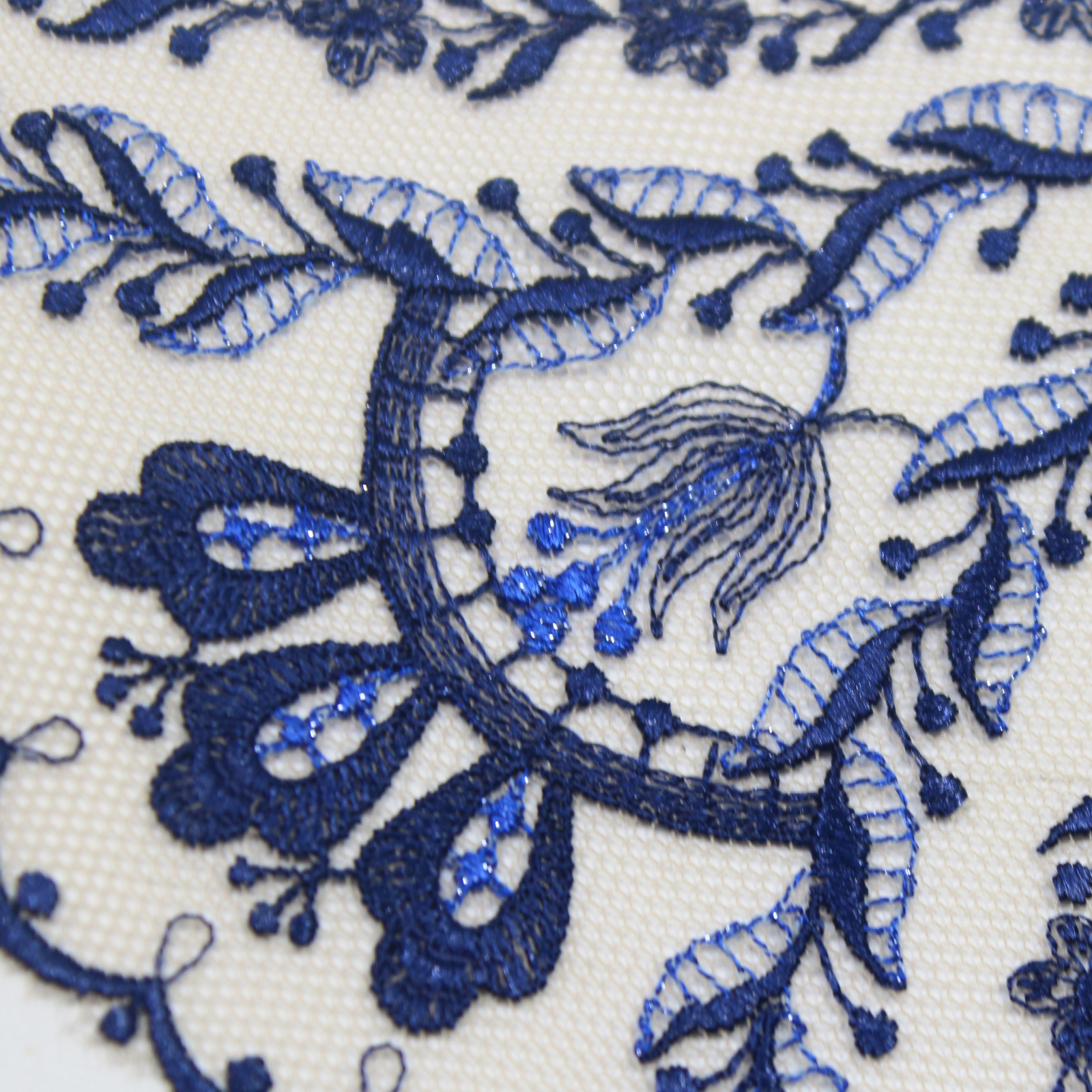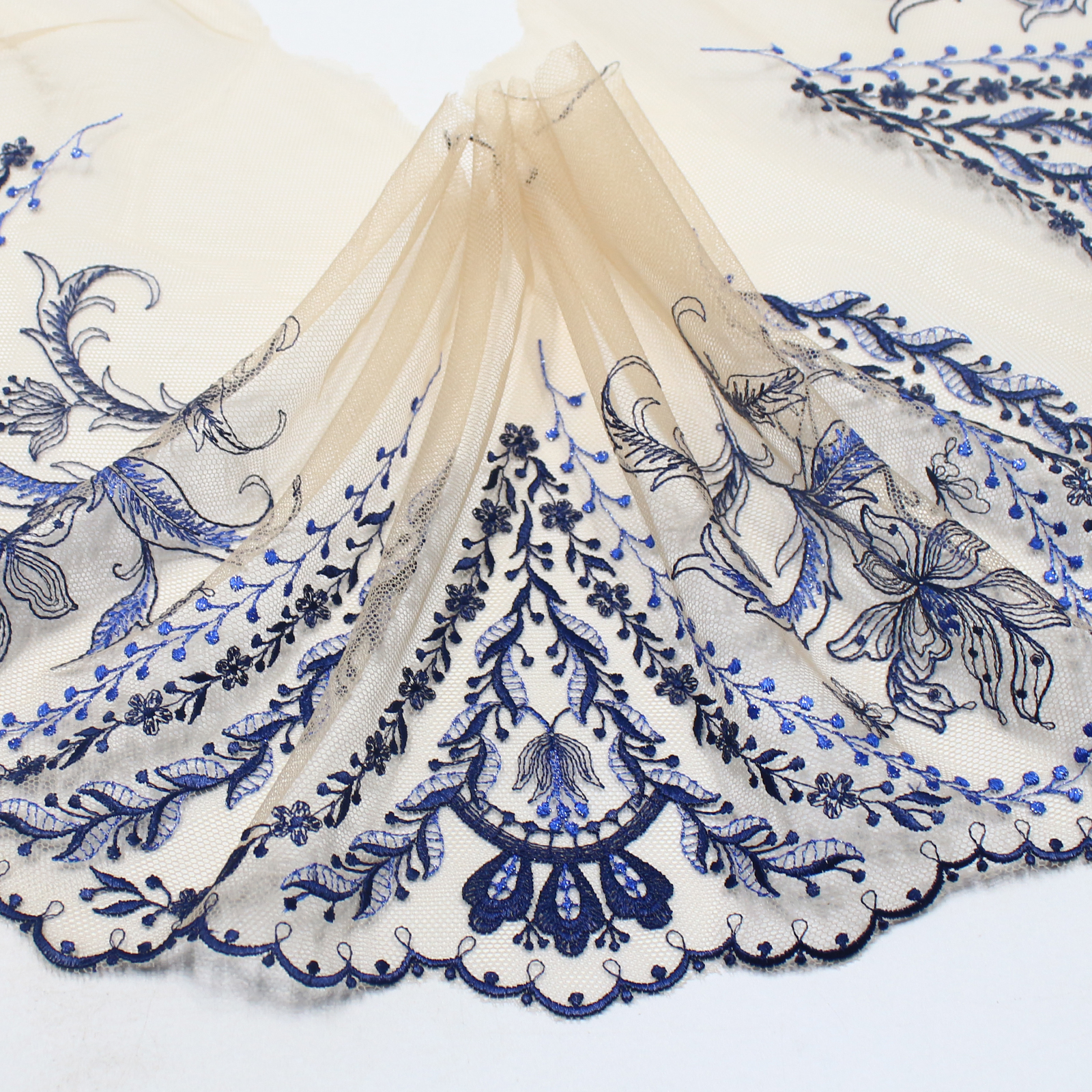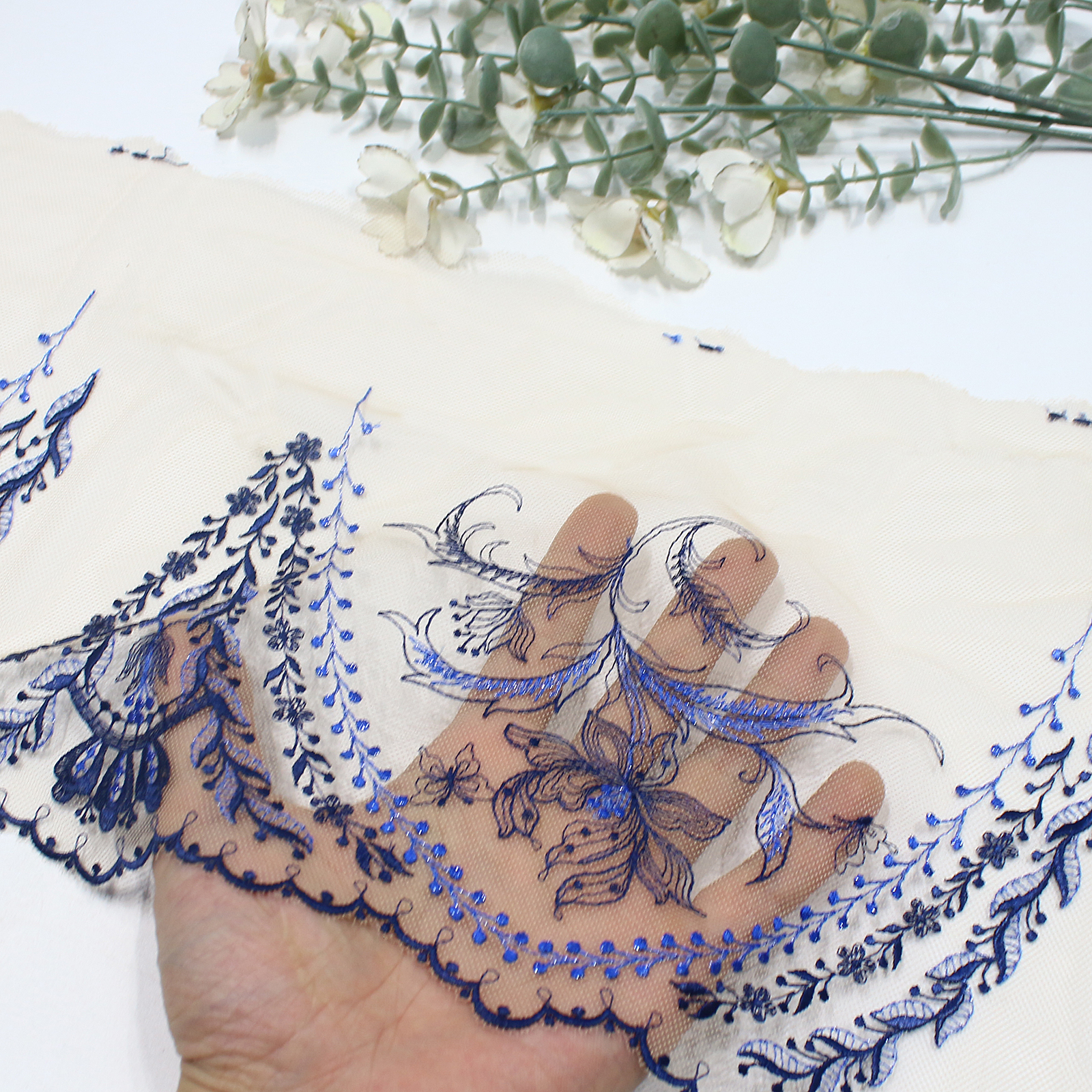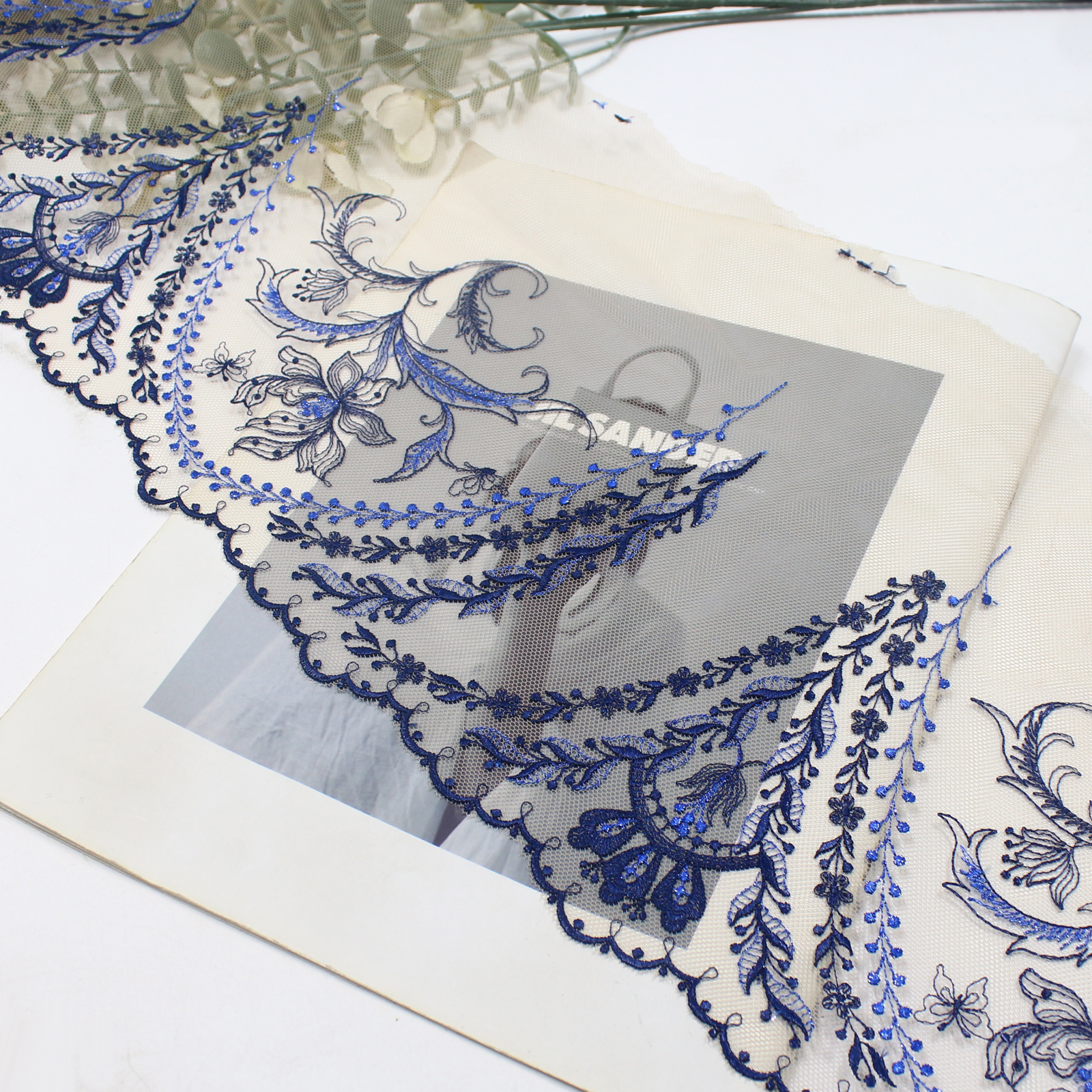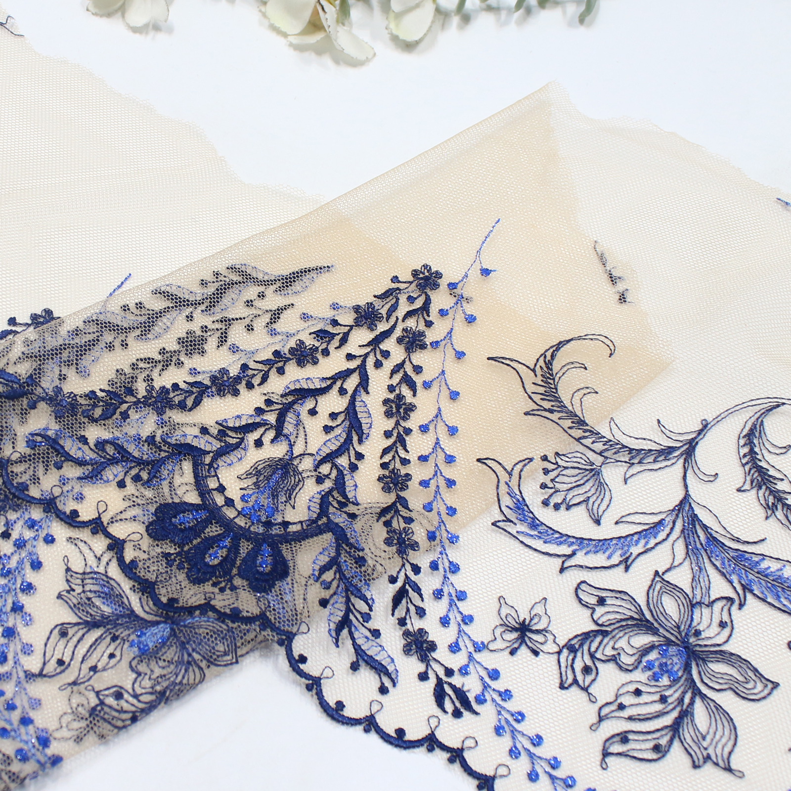 This embroidered lace trim is crafted on a transparent nude tulle mesh base with a width of approximately 20.5 cm. The design features contrasting royal blue and light blue floral bouquets that create a rich and elegant visual effect.