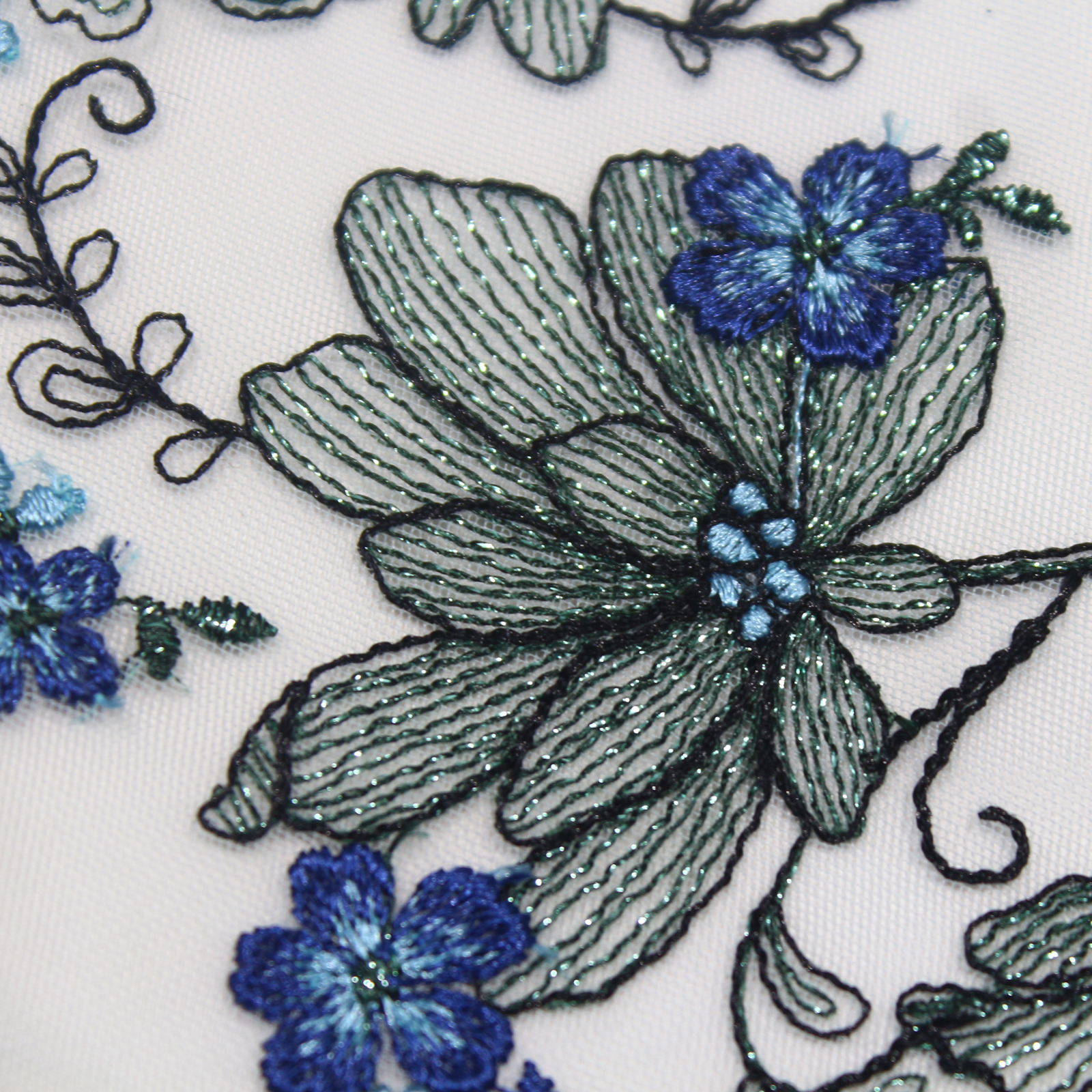 Metallic thread is used to outline the floral shapes, adding a subtle shimmering texture that enhances the luxurious appearance of the lace. The embroidered vines flow naturally across the mesh, giving the lace a graceful and dynamic character.