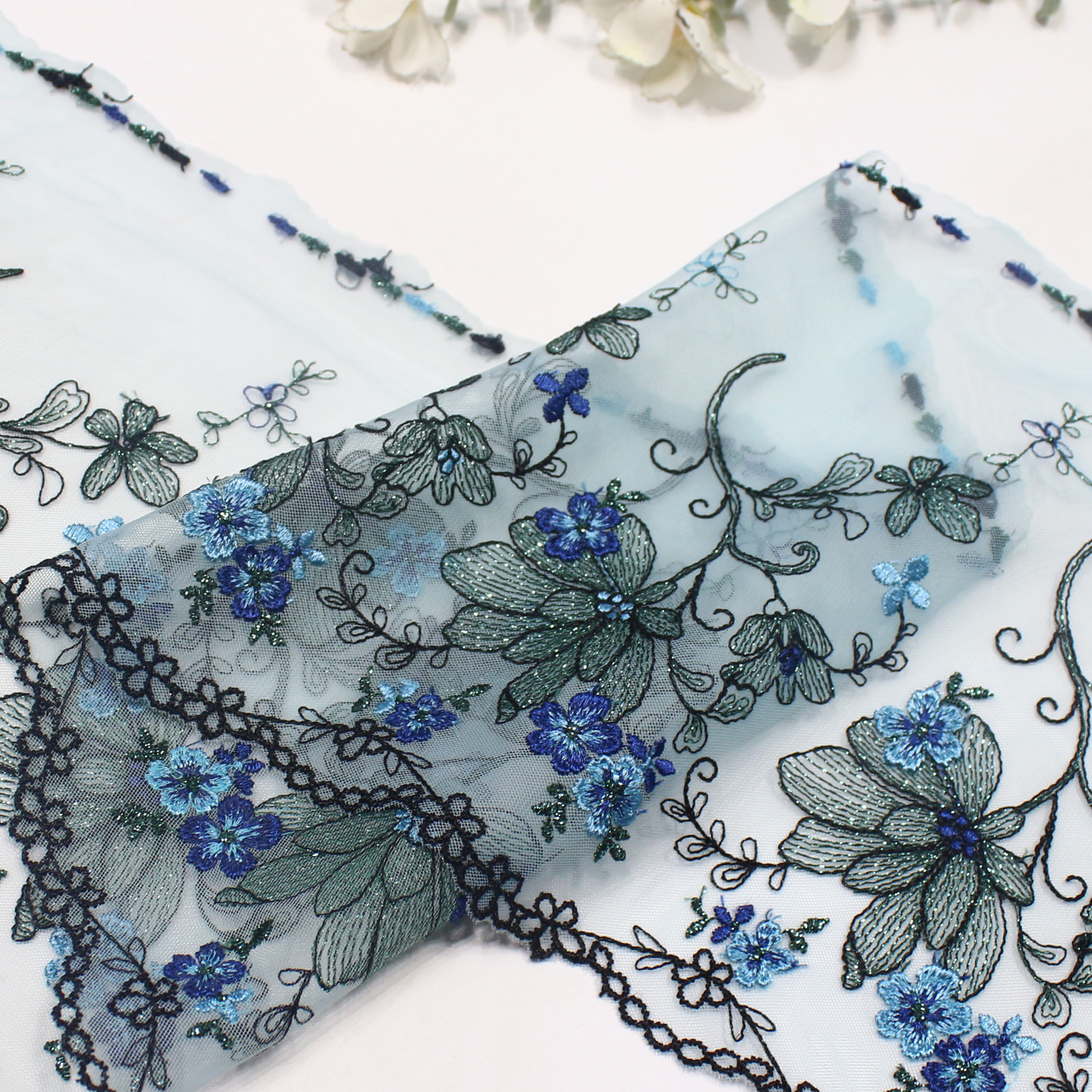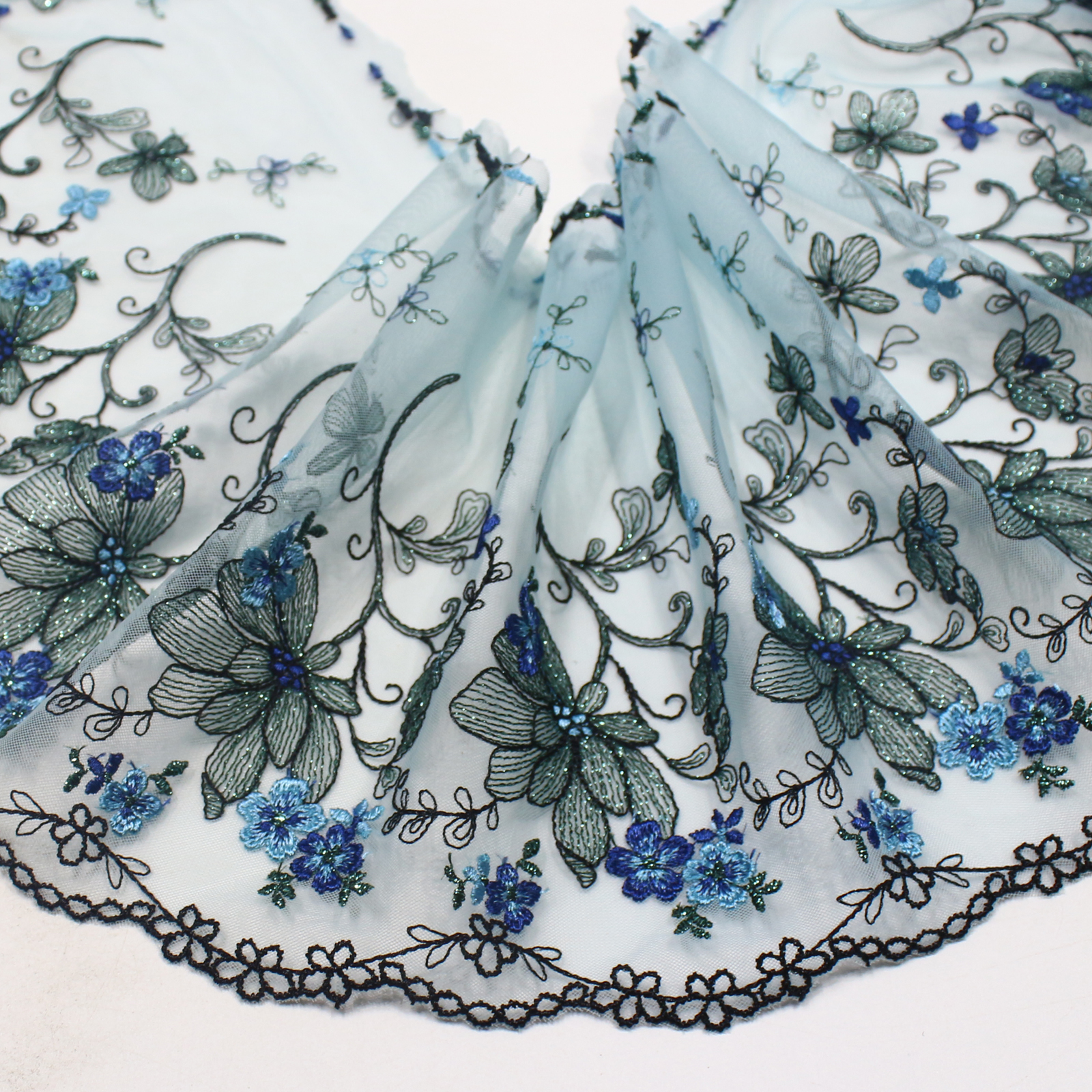 Elegant blue floral embroidered lace trim crafted on a sheer light blue tulle base. Metallic thread outlines the floral patterns while delicate blue flowers and flowing vines create a refined and graceful design.
