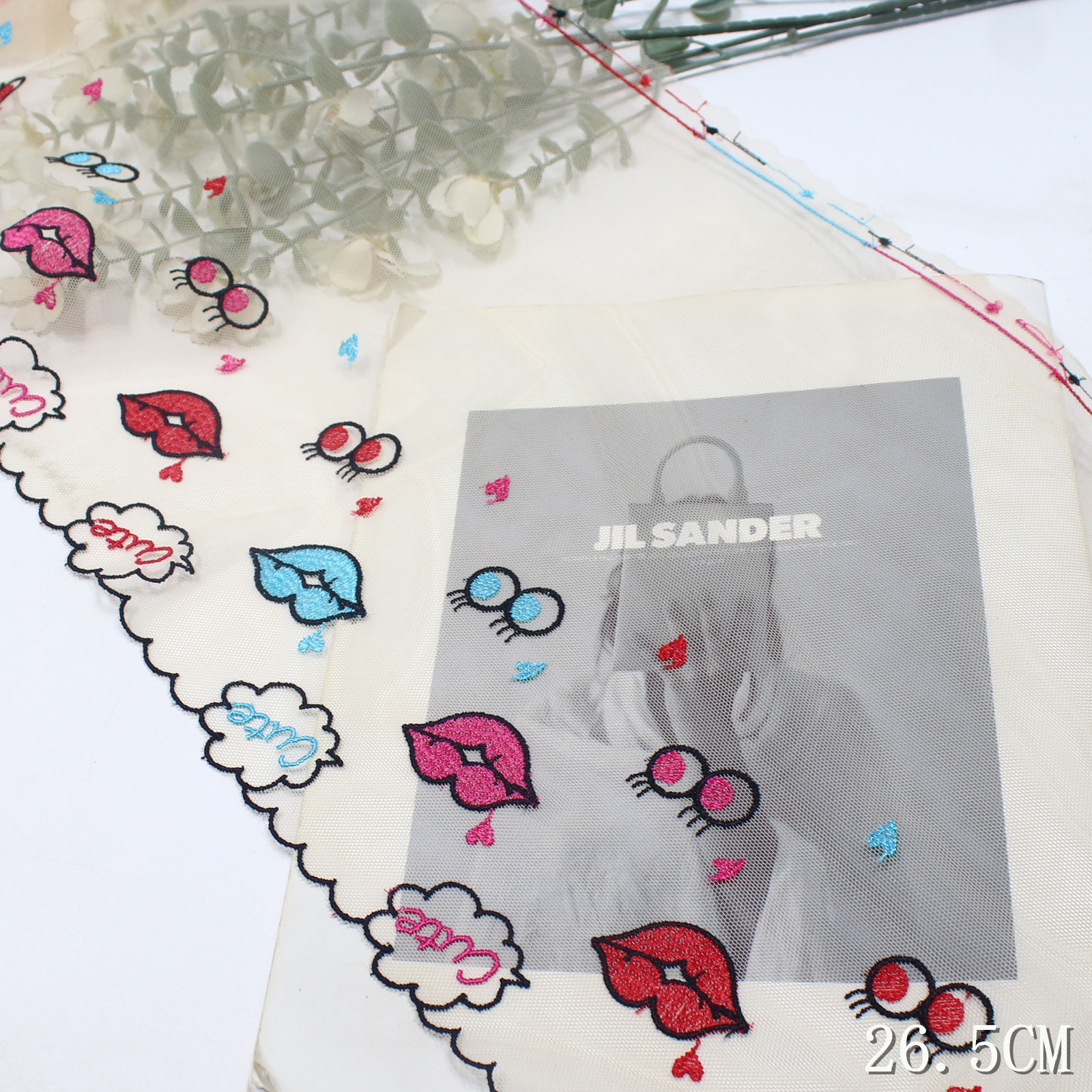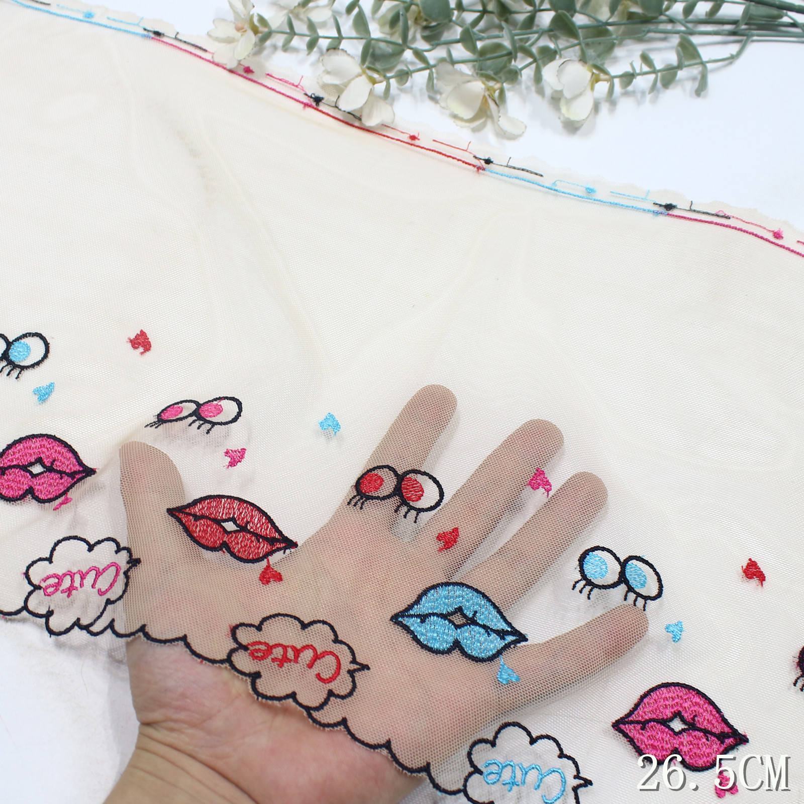 Fun and playful embroidered lace trim featuring colorful lips, winking eyes with long lashes, mini hearts, and “Cute” speech bubble details. Crafted on a sheer skin-tone tulle base, this lace adds a lively, girlish charm to garments and DIY projects.