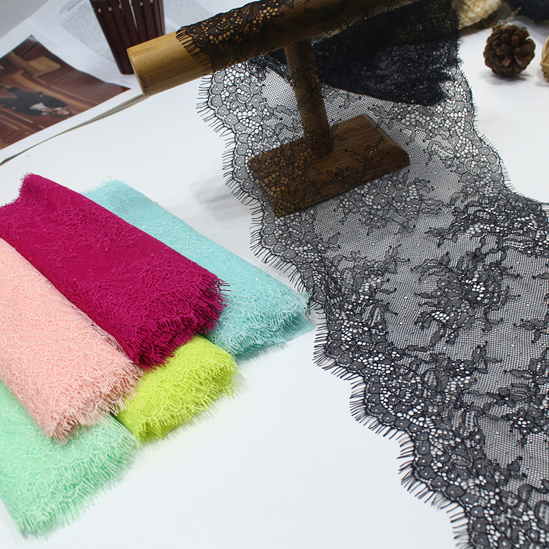 Non-elastic Chantilly eyelash lace with exquisite floral motifs on a nylon mesh base. Edges feature fringed or wave-like designs. Available in multiple colors: Black, Fluorescent Green, Fuchsia, Light Pink, Light Blue, and Light Green, suitable for a variety of fashion styles and decorative applications.