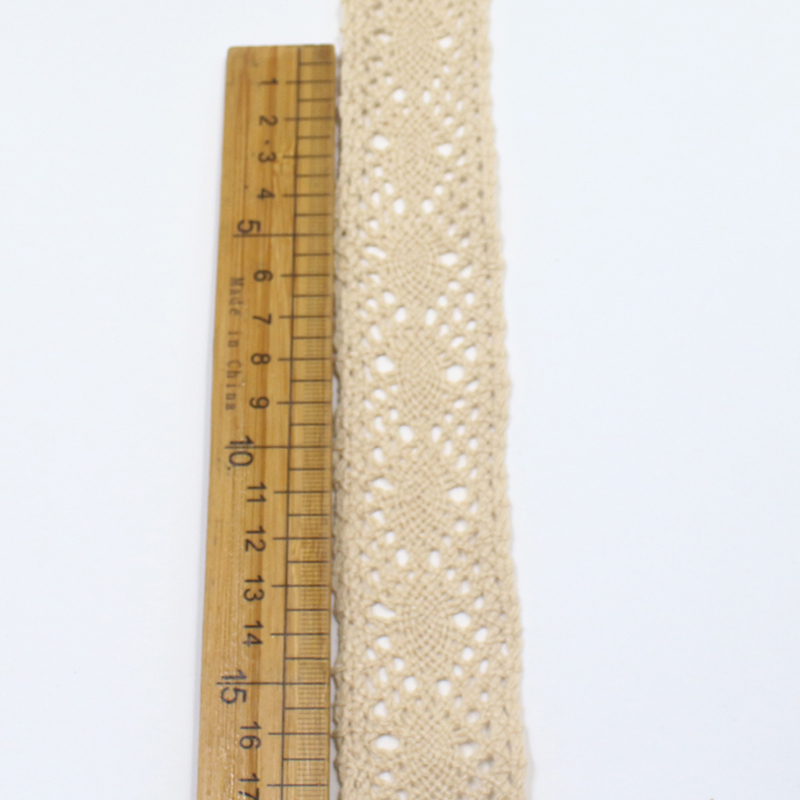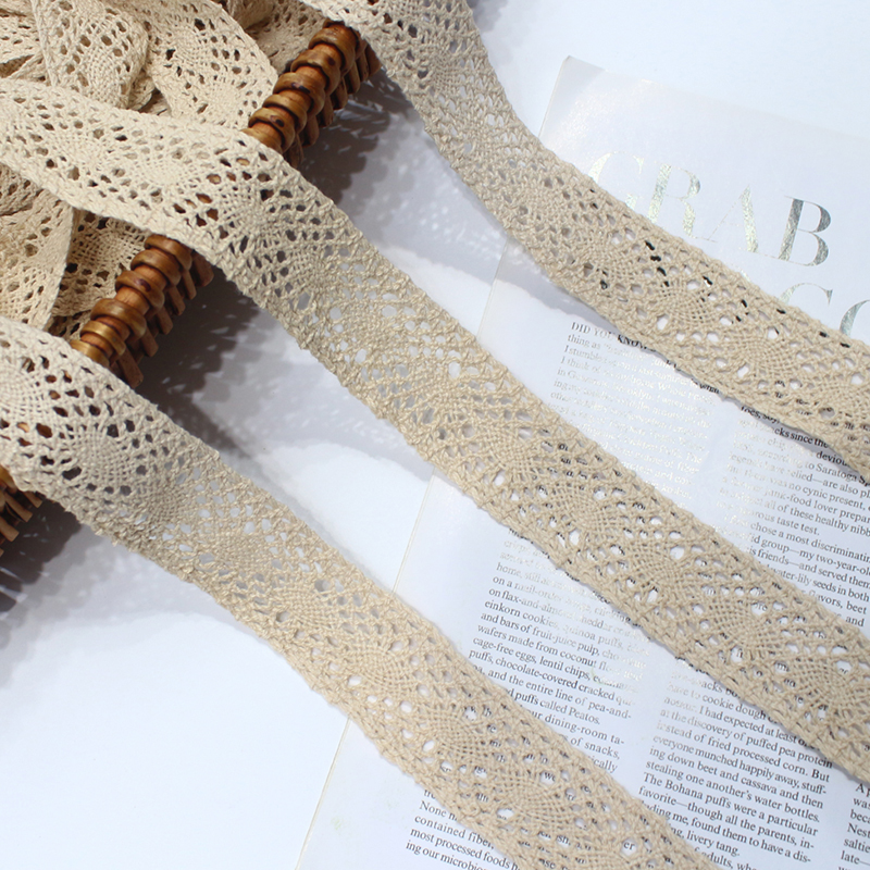 This lace trim is made from natural-colored yarn using warp-knitted cluny crochet technique, forming consistent openwork patterns. The texture is fine and uniform, with flowing edges and a lightweight feel. Its understated, rustic elegance adds vintage or countryside charm to apparel, accessories, and DIY projects.
