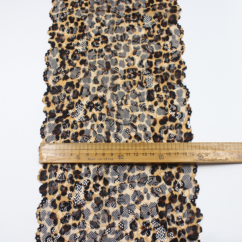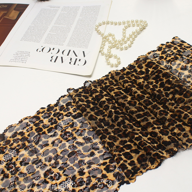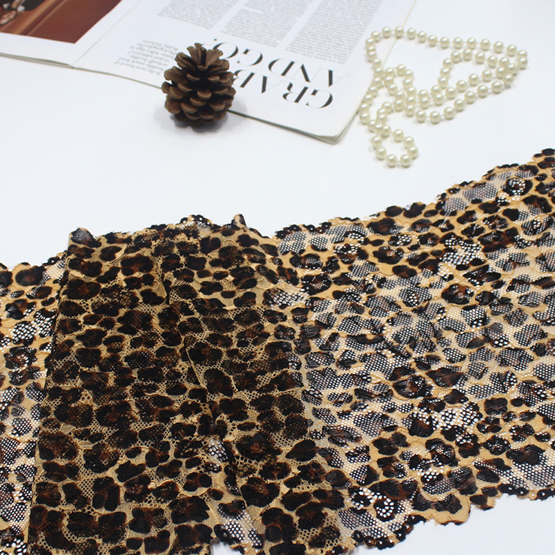 This elastic lace trim features a leopard pattern integrated into a translucent mesh base using dyeing or jacquard techniques. The lace is finely stitched with a firm texture, providing structure while maintaining elasticity. Ideal for creating dimensional shapes and adding a bold accent to garments and accessories.