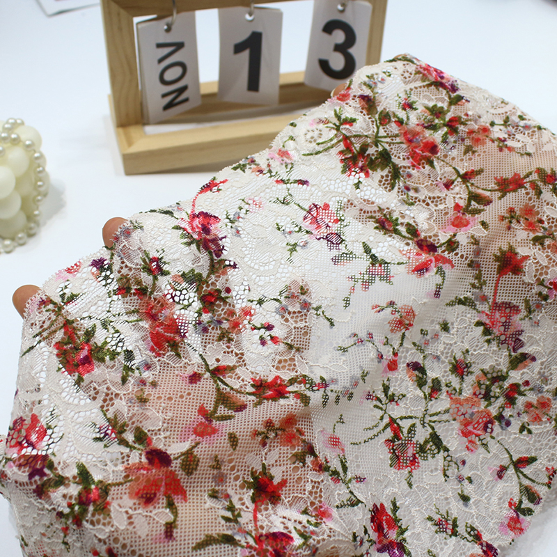 Elastic lace with a delicate multicolor small floral pattern on a nude/off-white mesh base. Featuring red, pink, purple, and green flowers with leaves in a naturally staggered layout, creating a fresh, romantic, and countryside-inspired look.