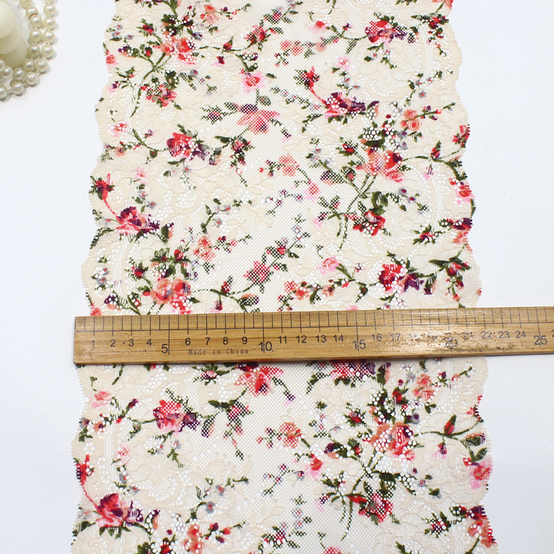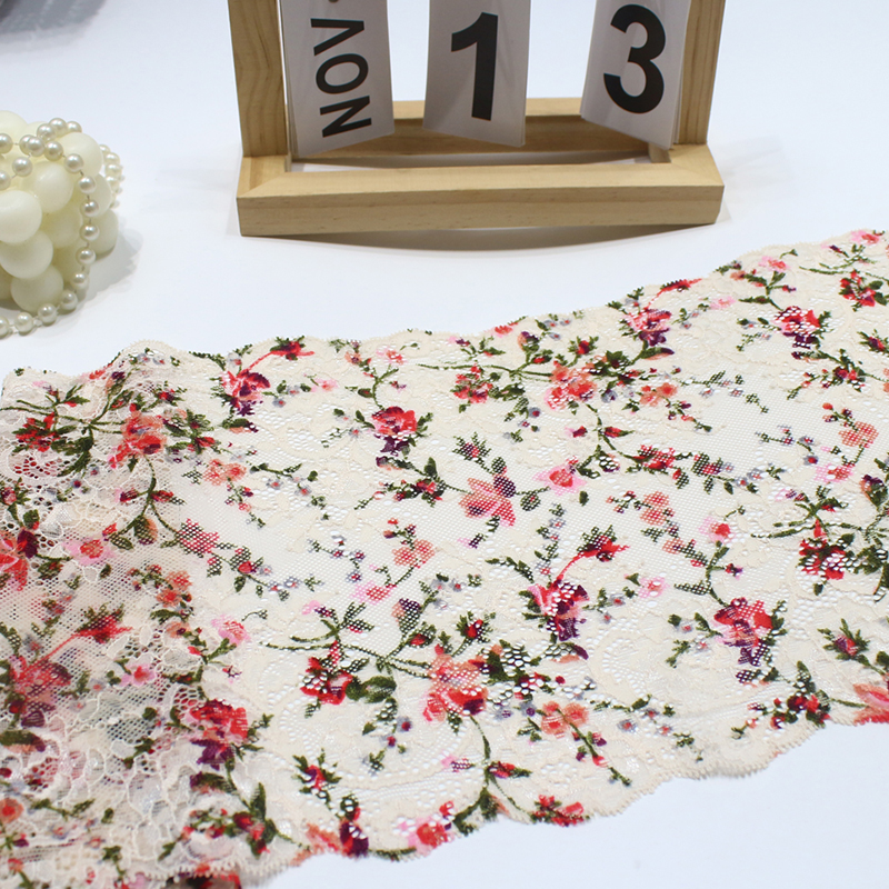 This elastic lace trim is crafted using lace weaving techniques on a translucent mesh base. The floral pattern is finely detailed, featuring small flowers in multiple colors with leaves, arranged in a natural, airy layout. The edges are wave-shaped, and the fabric is lightweight and flowing, perfect for creating soft and elegant decorative accents.