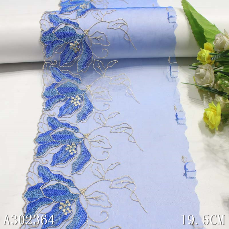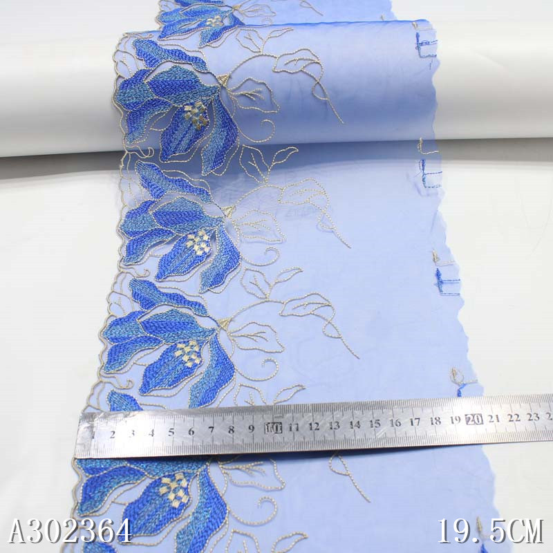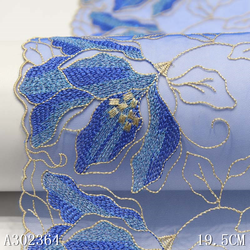 Crafted on a soft light blue mesh base, this lace trim showcases gradient floral embroidery blending blue and gold tones, creating a subtle yet eye-catching transition of color.