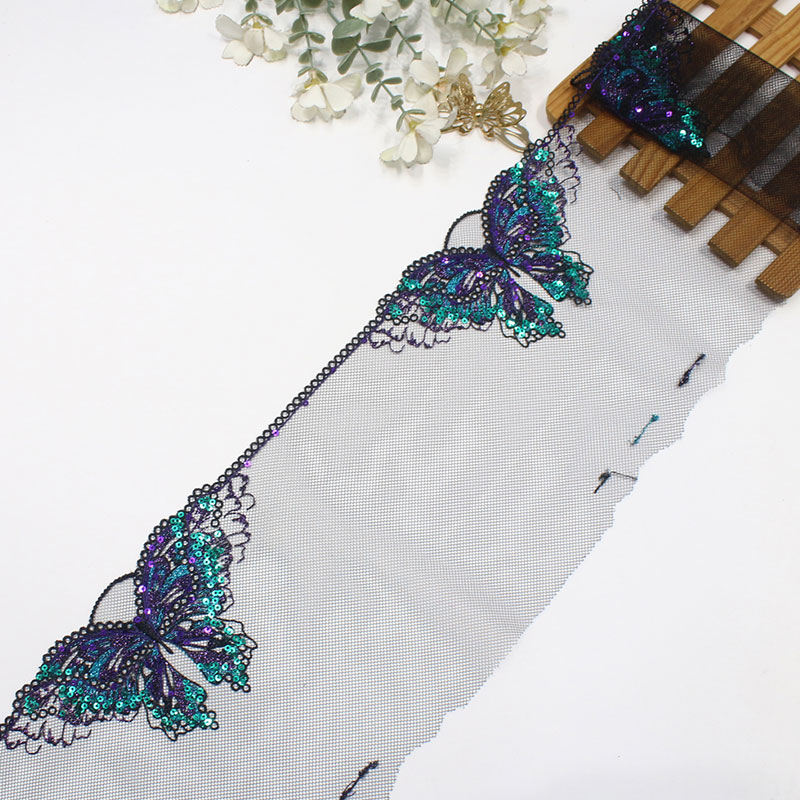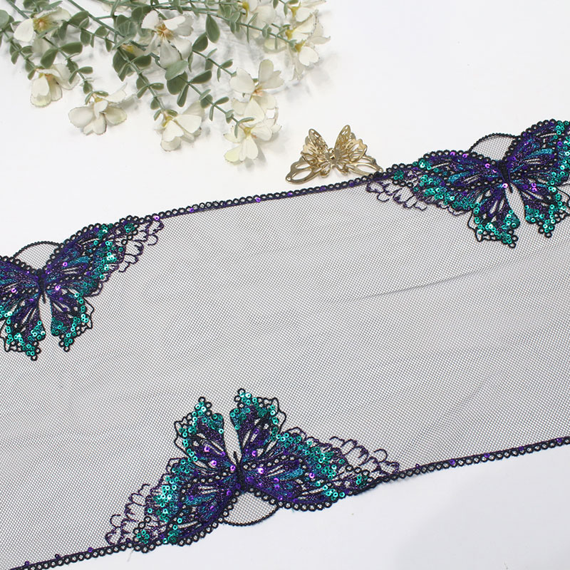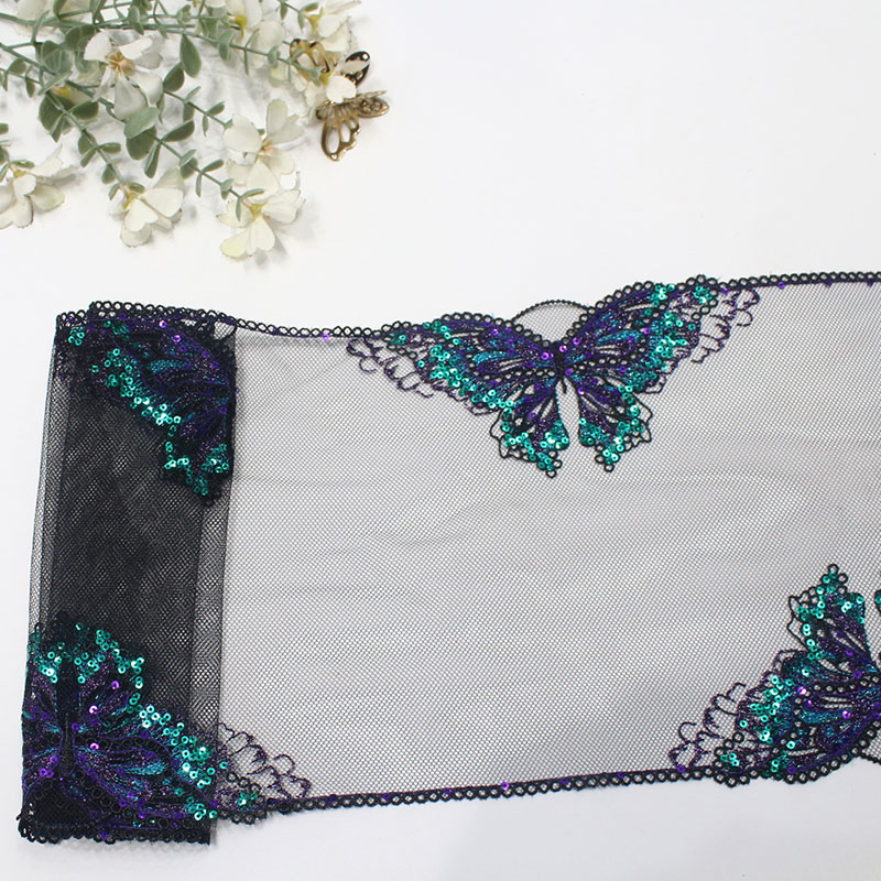 This lace features delicate butterfly embroidery decorated with sequins and metallic threads, creating a sparkling and dimensional effect. The design has a 14 cm pattern repeat, ensuring evenly spaced butterfly motifs throughout the lace. The mesh base is soft and stable, suitable for sewing onto fashion garments, dress panels, and special-occasion apparel.