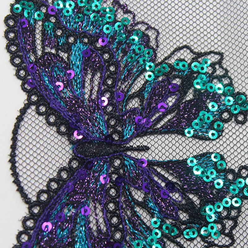 Butterfly embroidery lace with sequins and metallic threads. Decorative, refined, and suitable for dresses, lingerie, couture fashion, and DIY projects.