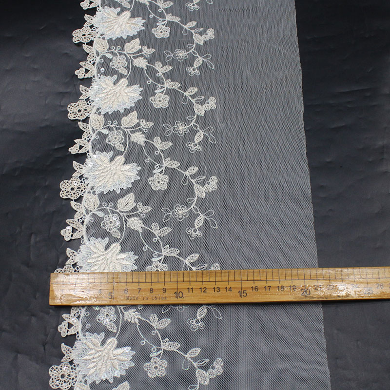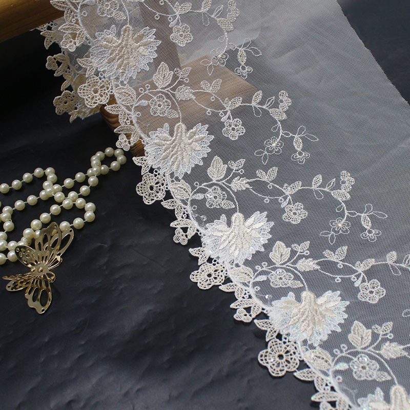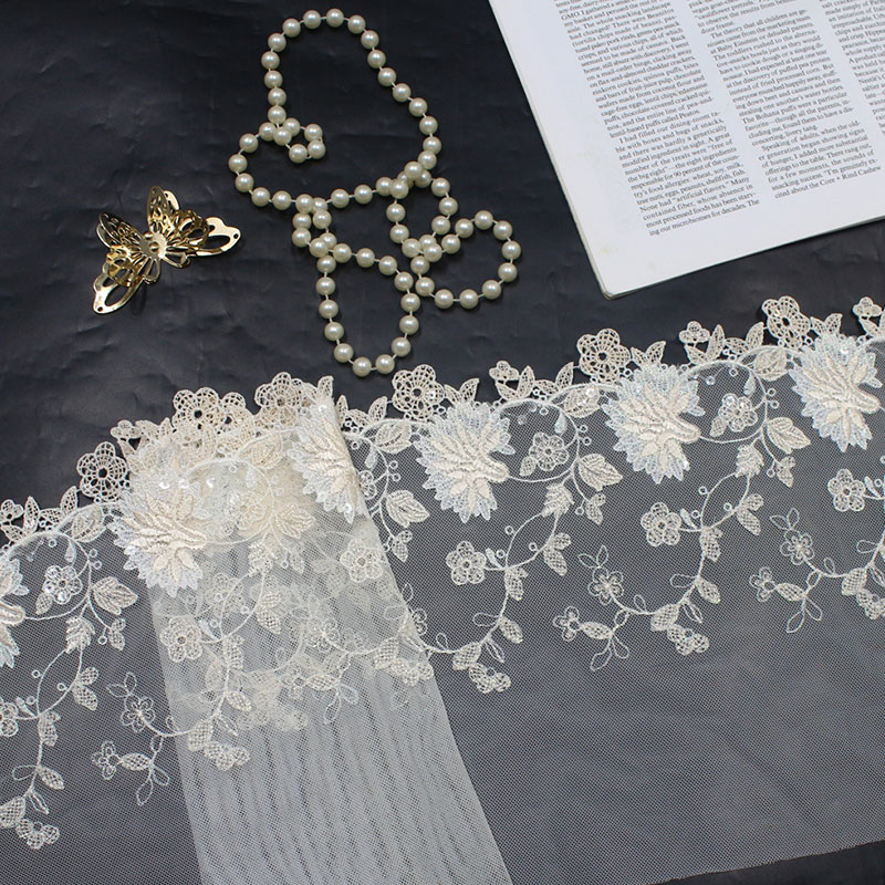 Embroidery lace combining mesh embroidery with guipure (chemical lace) elements. Featuring large florals, small flowers, leaves, and subtle sequin accents for a refined and romantic appearance. Suitable for dresses, bridal wear, and elegant fashion applications.