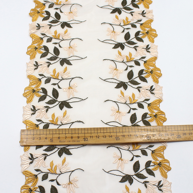 Double-edge embroidery lace crafted on a lightweight nude mesh base. Featuring a natural floral vine design with yellow and off-white flowers paired with deep green leaves, creating a soft, elegant, and botanical visual effect.