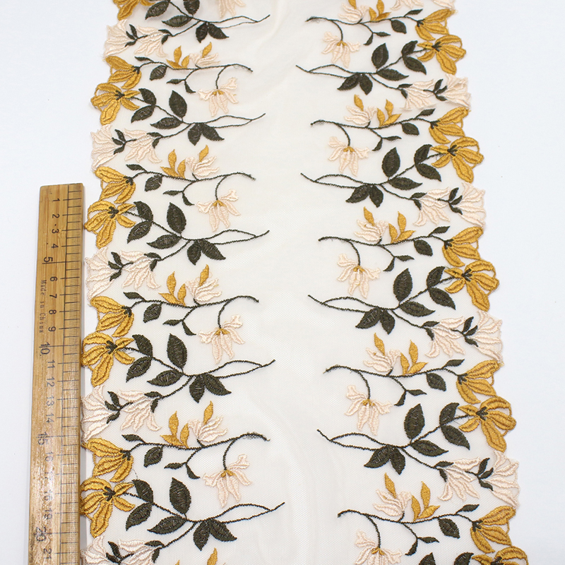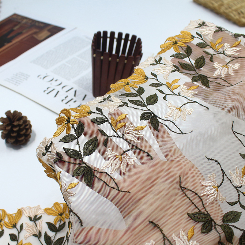 This lace is made on a thin nude mesh base with embroidery along both edges, creating a balanced decorative effect. The floral vine motif combines yellow and off-white flowers with deep green leaves, arranged in a naturally staggered layout. The overall style is delicate, refined, and suitable for feminine apparel and dress decoration.