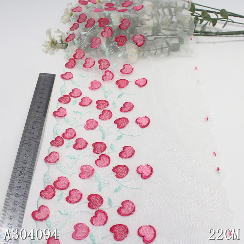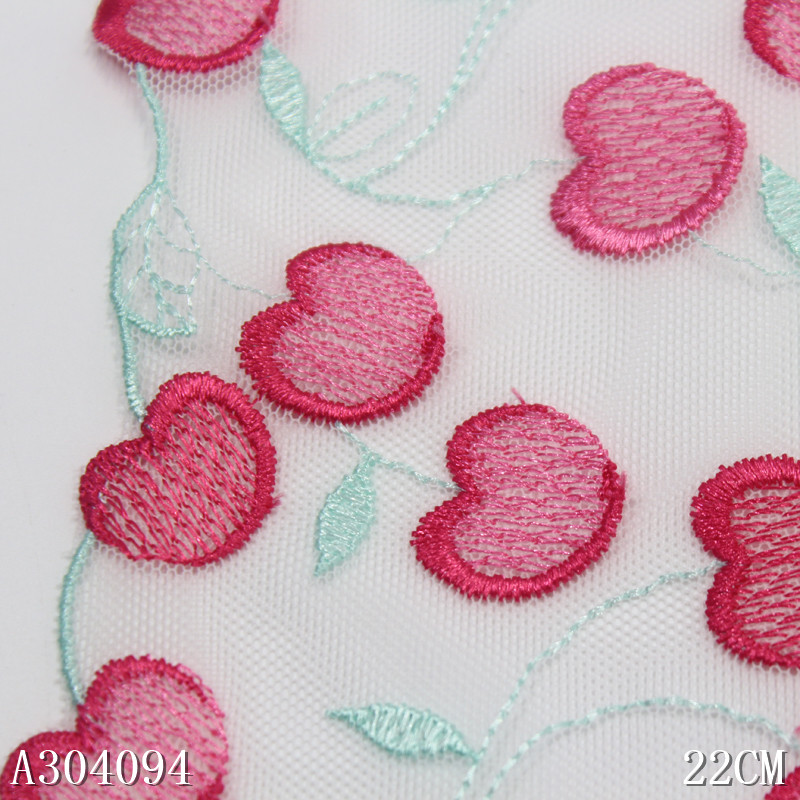 Pink embroidery lace trim featuring a fresh cherry pattern embroidered on soft mesh. Light, playful, and feminine, this lace brings a sweet and youthful touch to garment decoration and accessories.