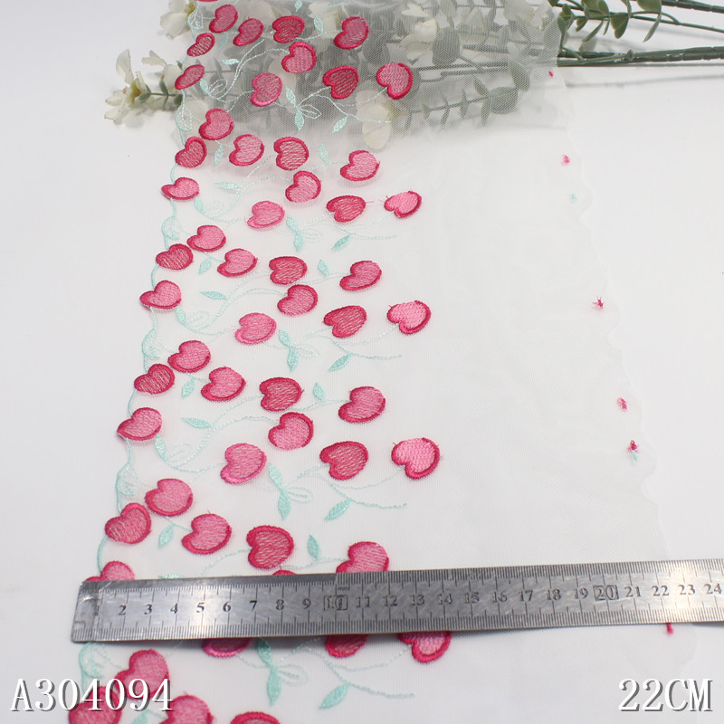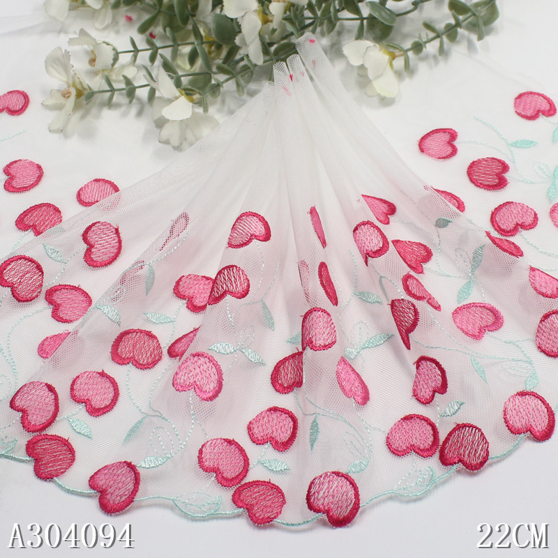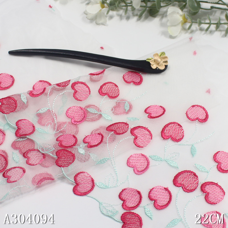 This embroidery lace trim is crafted on a fine mesh base, decorated with delicate cherry motifs that create a fresh and lively visual effect. The soft pink tone enhances the lace’s gentle and romantic character, making it especially suitable for feminine and youthful designs.