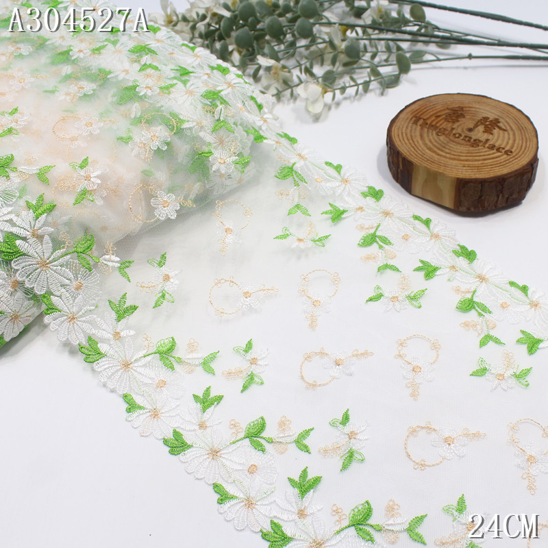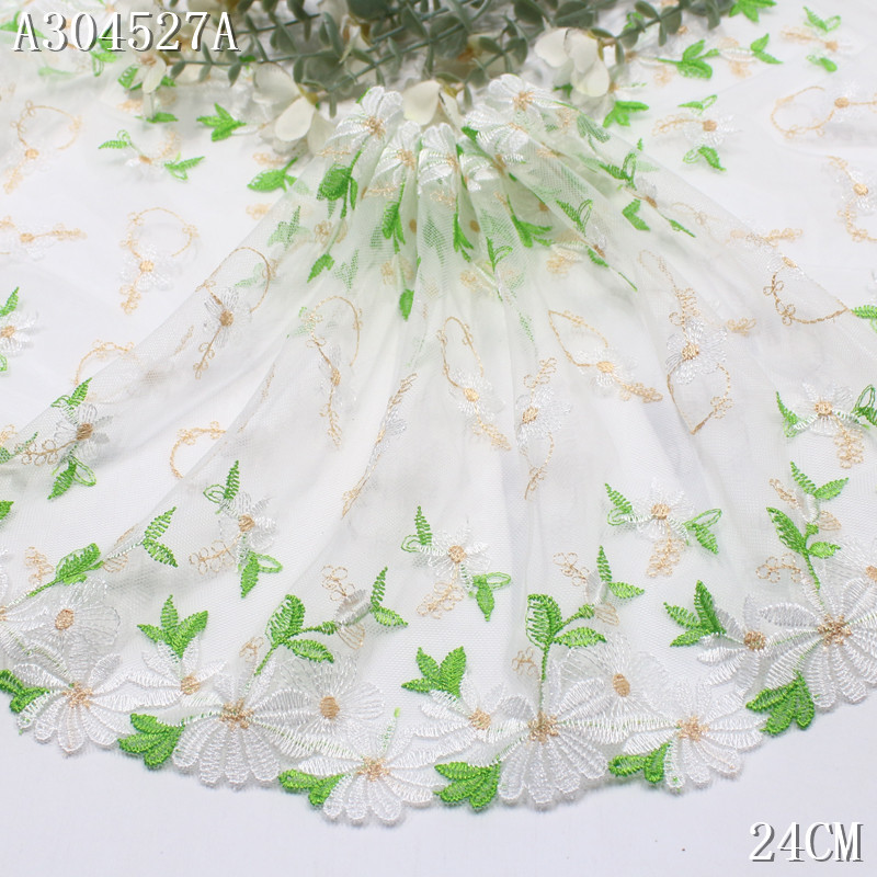 Fresh white and green floral embroidery lace on a white mesh base. Layered petals and subtle gold thread accents in the flower centers and leaves create a refined and decorative look. Suitable for dresses, kidswear, loungewear, and DIY projects.