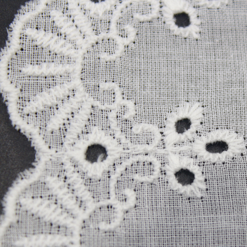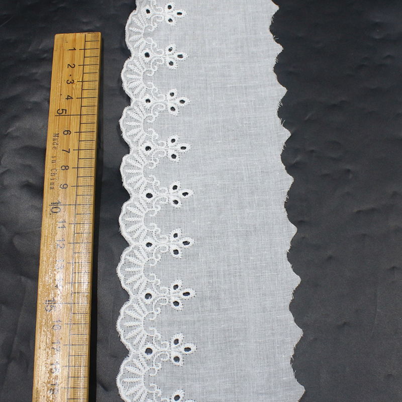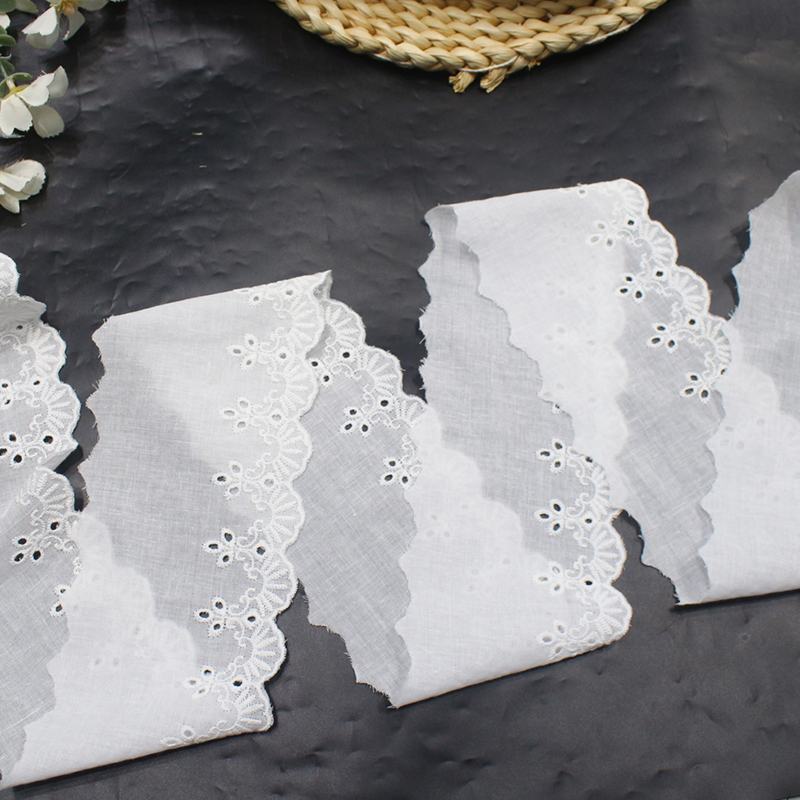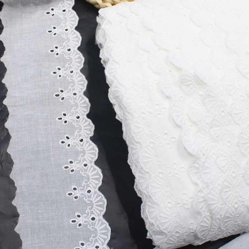 This lace is made on a pure white cotton base using precise embroidery and eyelet techniques, creating floral and scroll motifs with small decorative holes. The scalloped wave edges and layered pattern give the lace a delicate, structured texture. Perfect for garments, home décor, and DIY crafts that require a fresh, vintage-inspired aesthetic.