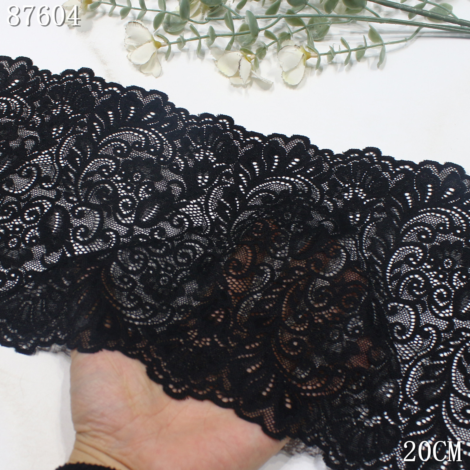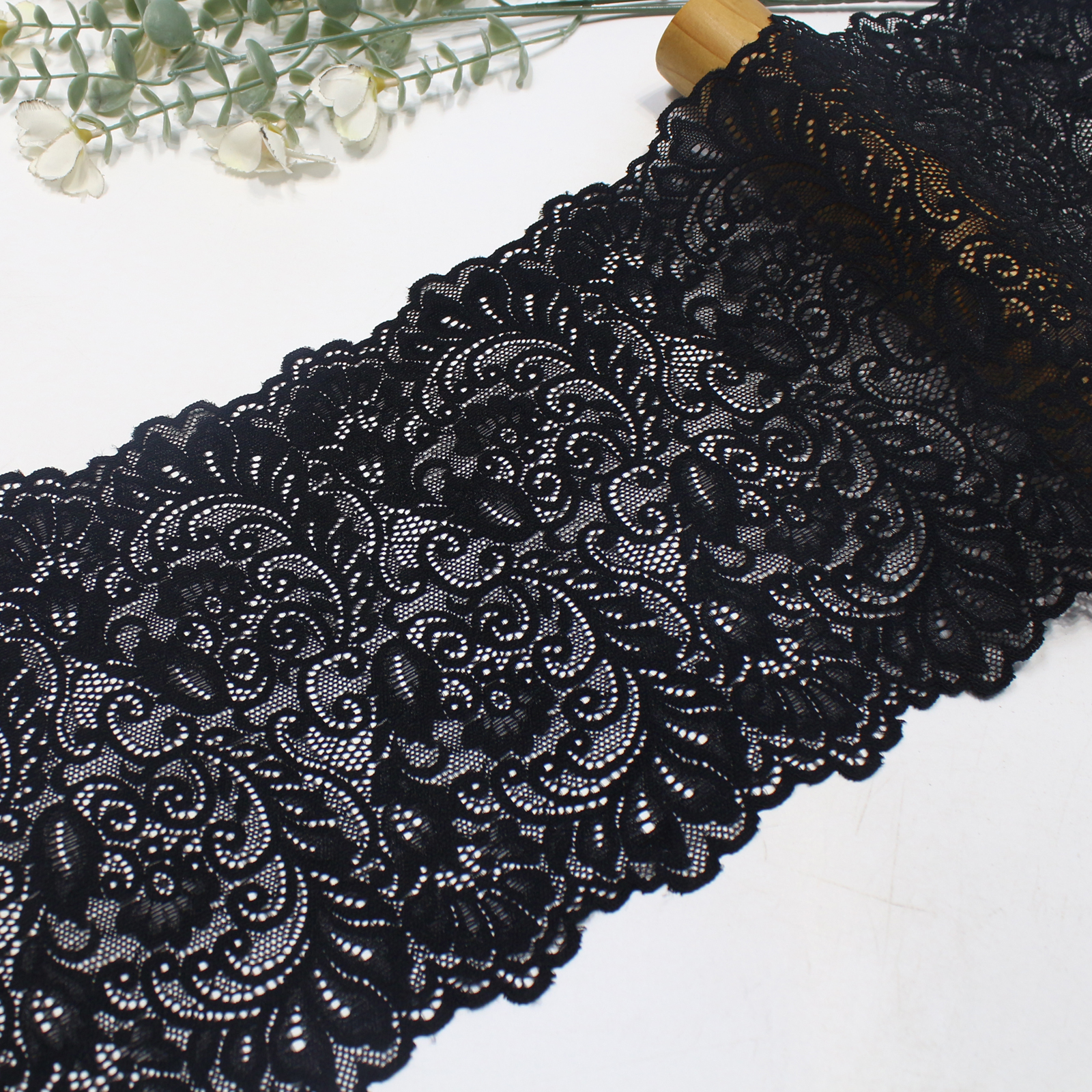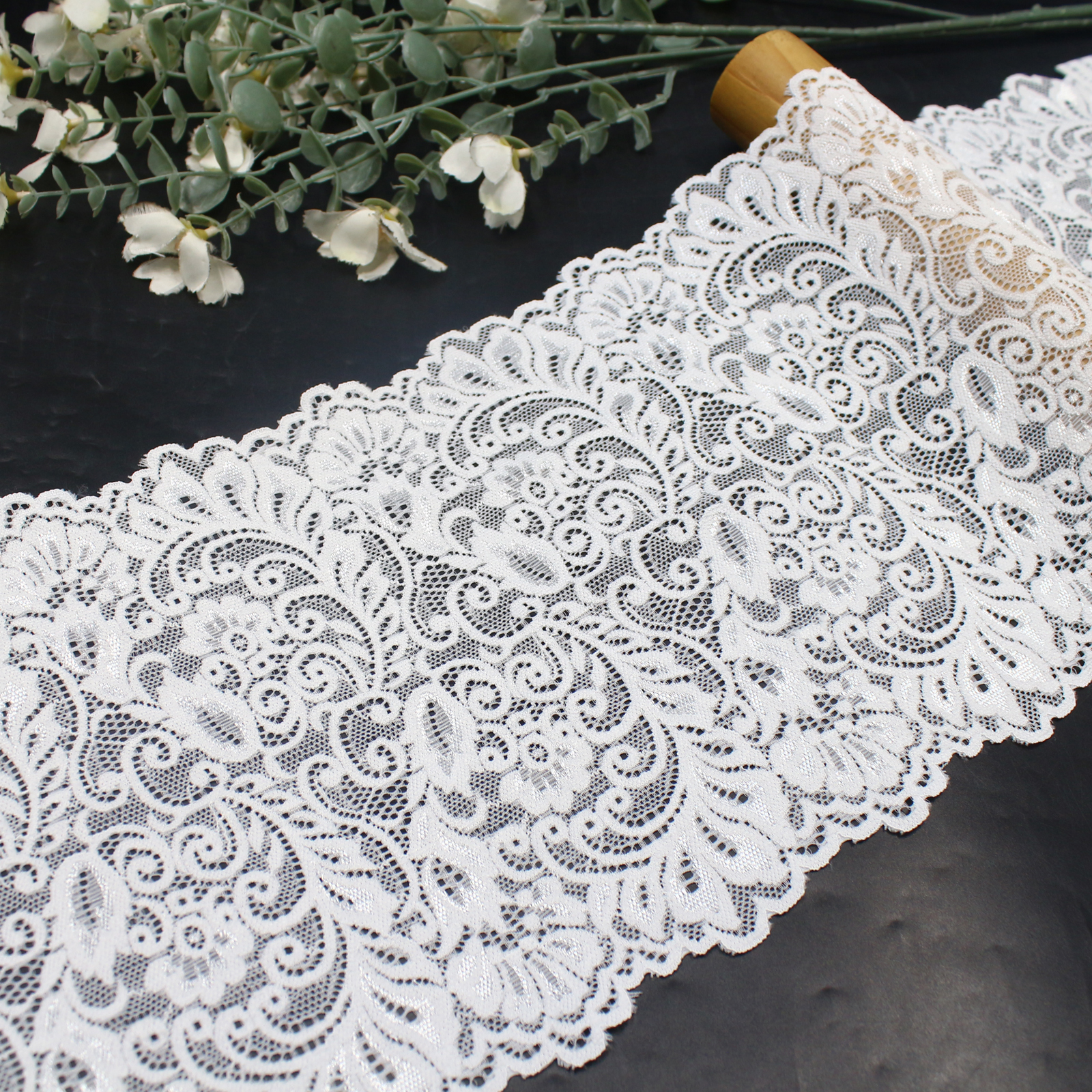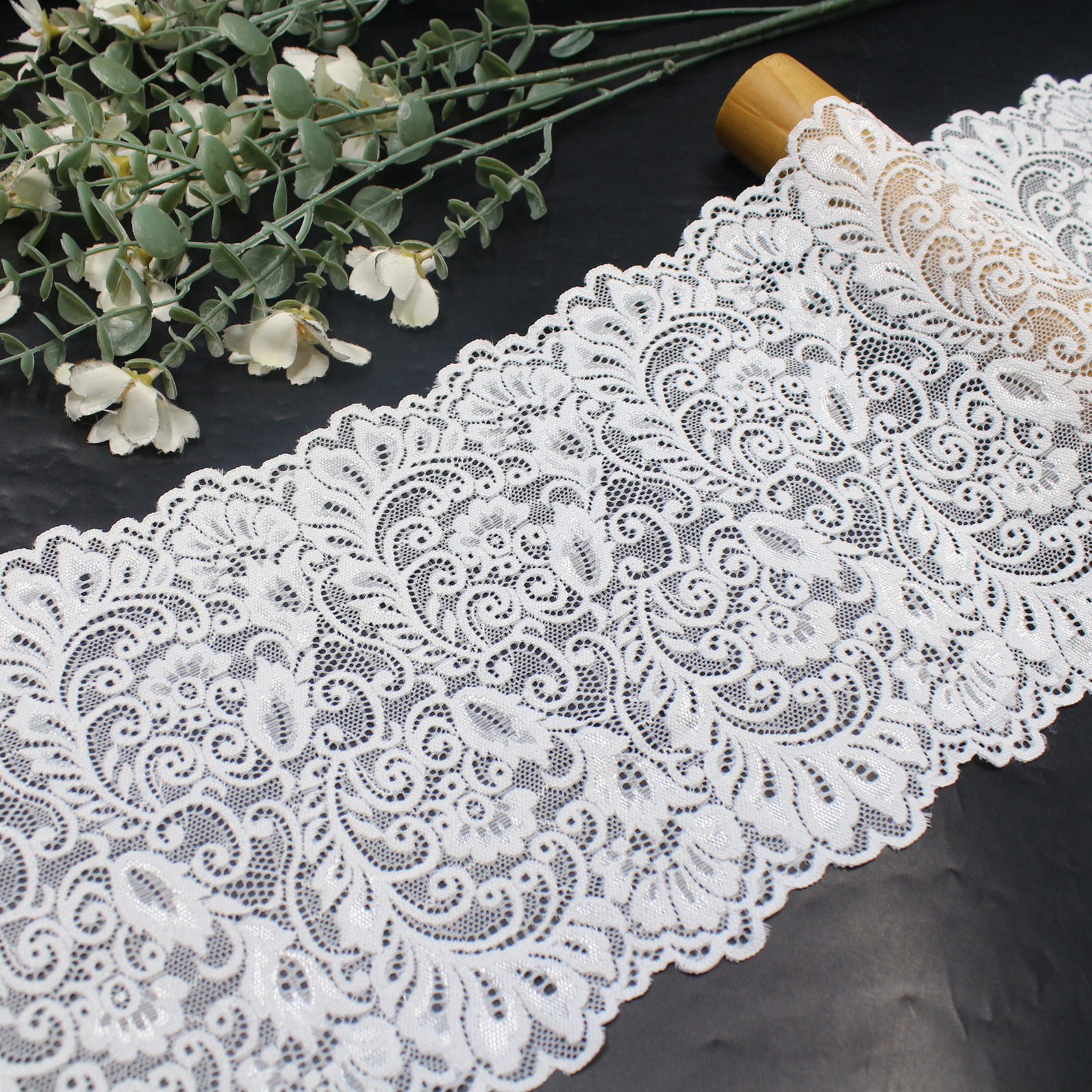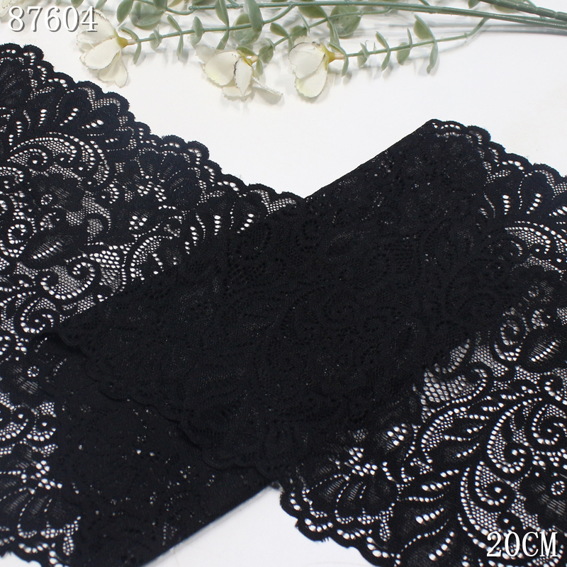 This stretch lace trim is crafted on a high-elastic lace base with a width of 20 cm and is available in three classic colors: black, off white, and bleached white.