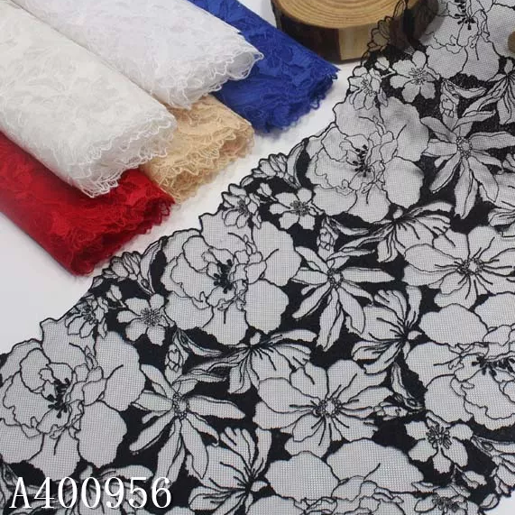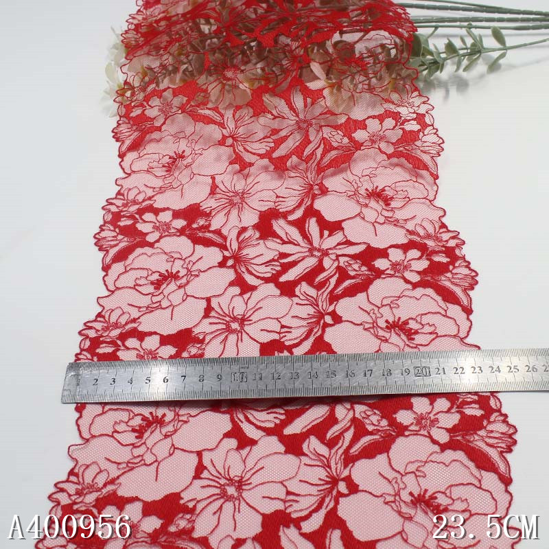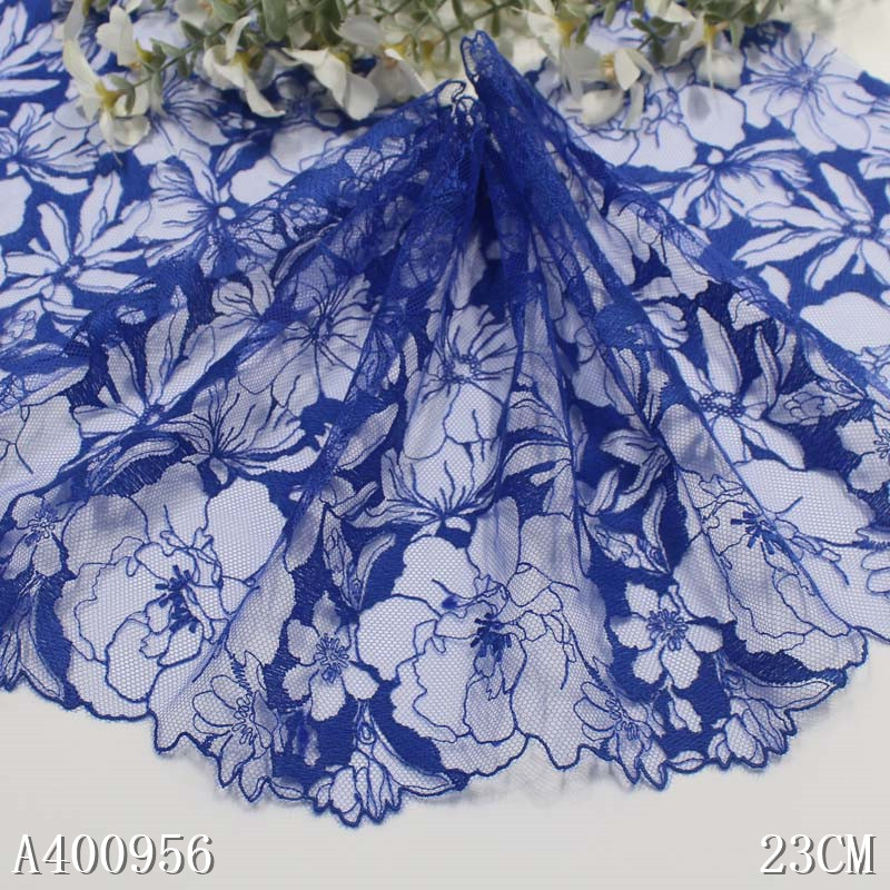 High-density full floral embroidery lace featuring large blossoms and flowing scroll motifs on a soft mesh base. Available in six classic color variations, suitable for bridalwear, evening gowns, lingerie, and decorative textile applications.