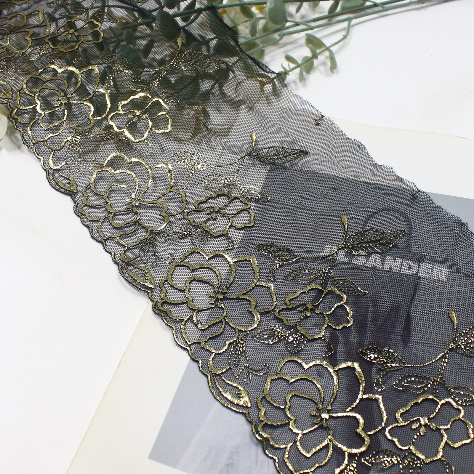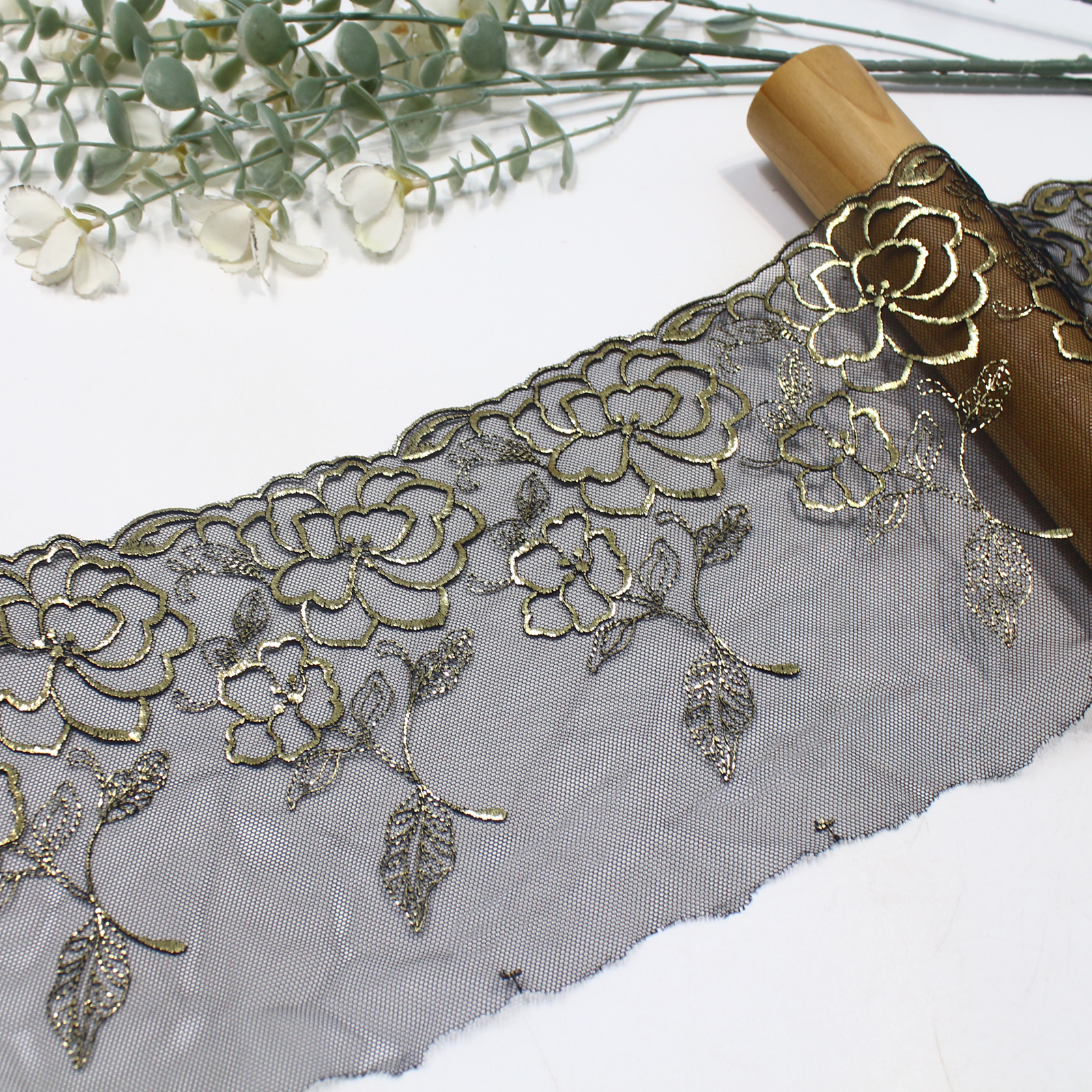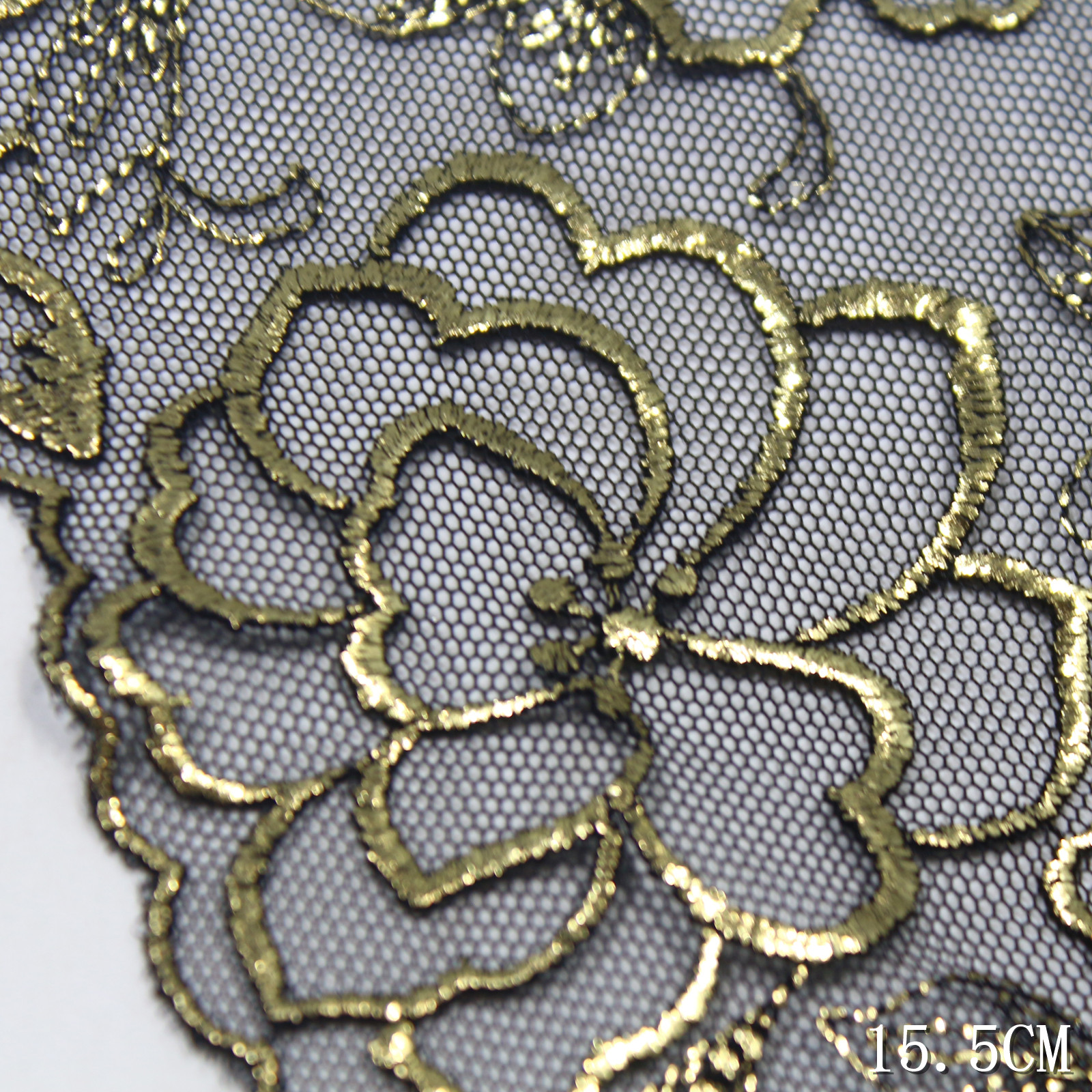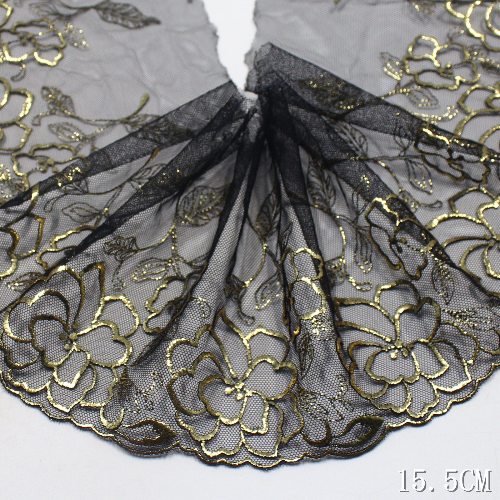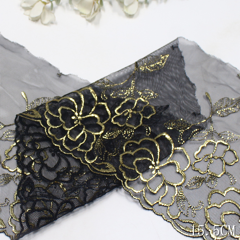 This lace trim showcases camellia flowers with outlines in black thread and gold foil highlights, resulting in a radiant metallic effect. The detailed leaf motifs add depth and sophistication, creating a refined vintage look.