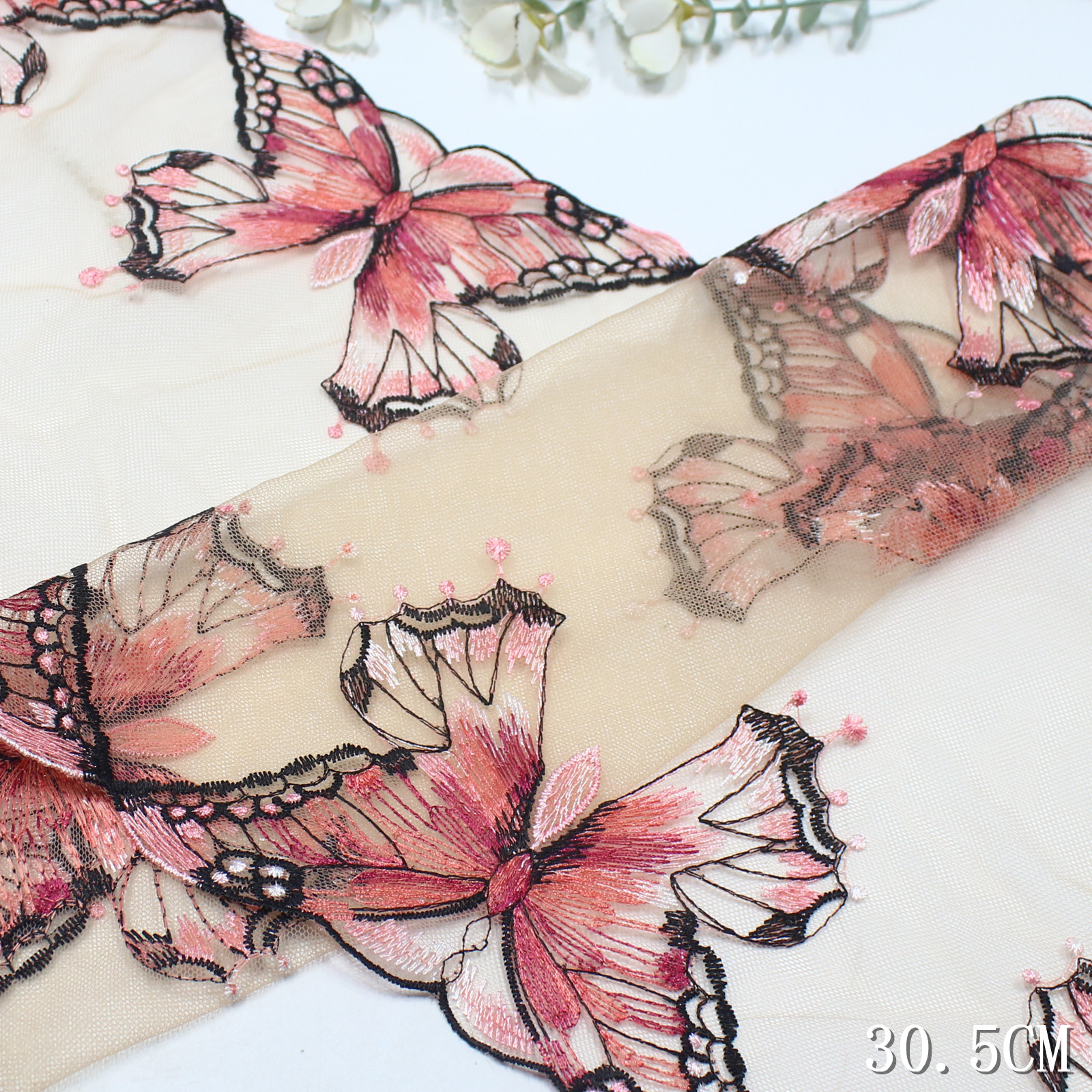 The butterfly wings are further embellished with delicate pink beadwork, adding texture and subtle sparkle. These fine details elevate the overall craftsmanship, giving the lace a refined and luxurious finish.