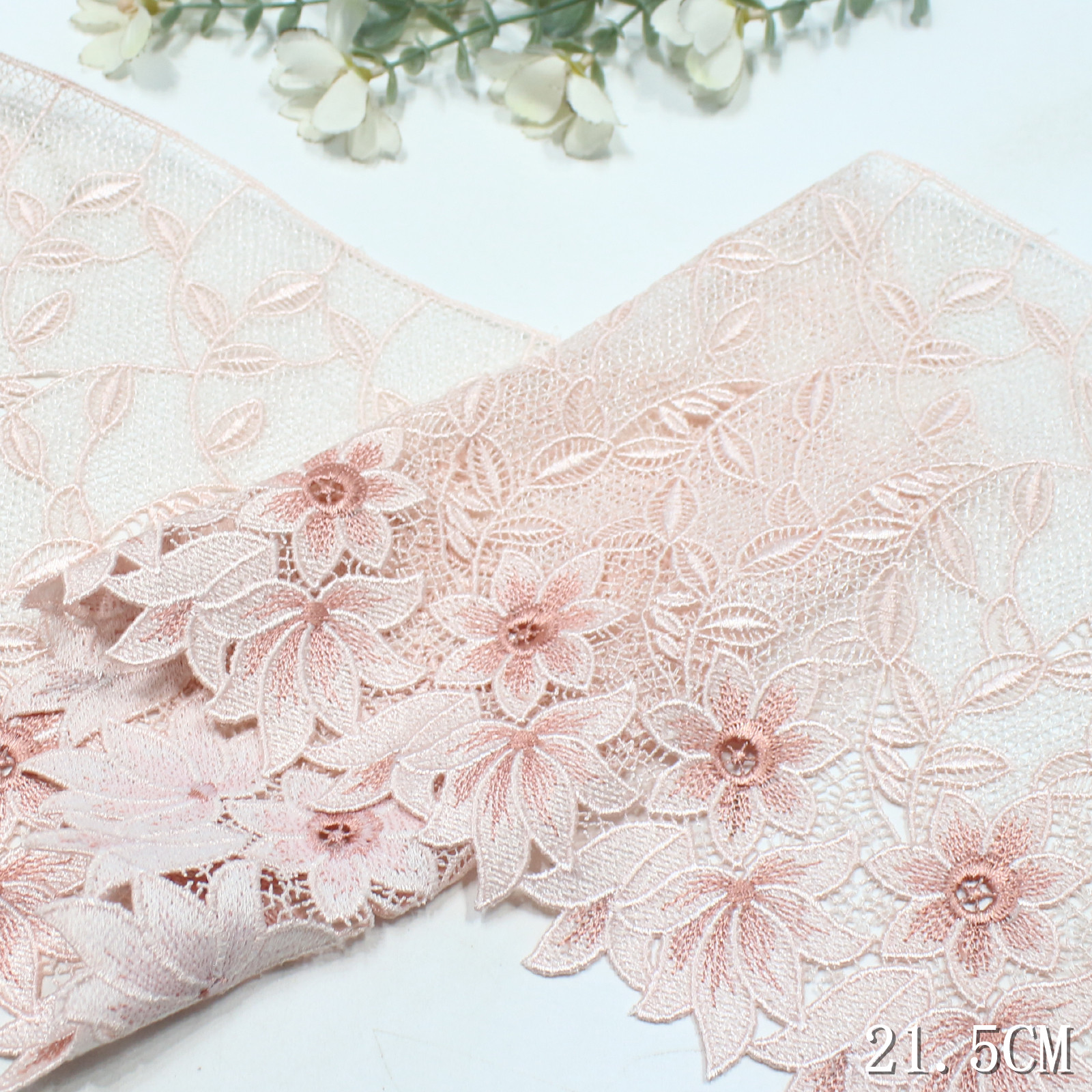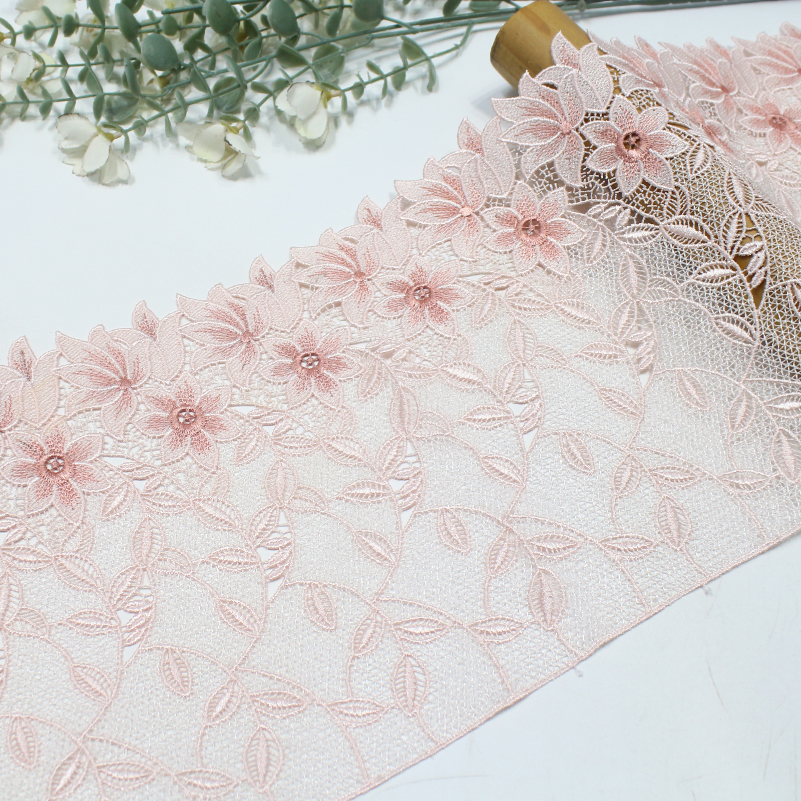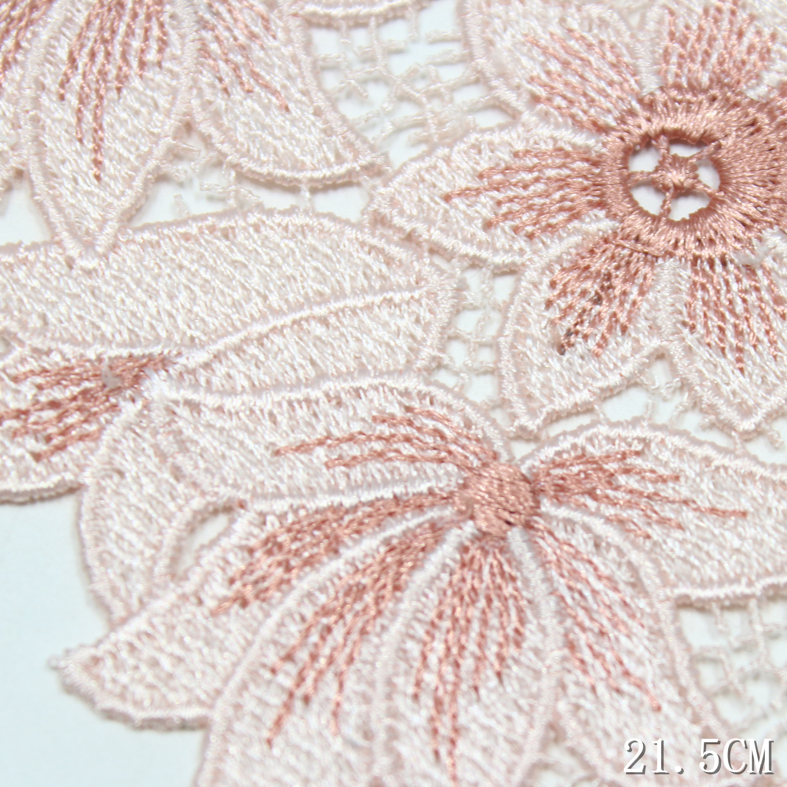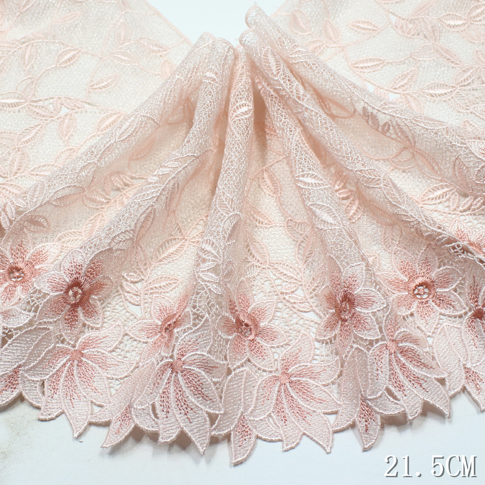 Delicate guipure lace trim featuring large floral motifs in soft pink gradient tones. Crafted with chemical lace technique, it offers a clean, structured edge with a light and graceful drape.