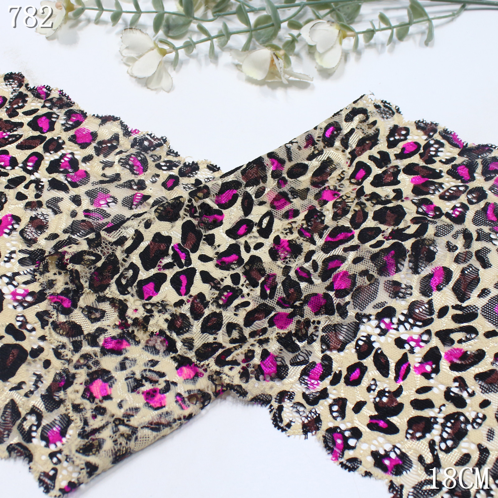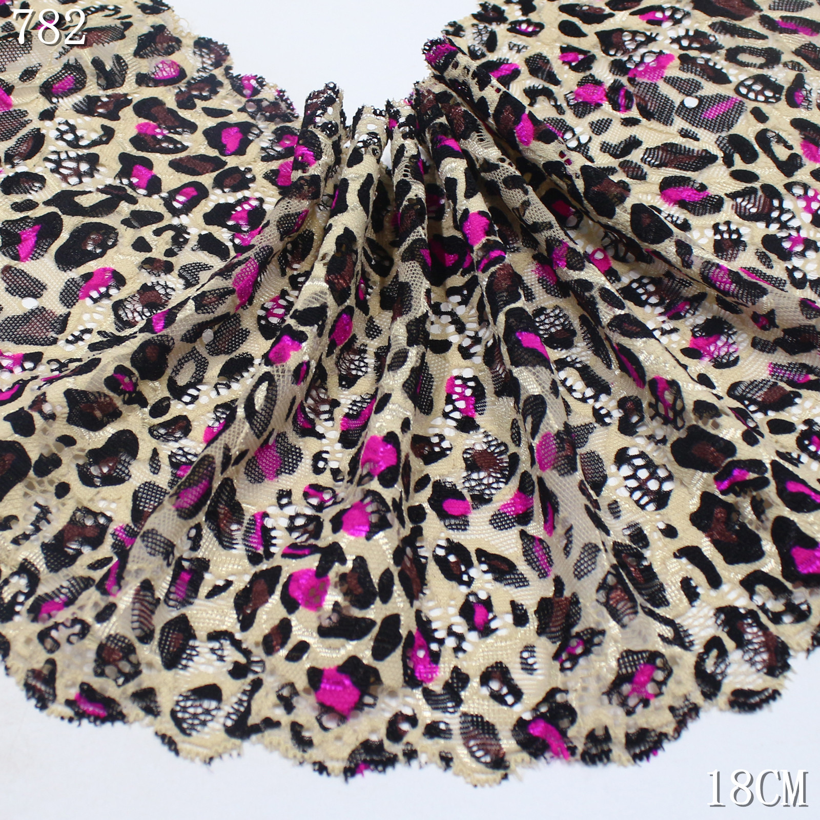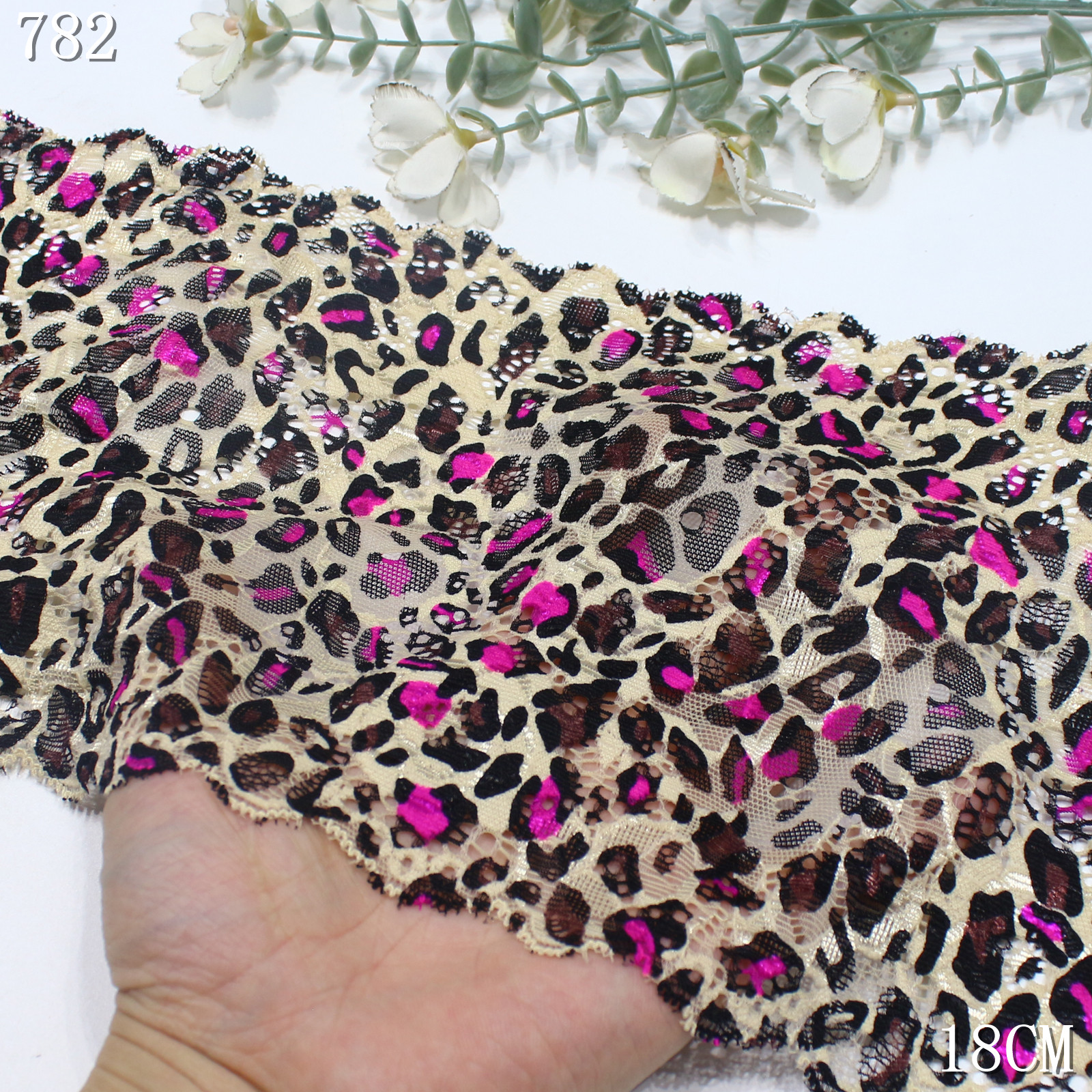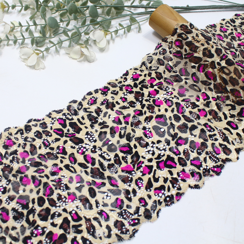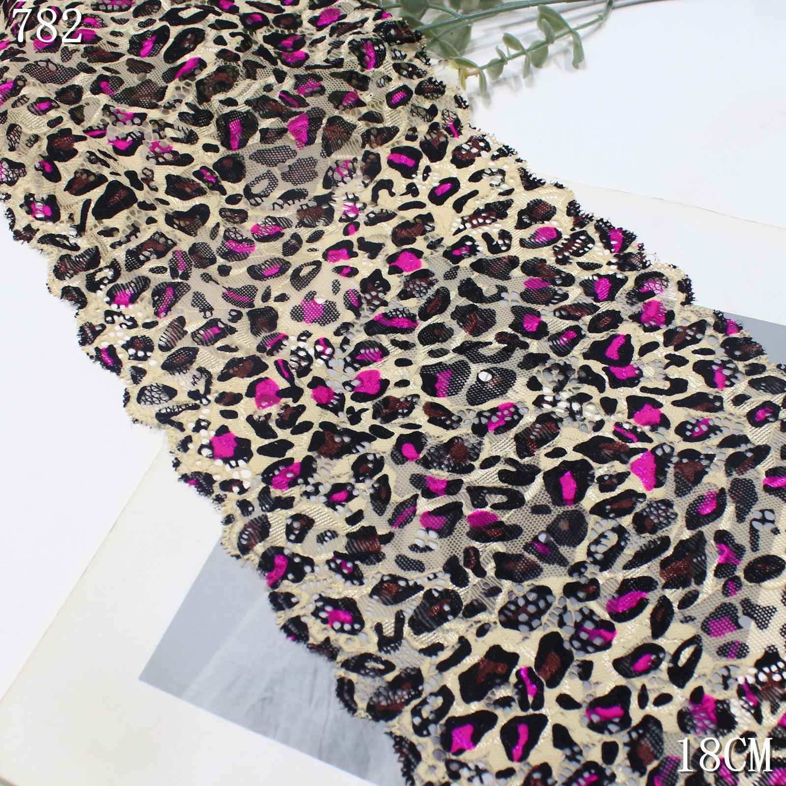 This leopard print stretch lace trim is made with a high-elastic lace base and features a width of 18 cm. The classic leopard pattern is presented in a striking combination of black, brown, and rose tones, creating a bold and fashionable visual effect.