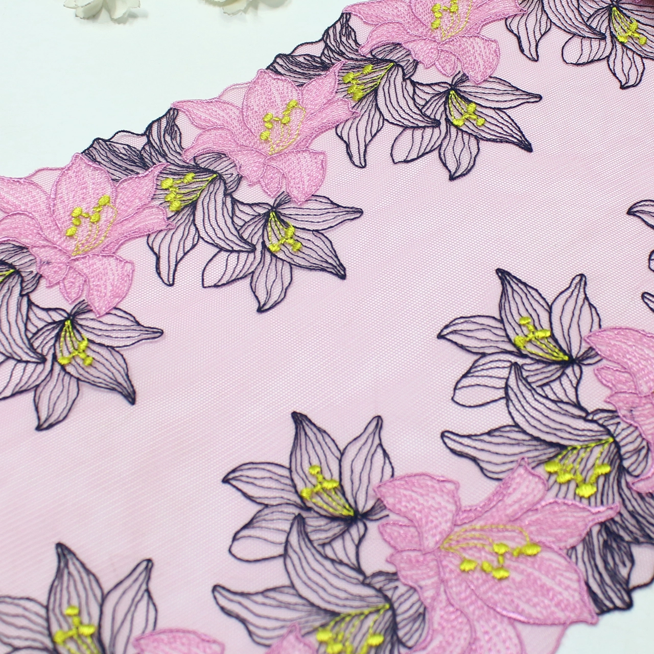 This embroidered lace trim features a two-tone lily design, combining soft pink petals with black outlined floral shapes for a striking contrast. The petals are detailed with fine textures, giving the flowers a rich and dimensional appearance.
