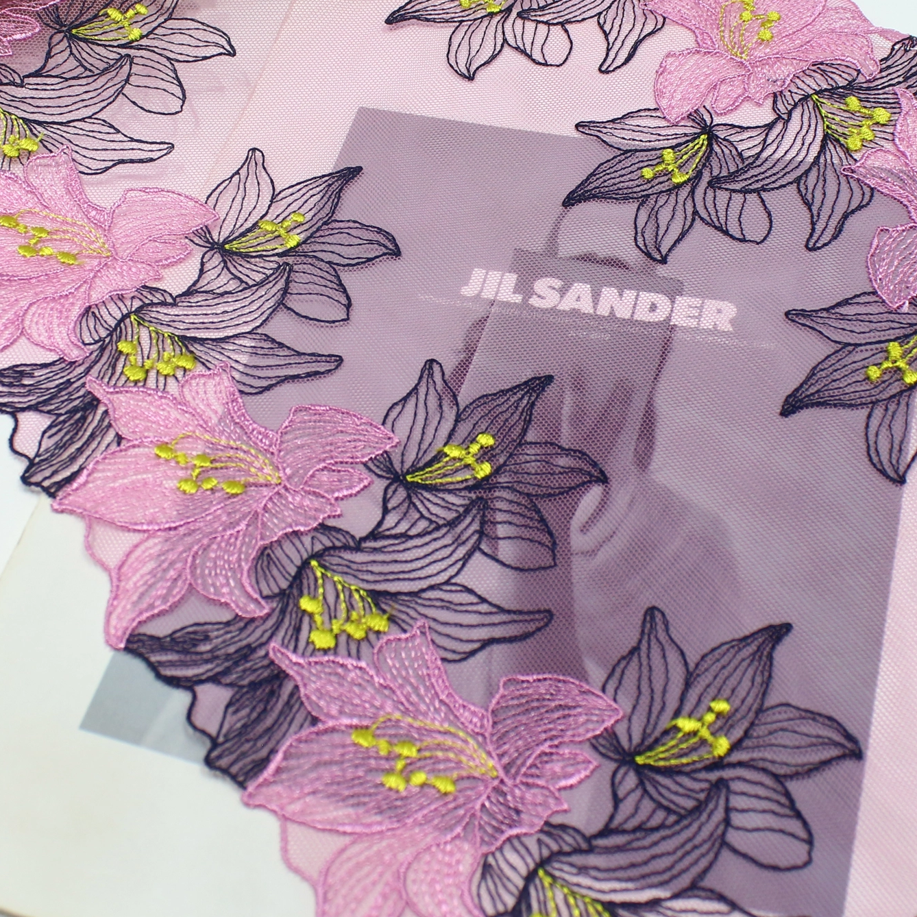 Elegant embroidered lace trim featuring two-tone lily motifs on a sheer purple tulle base. The combination of soft florals, bold outlines, and vibrant accents creates a refined and romantic look.