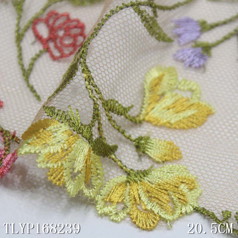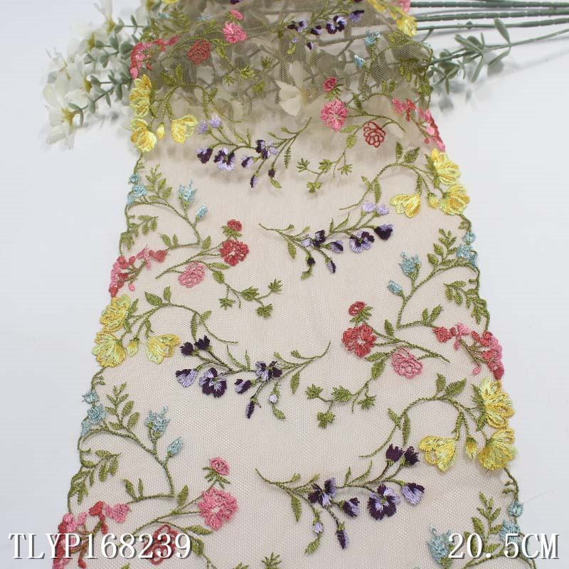 This lace features a nude mesh base decorated with multicolor floral embroidery in shades of purple, red, pink, blue, and yellow. Fresh green leaf motifs balance the vibrant tones, creating a harmonious and lively appearance.
