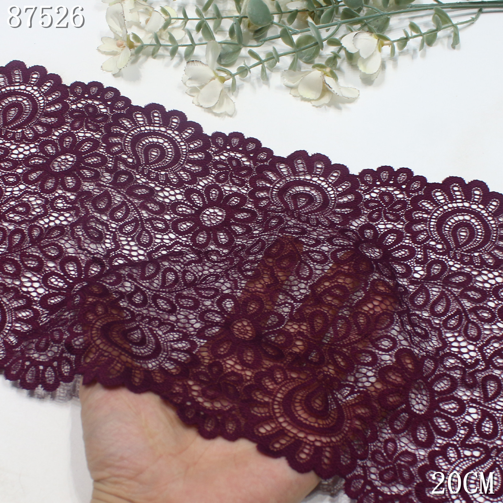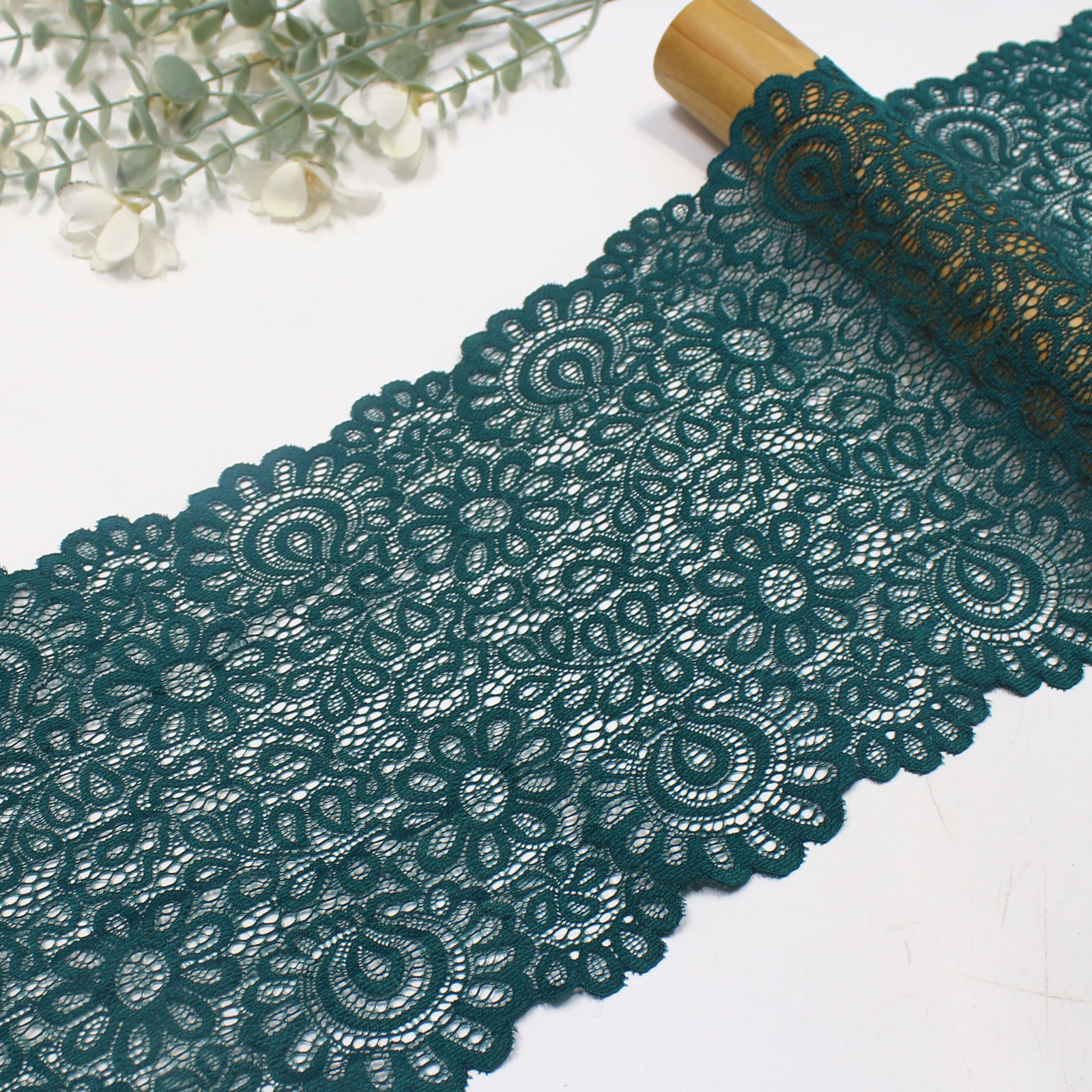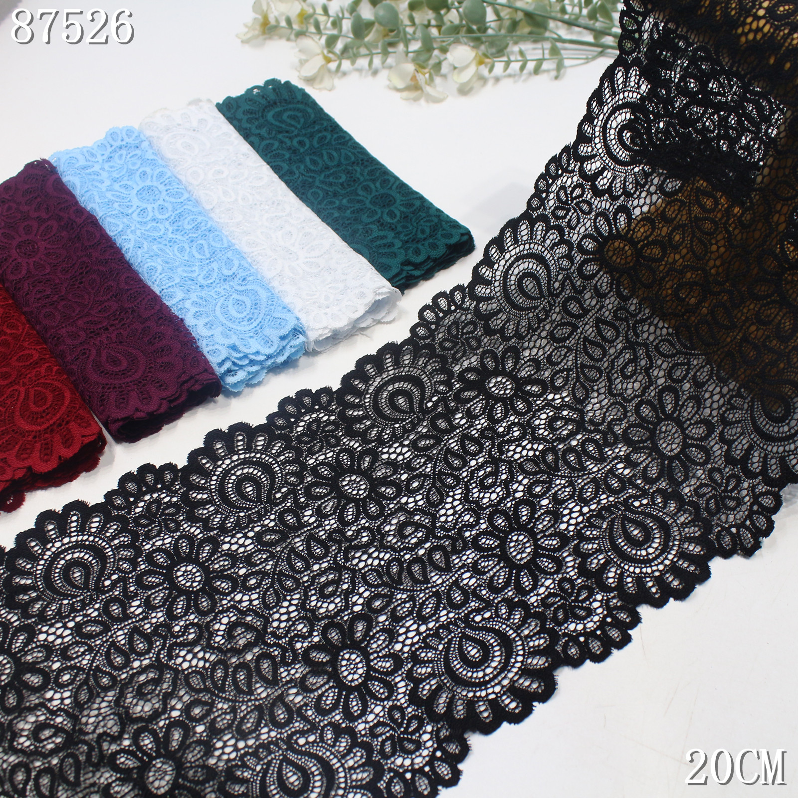 This stretch lace trim is crafted on a high-elastic lace base with a width of 20 cm and is available in six elegant colors: wine red, navy purple, light blue, off white, dark green, and black.