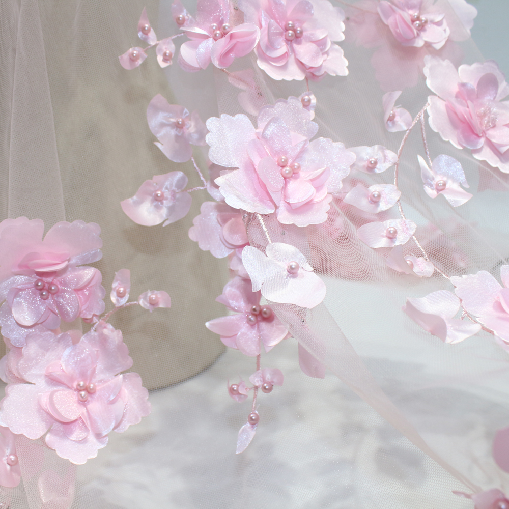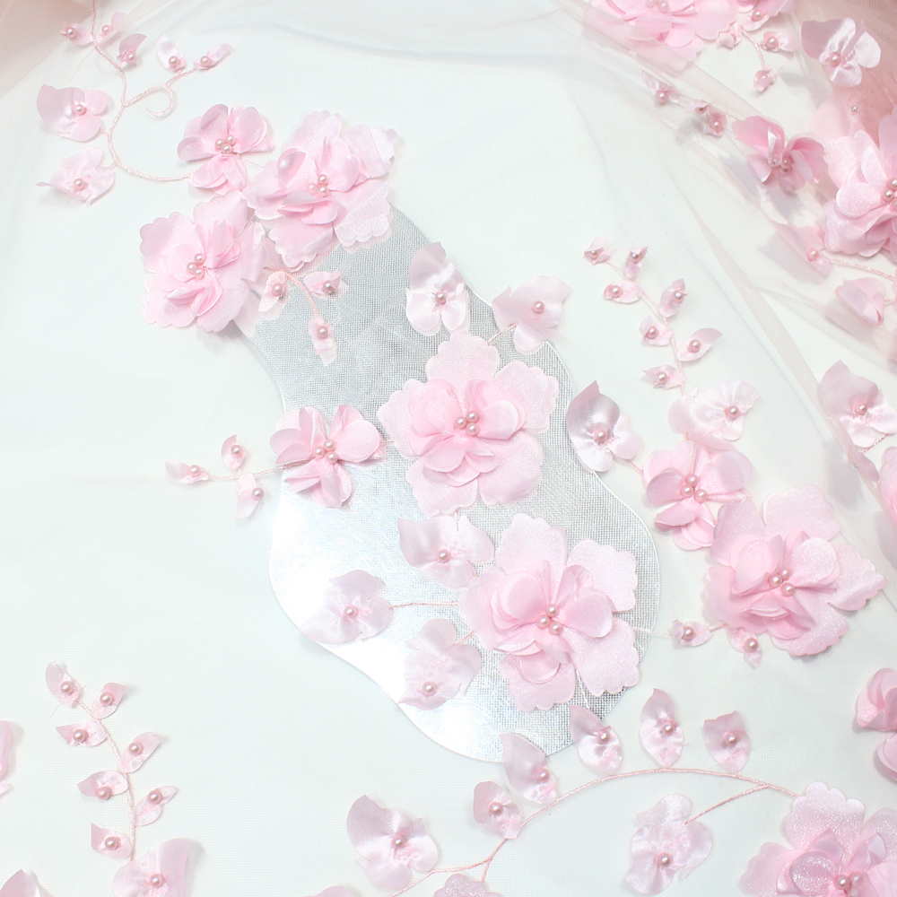 Crafted on a sheer pink mesh base, this embroidery lace offers a soft and airy foundation with a naturally romantic look. The raised 3D floral appliqués add depth and dimension, enhanced by satin-textured petals and subtle glitter highlights that catch the light gracefully. Soft pink pearls at the flower centers bring a refined, feminine detail.