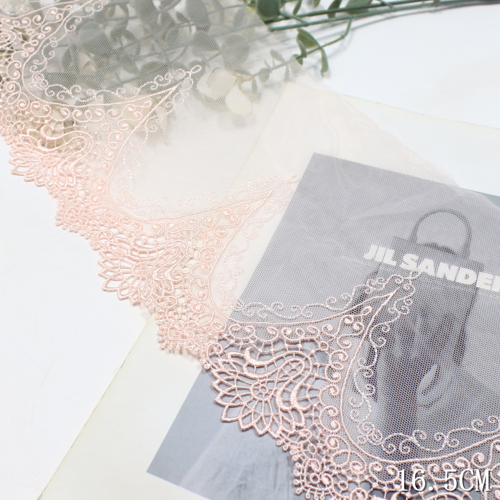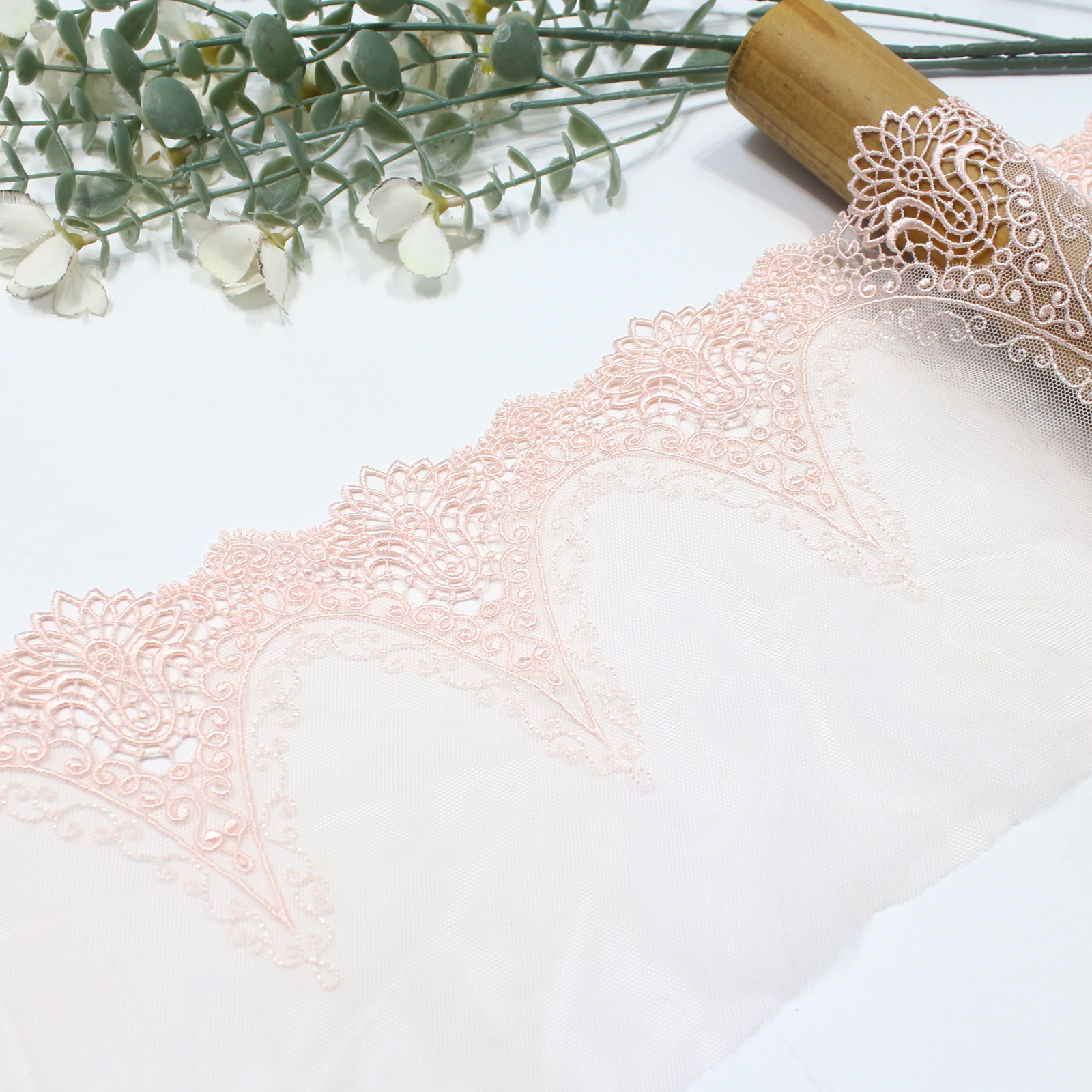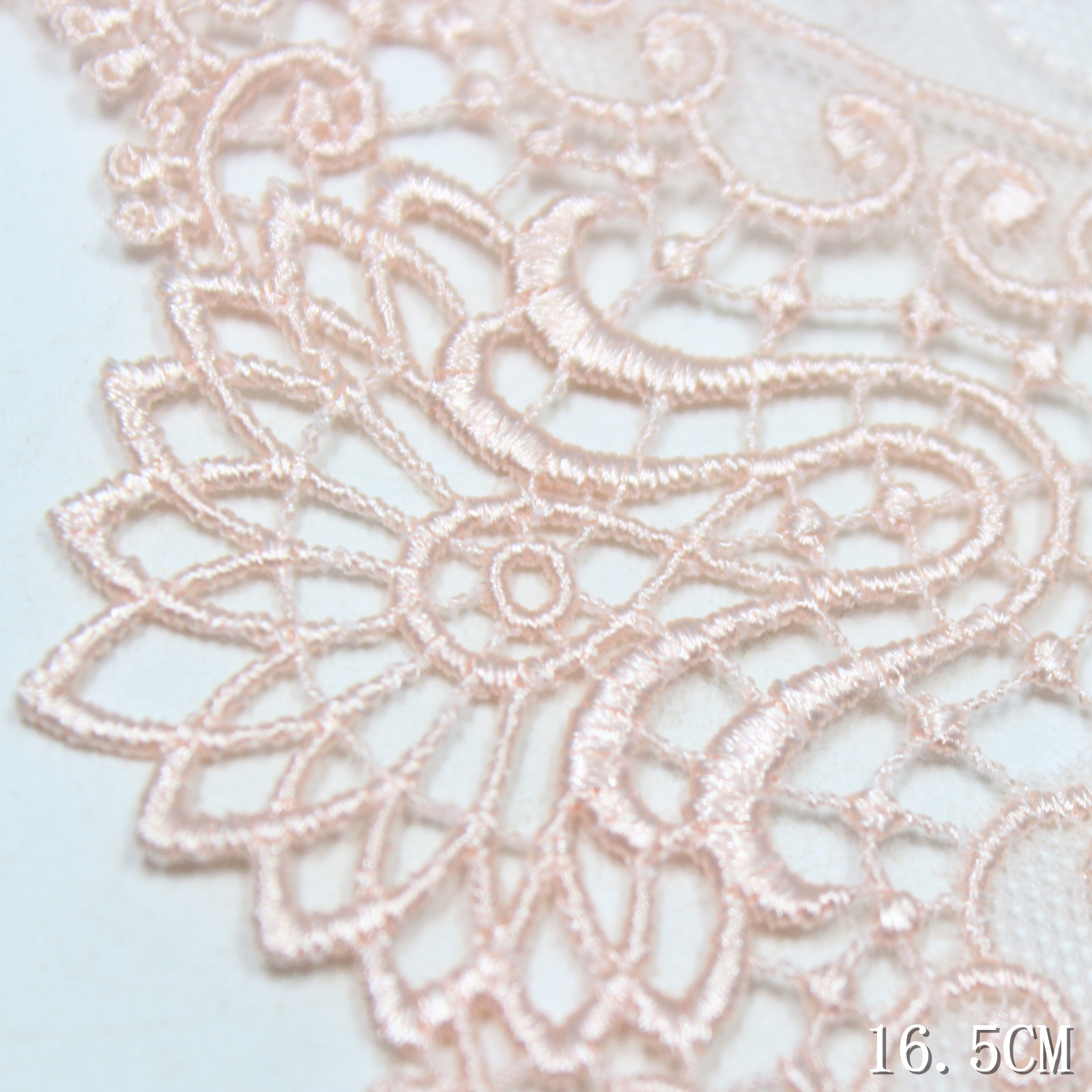 The embroidery is dense and refined, giving the lace a firm texture while maintaining a lightweight feel. The openwork areas are evenly distributed, enhancing breathability and visual clarity.