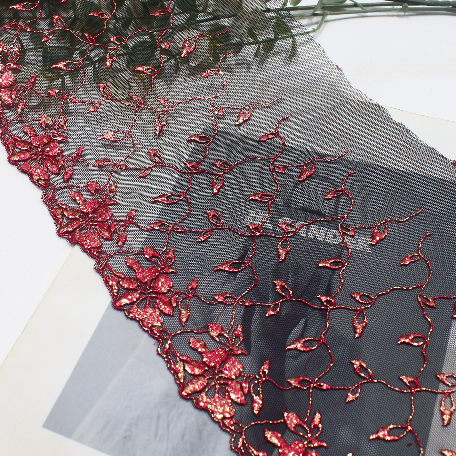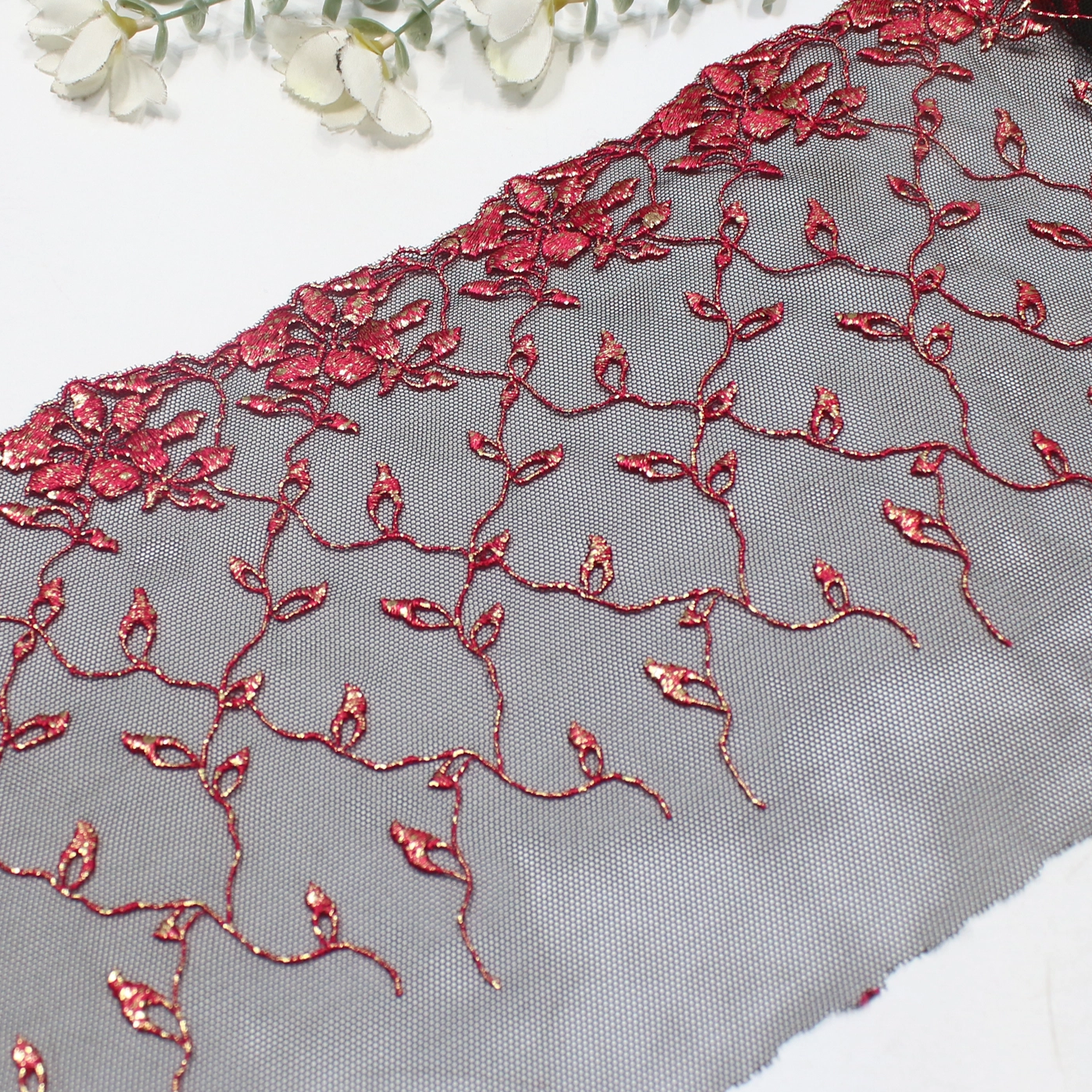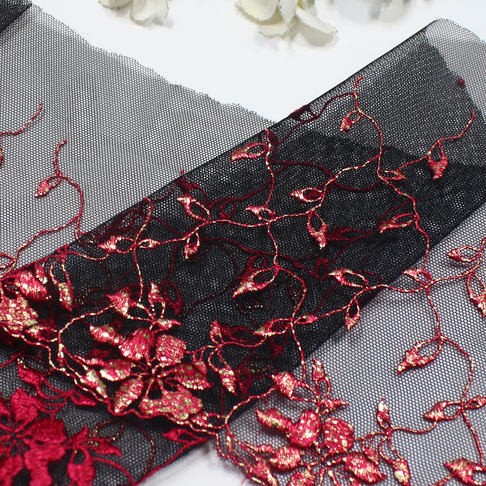 The deep black tulle base provides a sheer background, allowing the red embroidery and gold foil details to stand out with depth and contrast. The raw-edge finish gives the lace a light, airy outline while maintaining a refined and flexible structure.