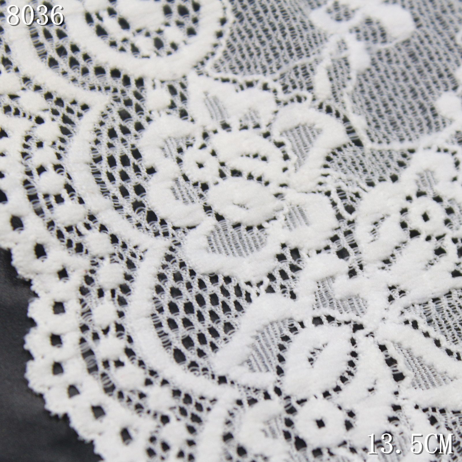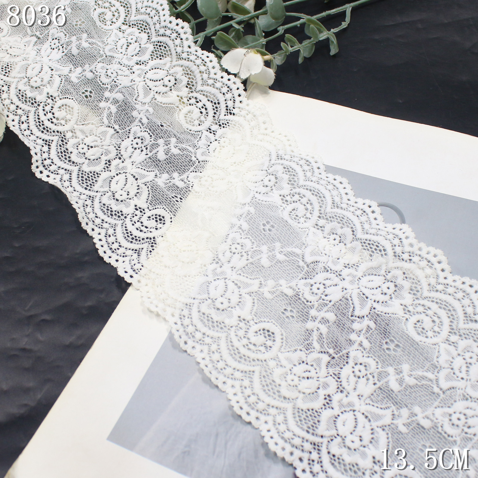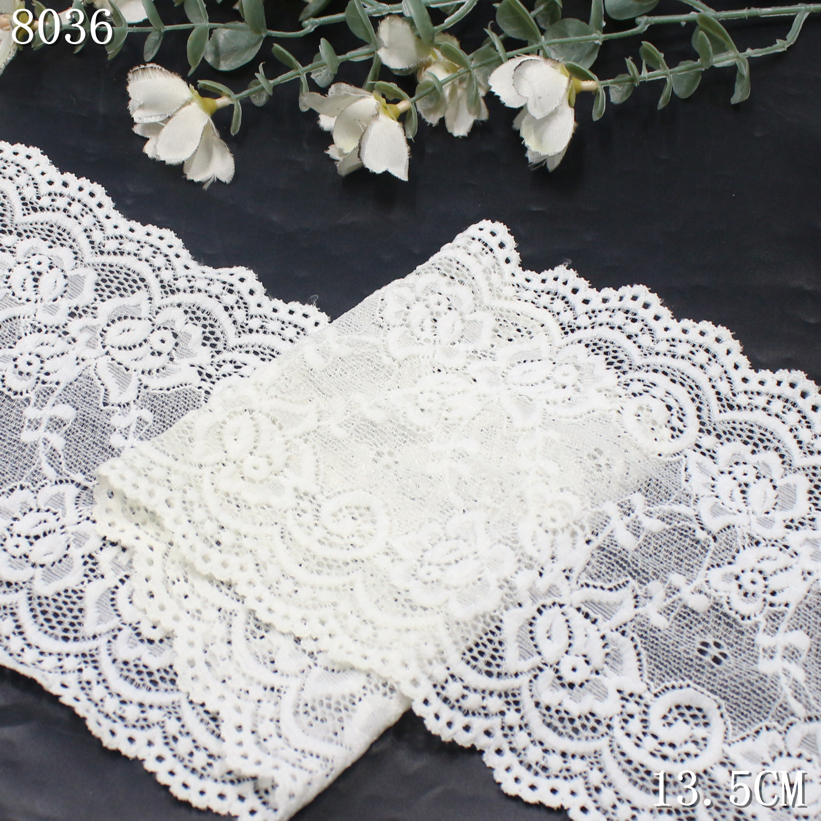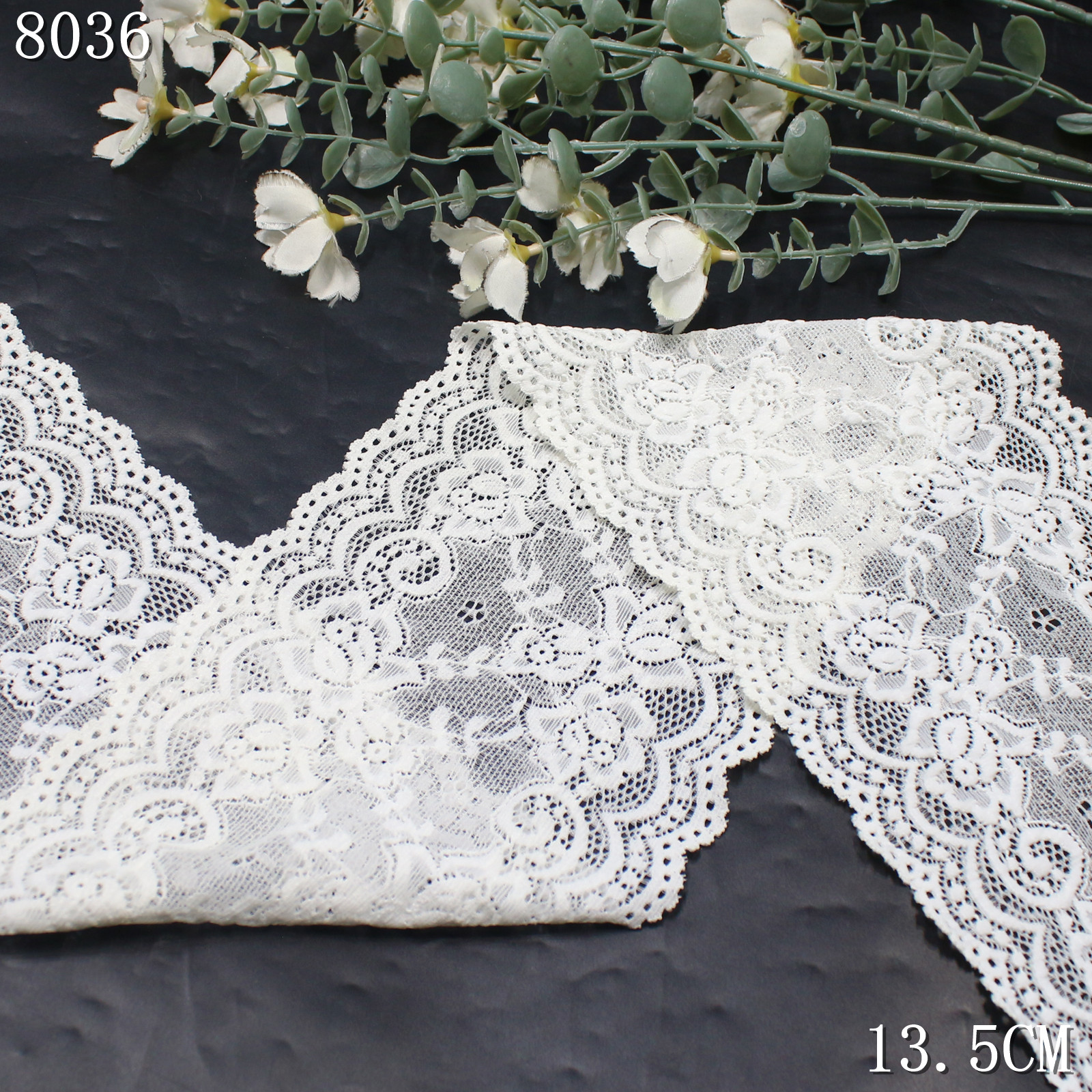 The lace is constructed on a fine elastic mesh base that provides breathability and flexibility while maintaining a light and airy appearance. A scalloped wave edge enhances the decorative outline and gives the lace a refined finish.