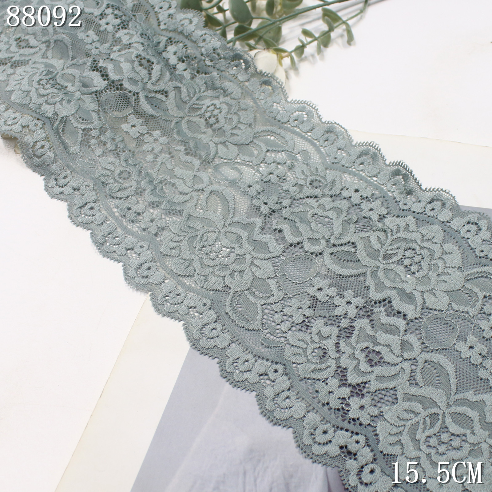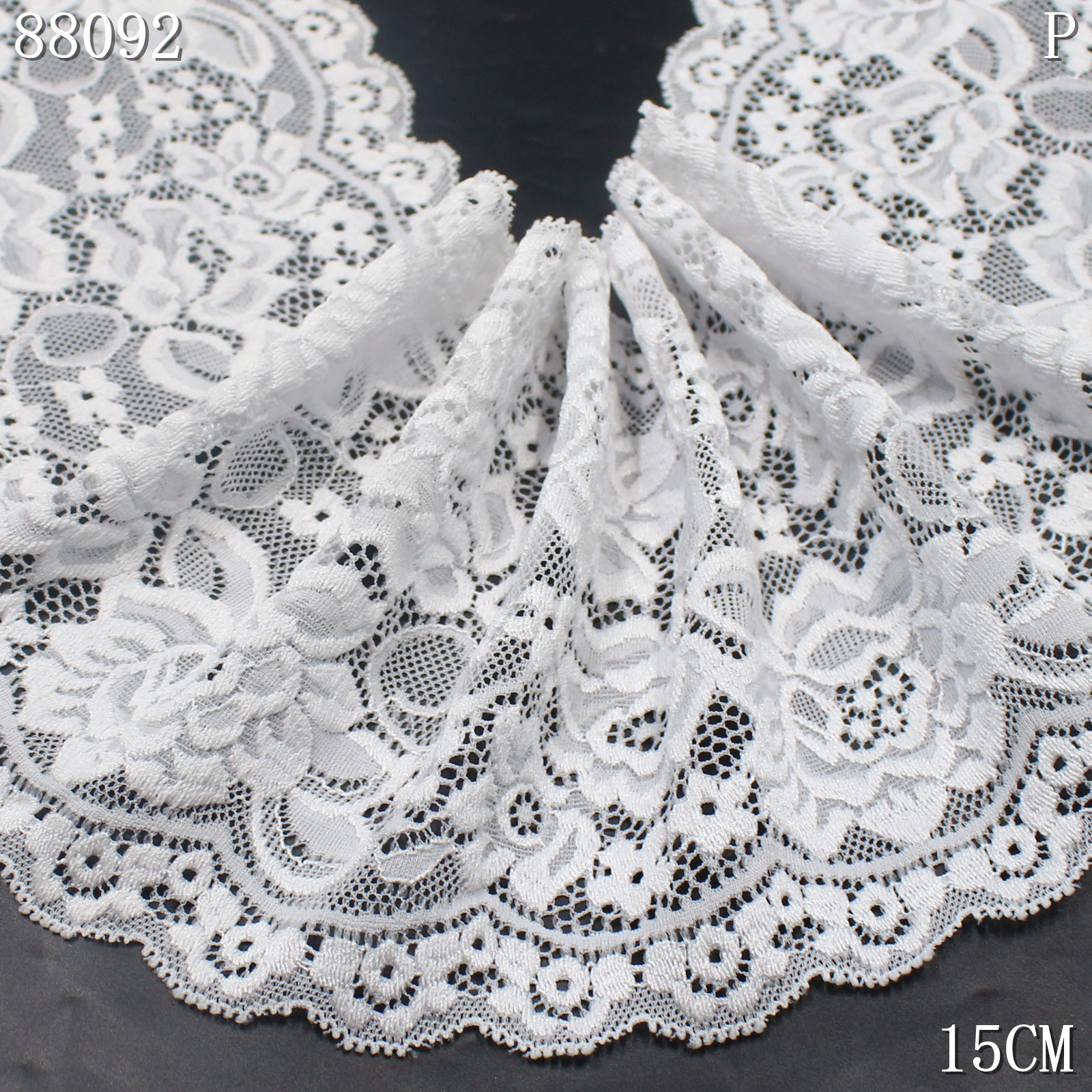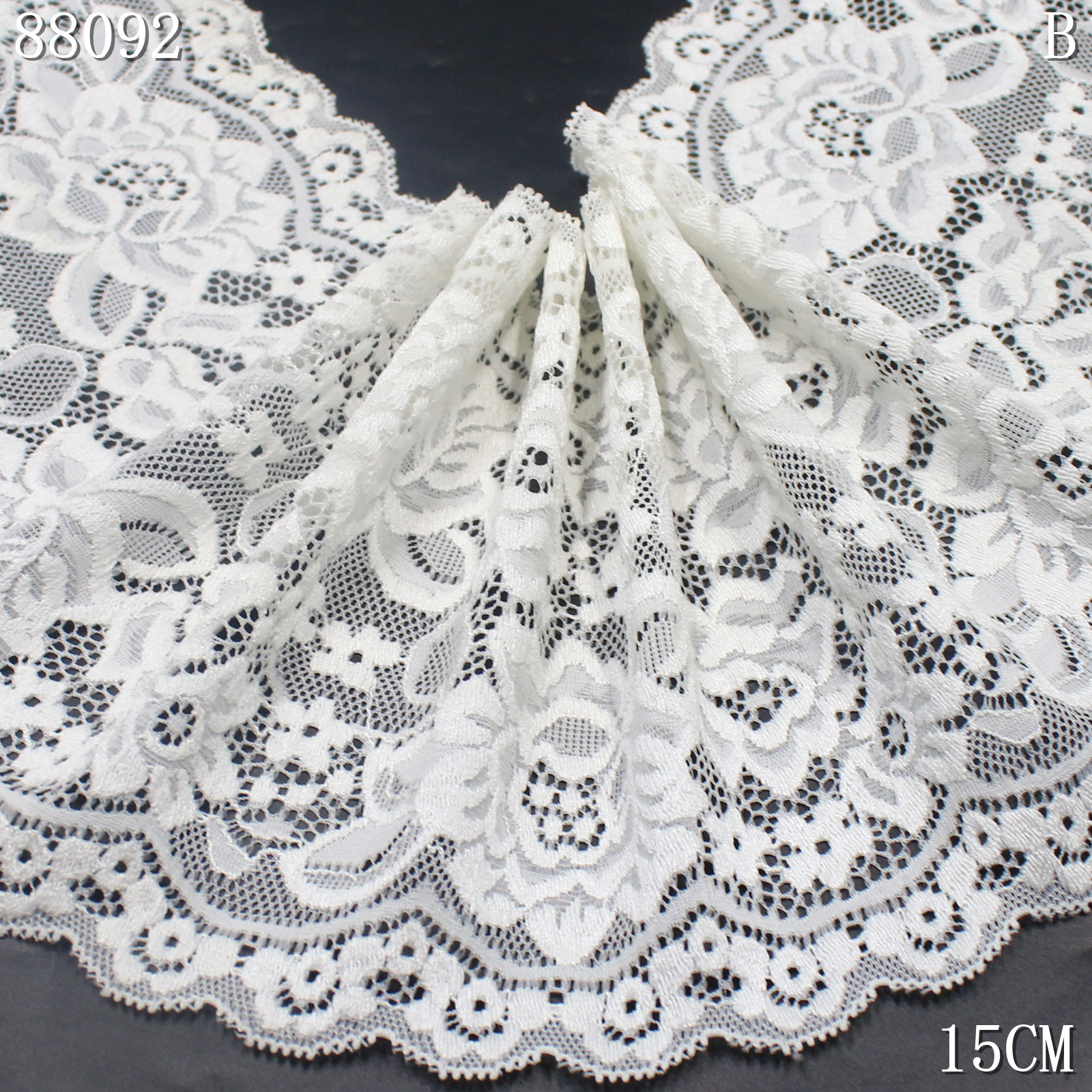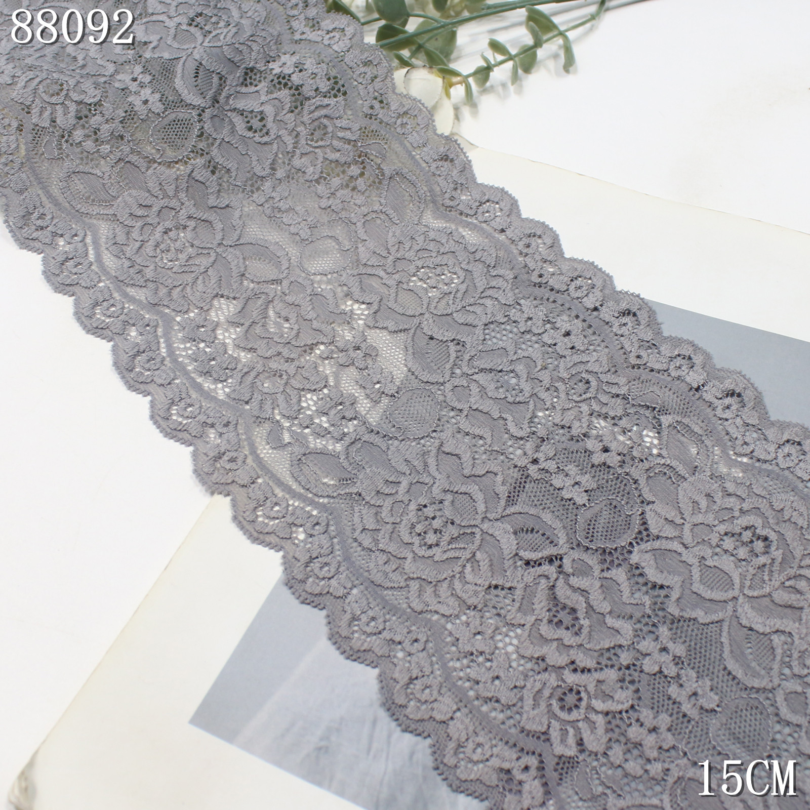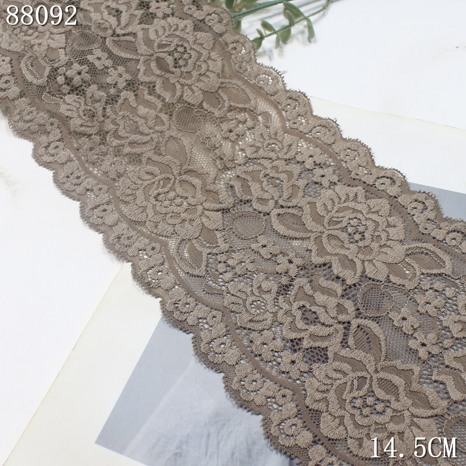 This elegant stretch lace trim is crafted on a high-elastic lace base and is available in six sophisticated colors. The lace width ranges from 14.5 cm to 15.5 cm depending on the color variation.