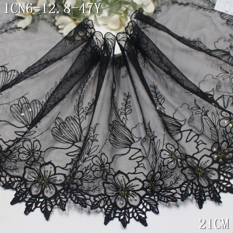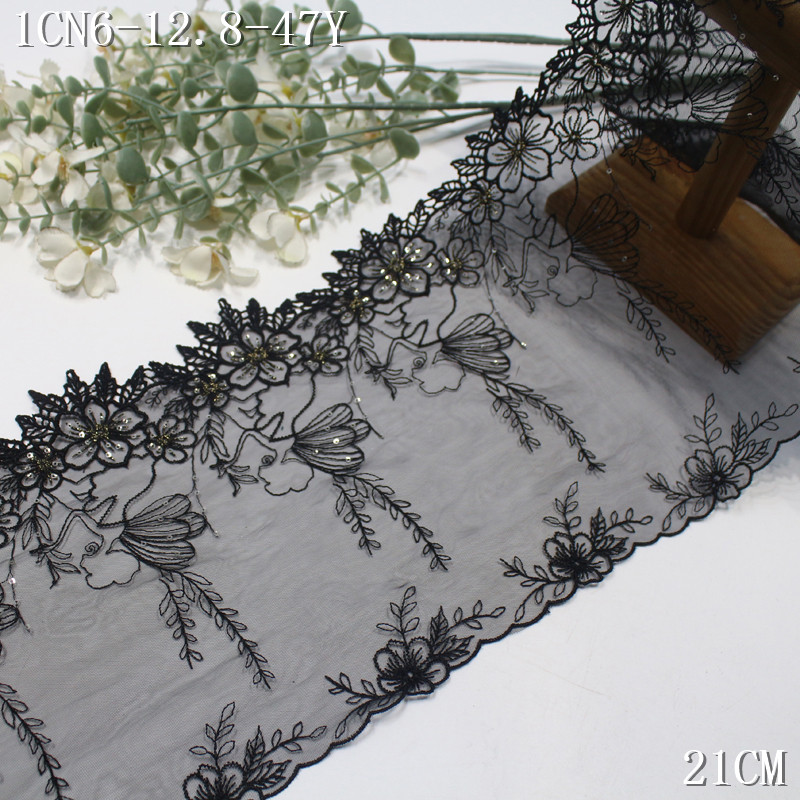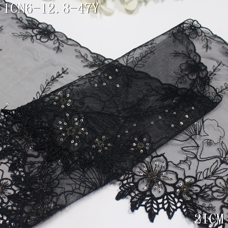 This lace trim is crafted with water-soluble embroidery technique, forming refined floral motifs that appear light and dimensional. The black mesh base enhances the contrast of the embroidery, while sequin embellishments add a gentle shimmer under light.