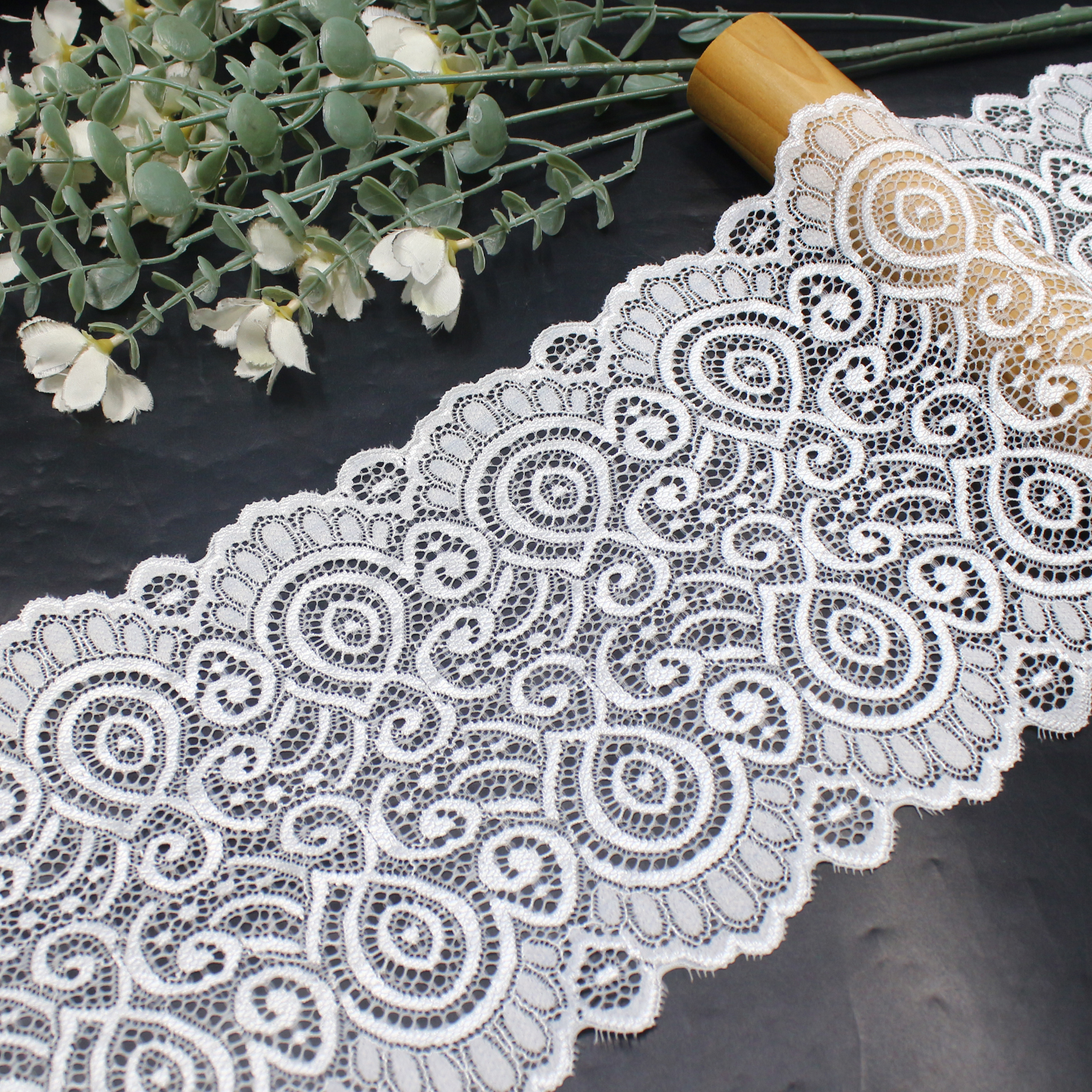 Vintage-inspired stretch lace trim featuring spiral motifs and geometric leaf patterns. Designed with a soft elastic base and scalloped edges, ideal for both fashion and bulk manufacturing use.