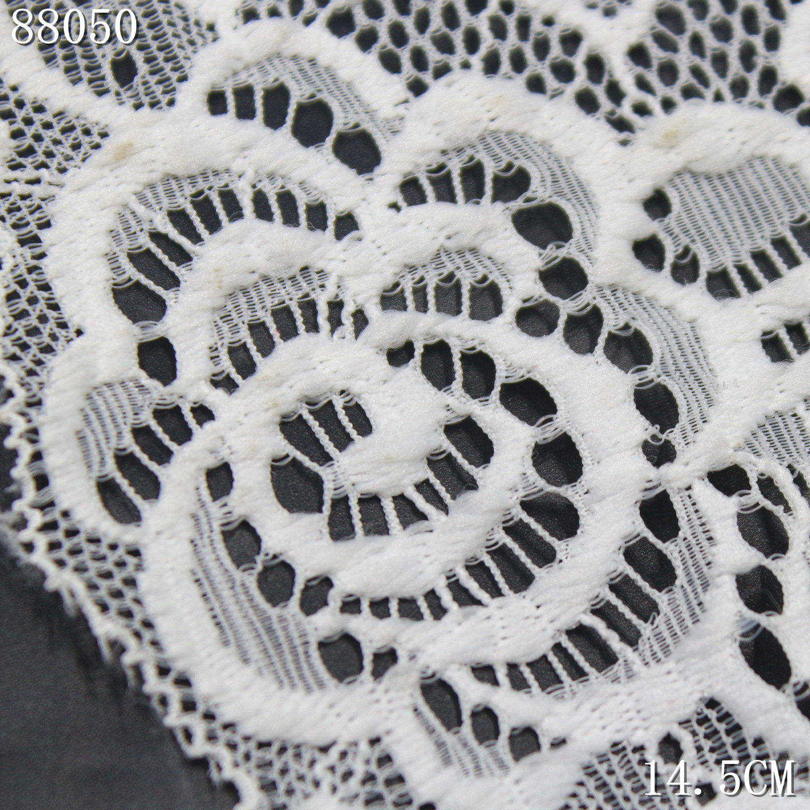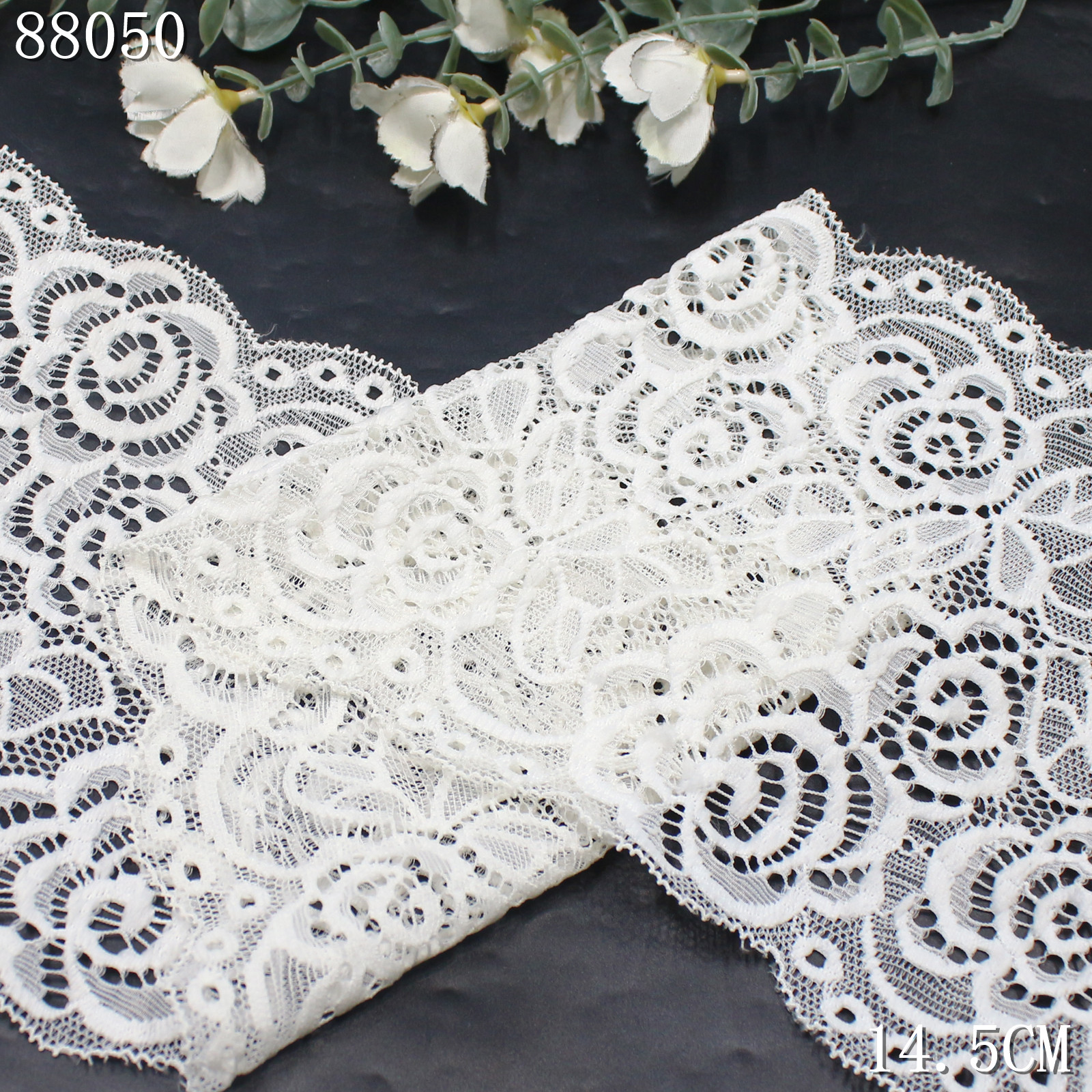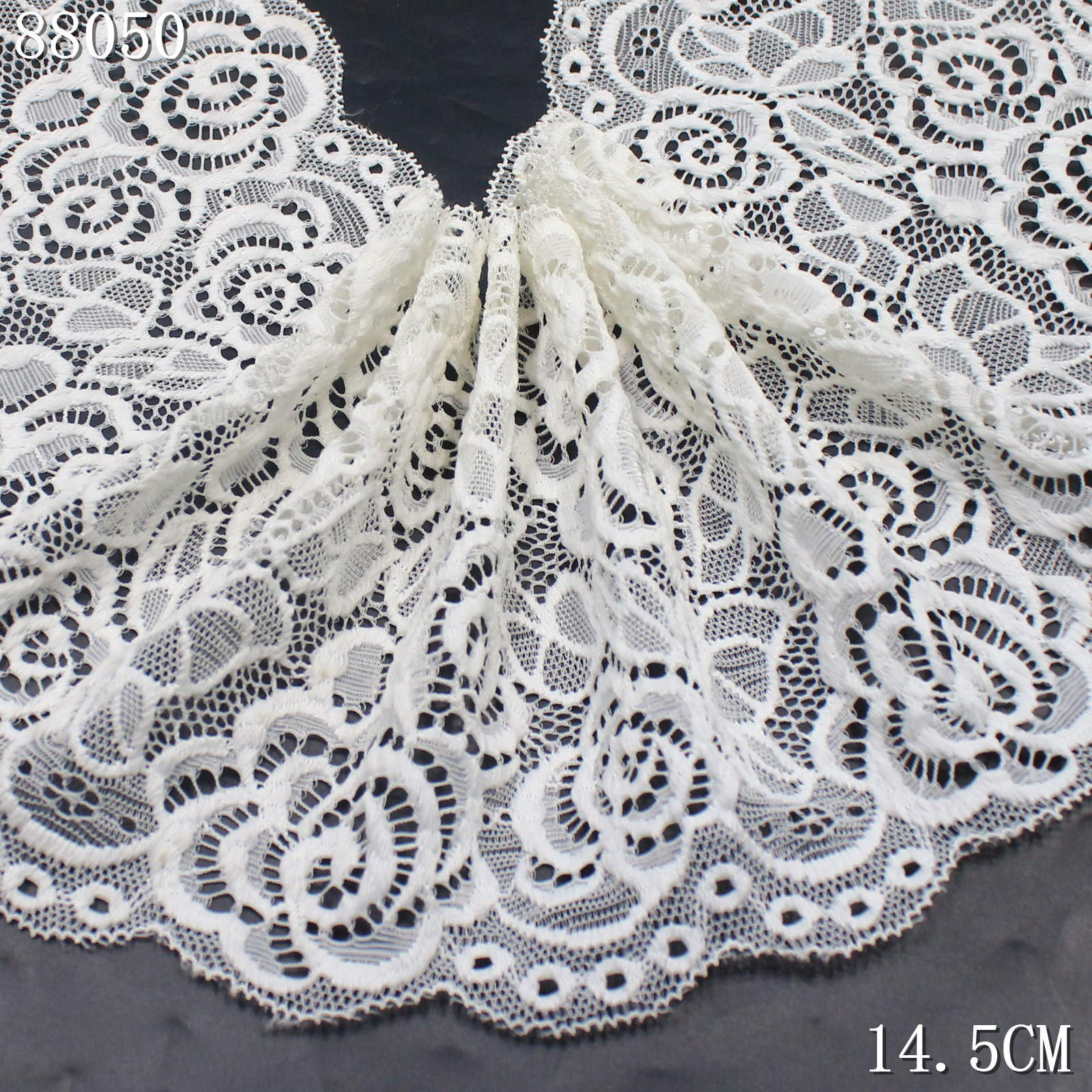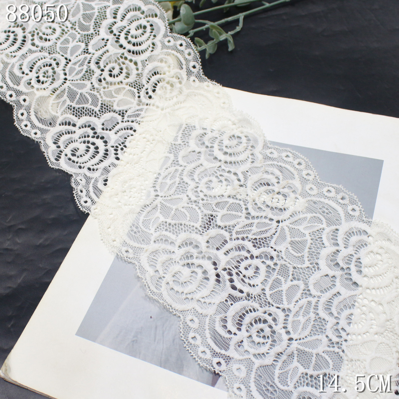 With a width of 14.5 cm, the lace maintains a balanced and flowing pattern layout, making it ideal for both subtle decoration and statement details.