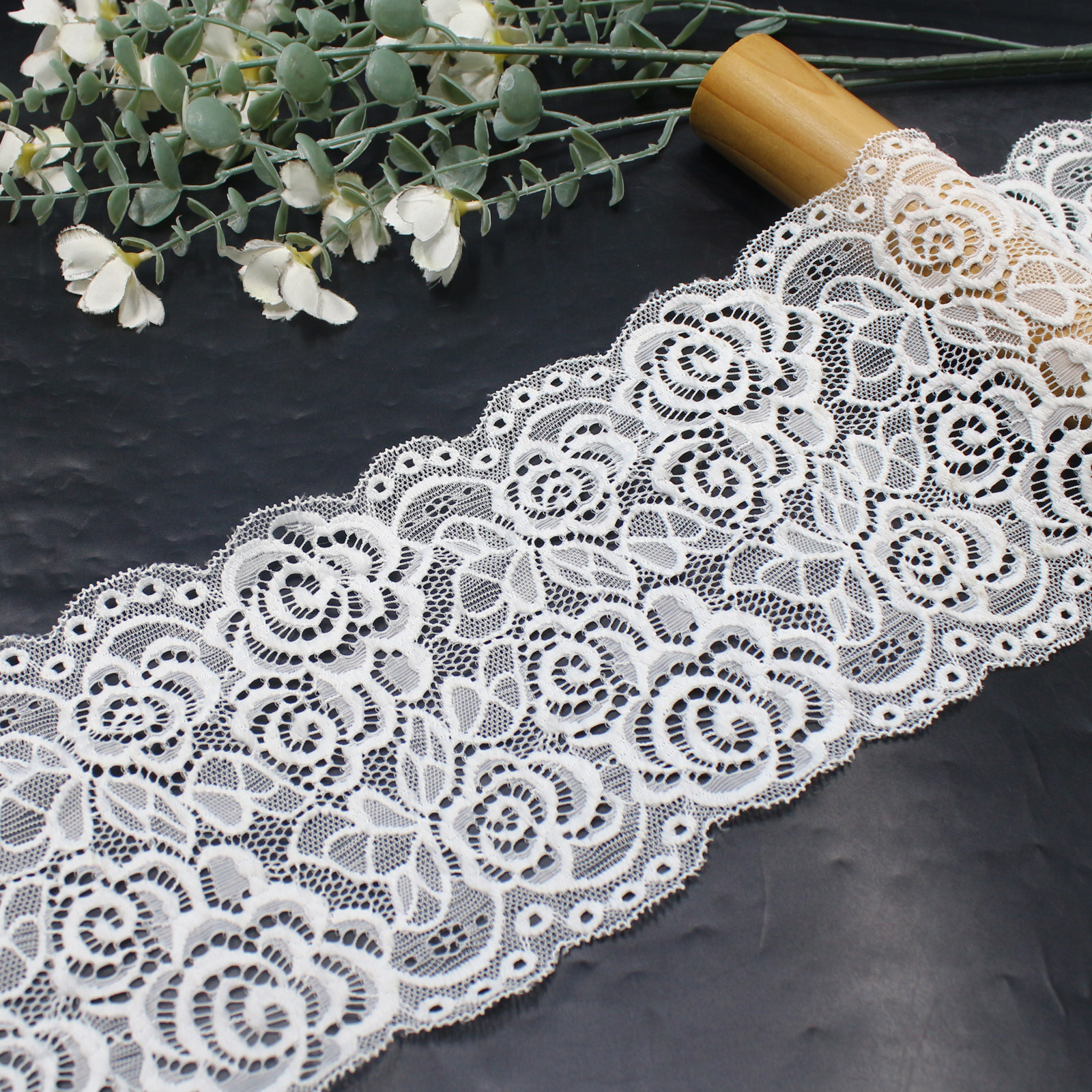 This stretch lace trim features elegant spiral rose motifs with layered petals that create a full and refined floral texture. The delicate rose pattern is complemented by fine leaf-shaped openwork details, adding depth and decorative sophistication.