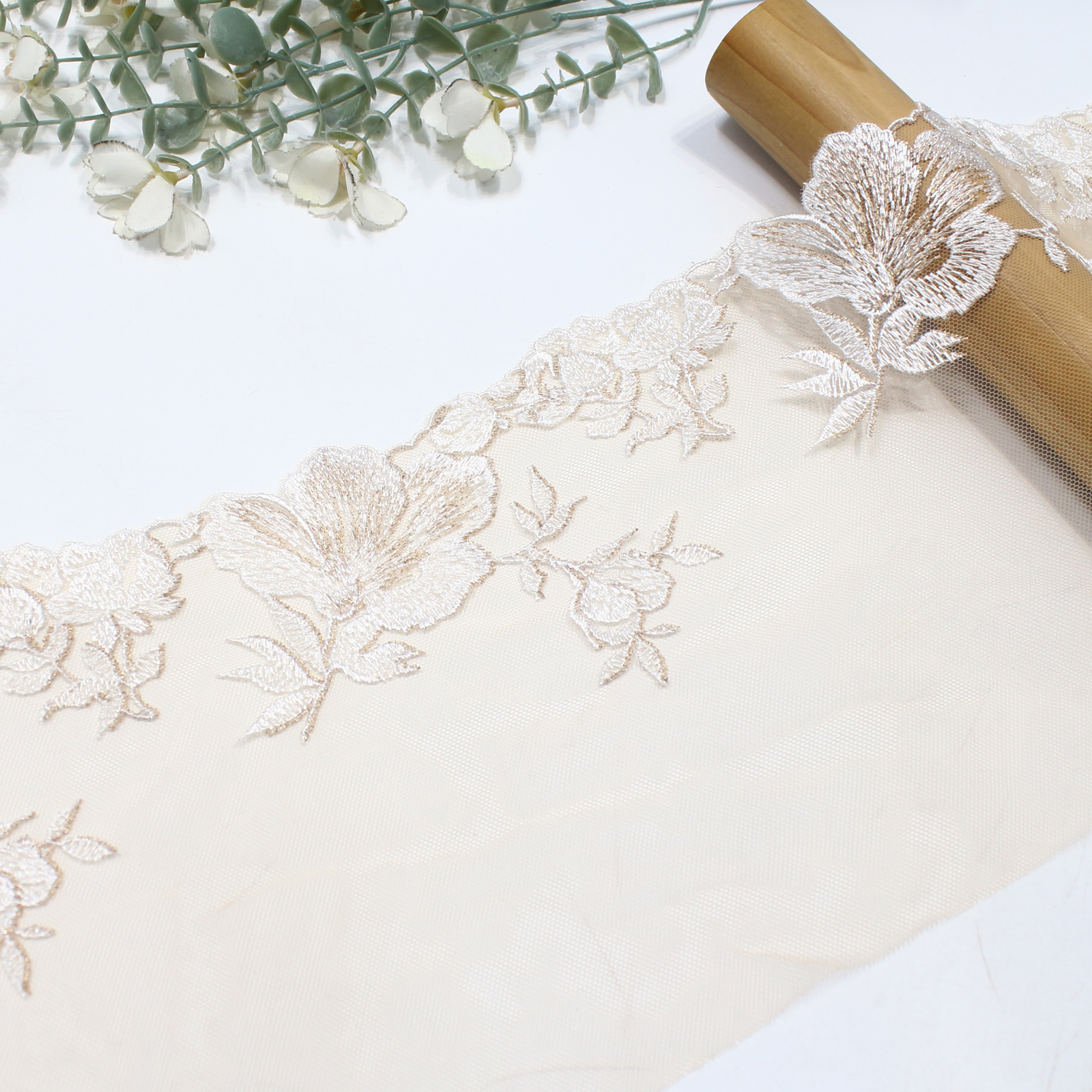 Refined embroidered lace trim featuring large white floral motifs with subtle gold metallic accents on a soft nude tulle base. The delicate shimmer and soft contrast create an elegant and sophisticated aesthetic.